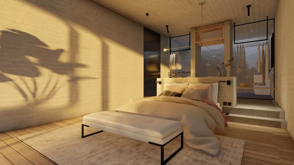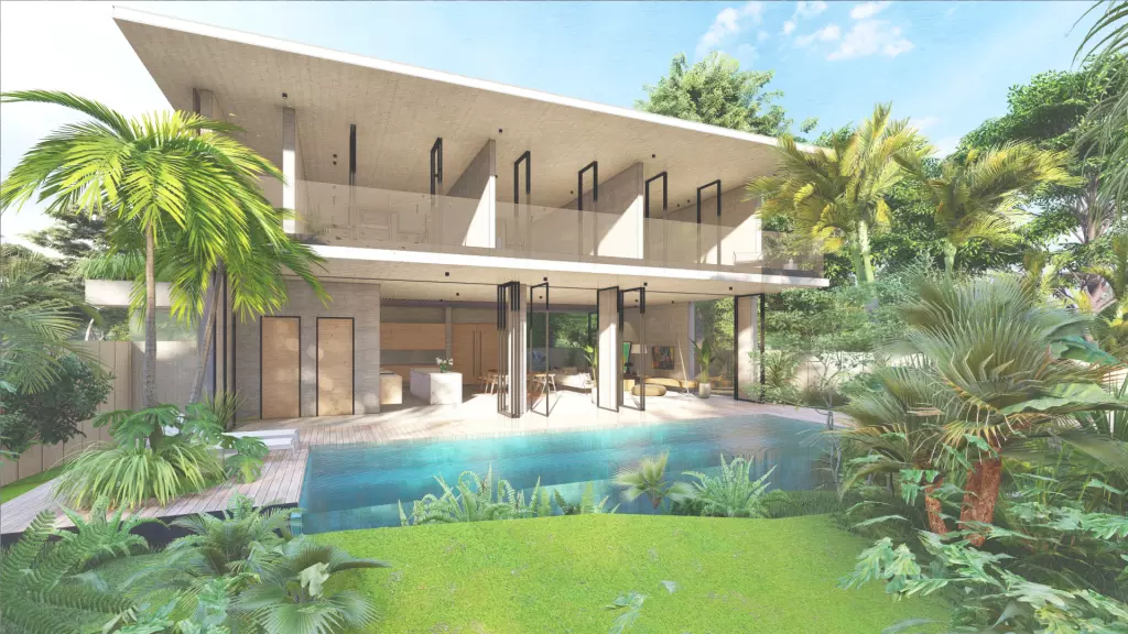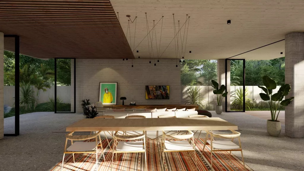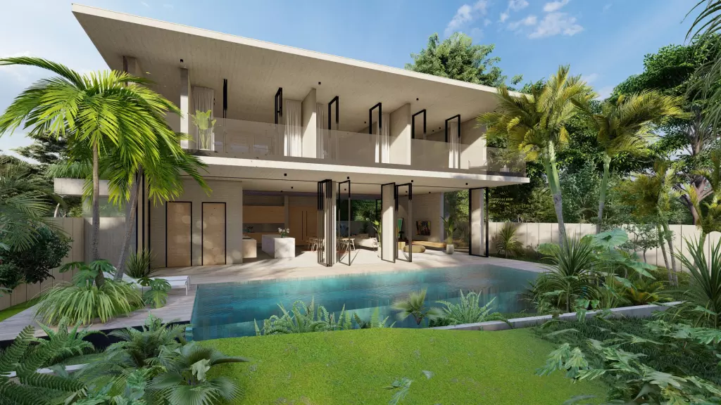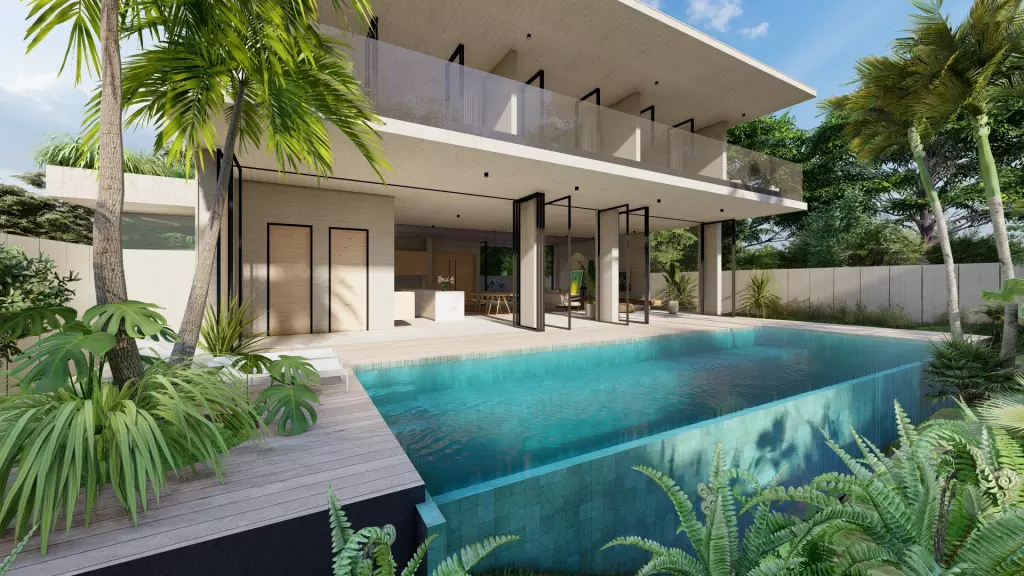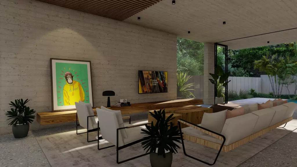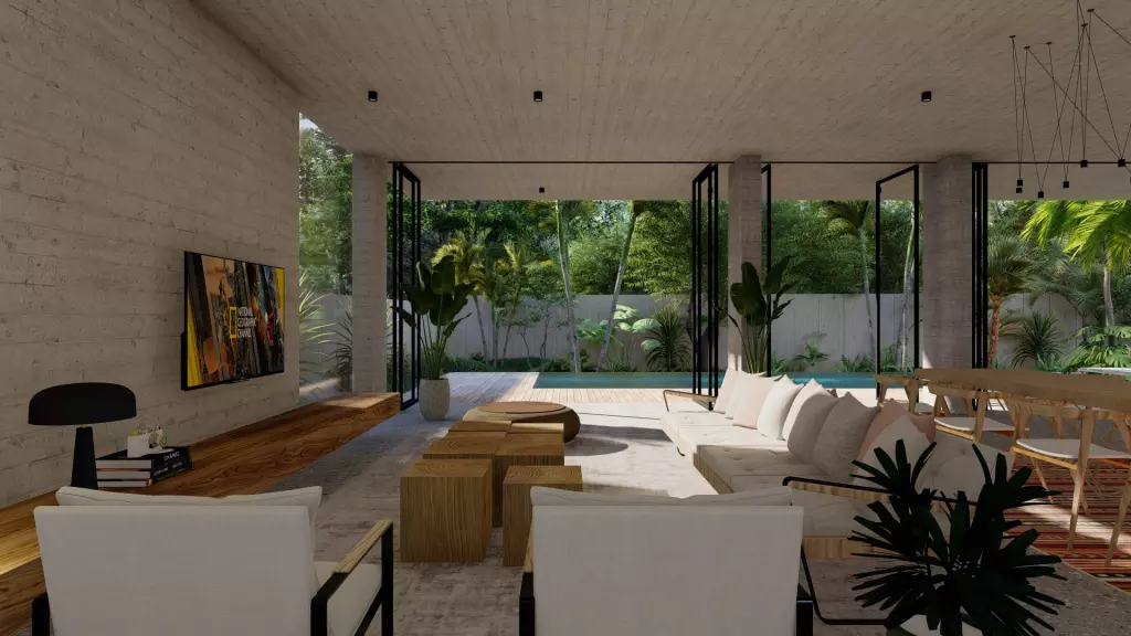 The villa features three bedrooms and four bathrooms, an enclosed living room, which provides a cozy and private atmosphere for relaxing or entertaining. The living room is decorated with tropical hard woods and exposed concrete walls, giving it a unique blend of modern and natural aesthetics.