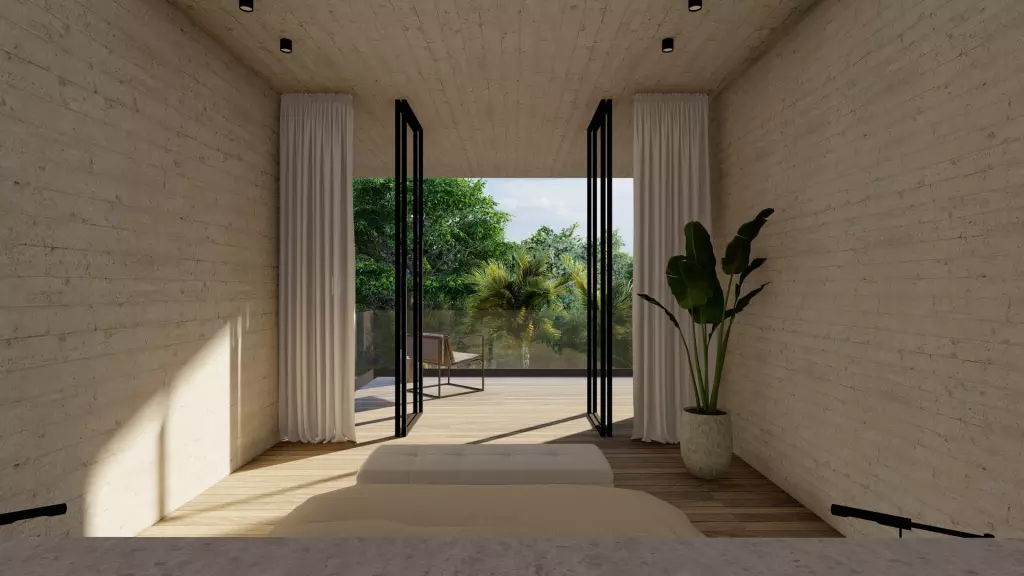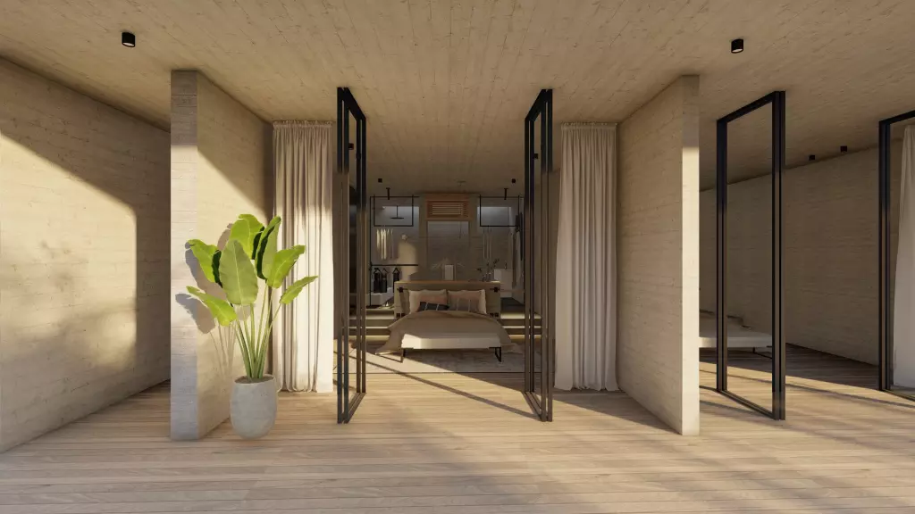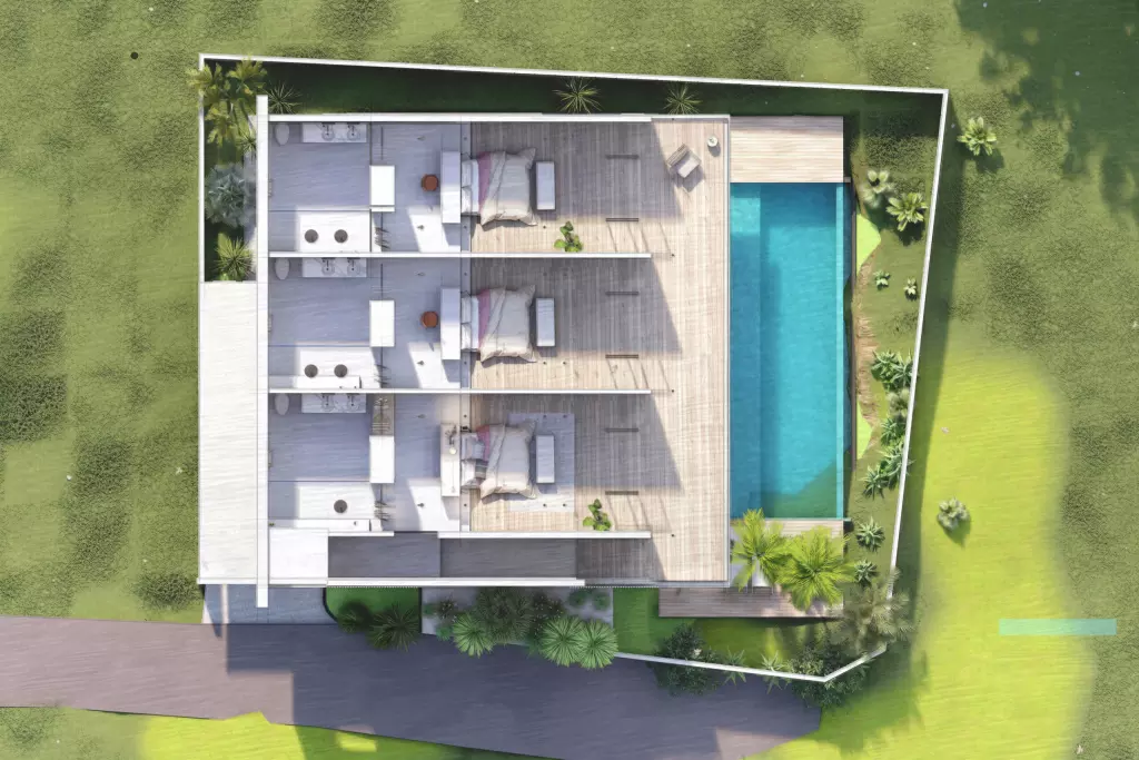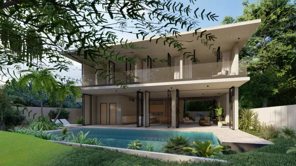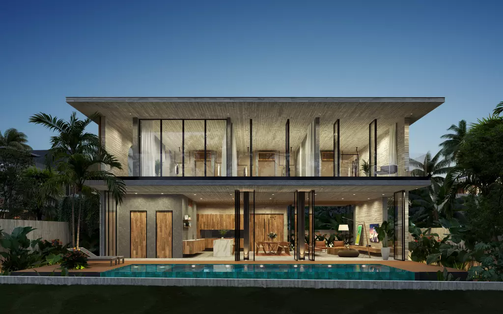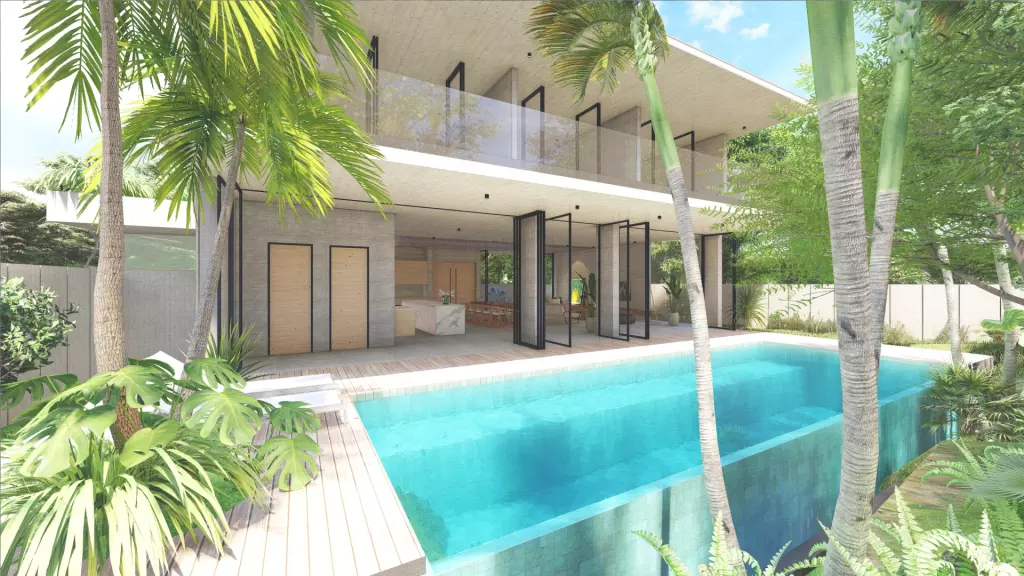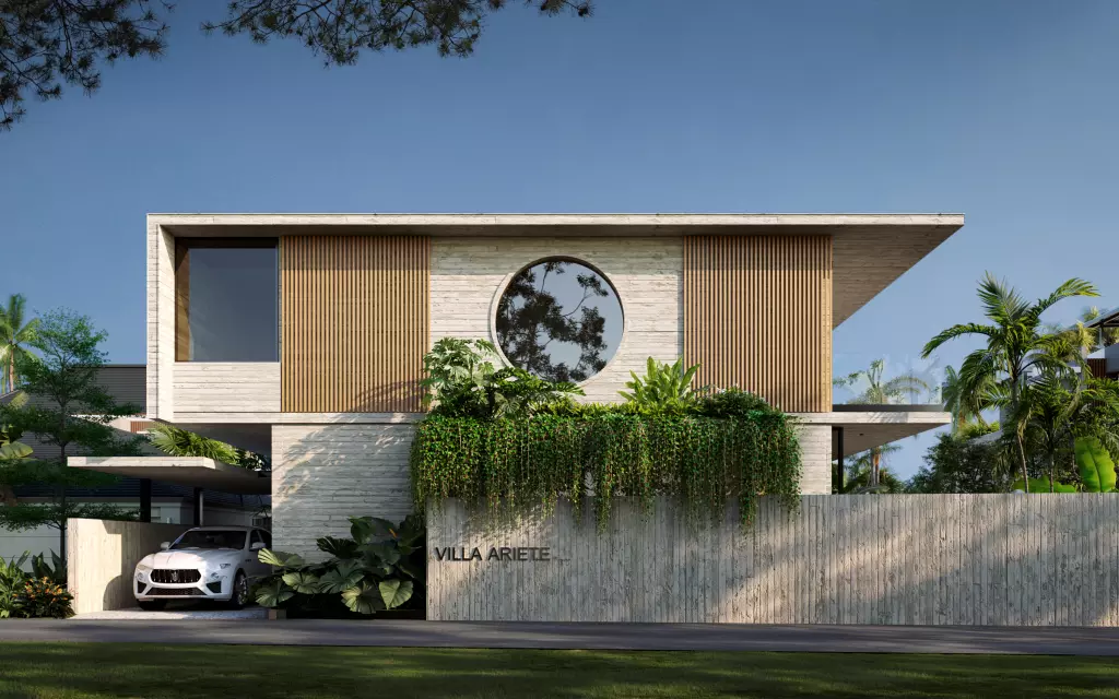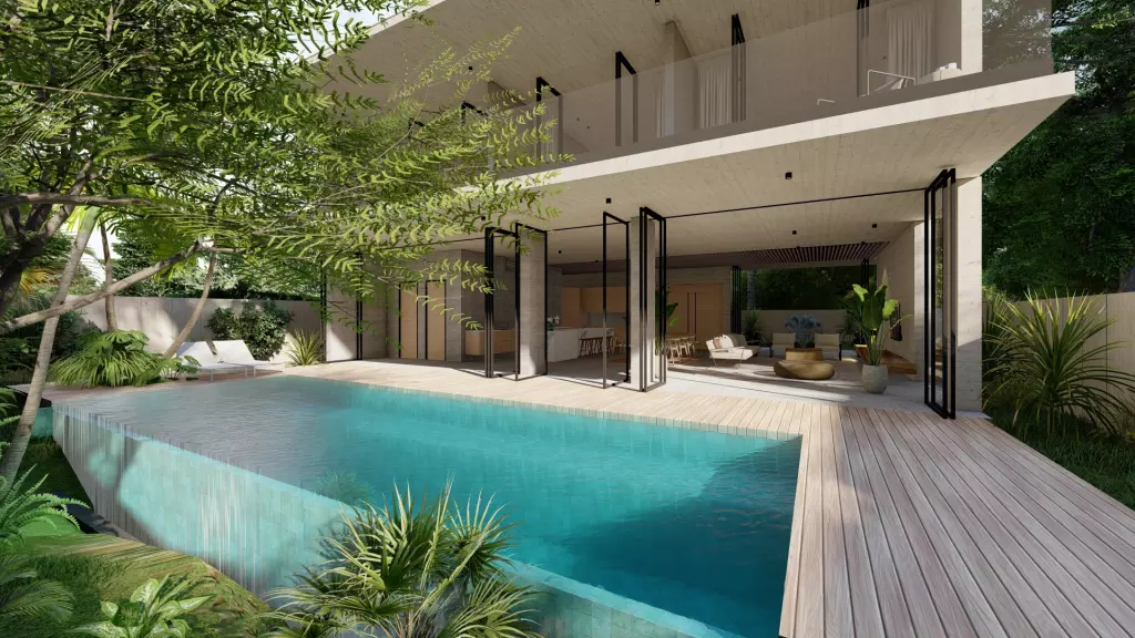 The villa features three bedrooms and four bathrooms, an enclosed living room, which provides a cozy and private atmosphere for relaxing or entertaining. The living room is decorated with tropical hard woods and exposed concrete walls, giving it a unique blend of modern and natural aesthetics.