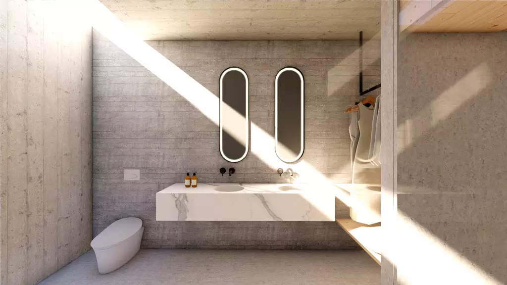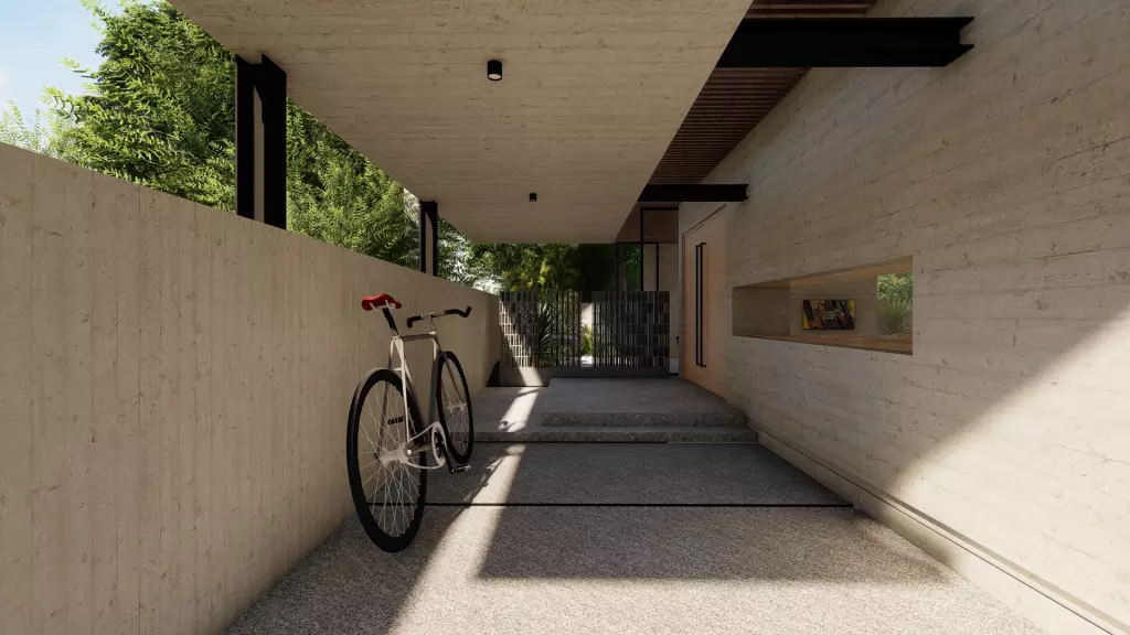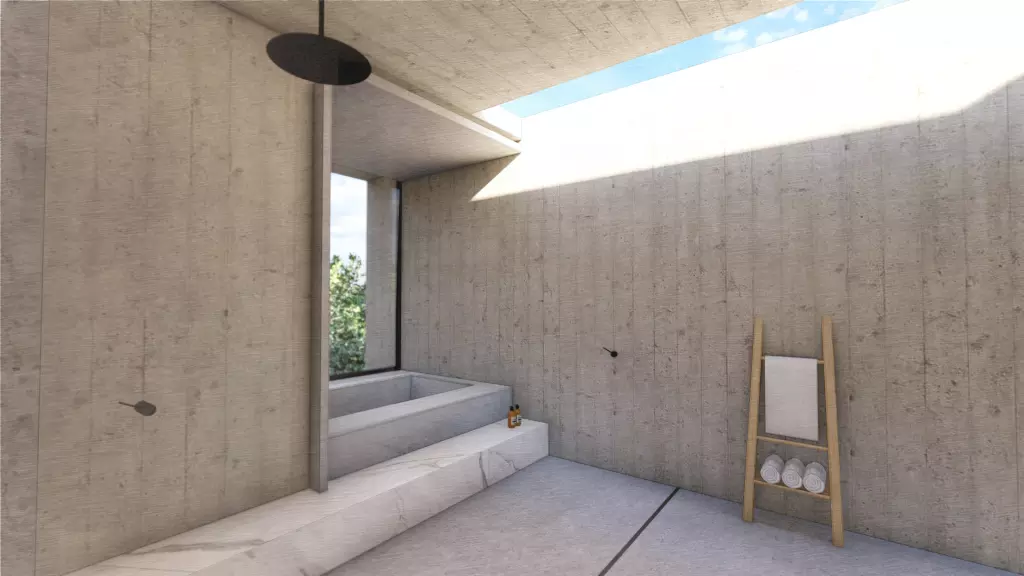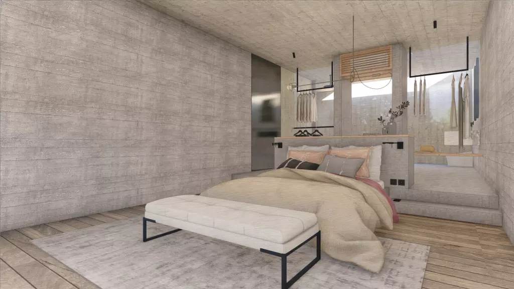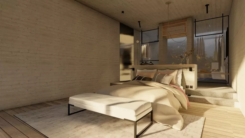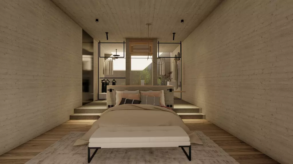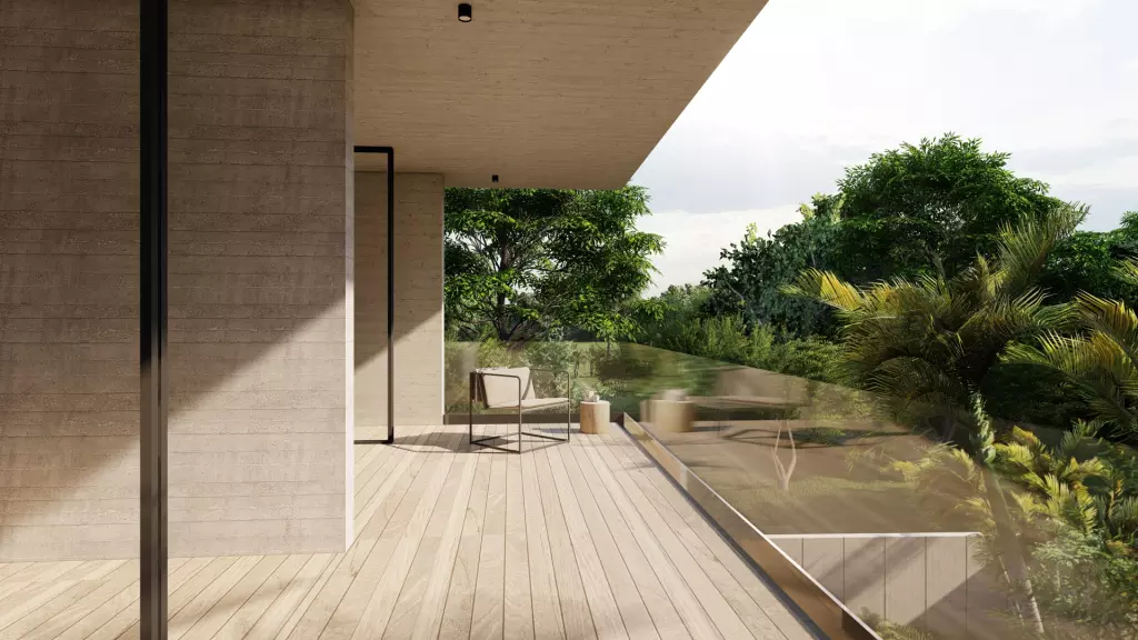 The villa features three bedrooms and four bathrooms, an enclosed living room, which provides a cozy and private atmosphere for relaxing or entertaining. The living room is decorated with tropical hard woods and exposed concrete walls, giving it a unique blend of modern and natural aesthetics.