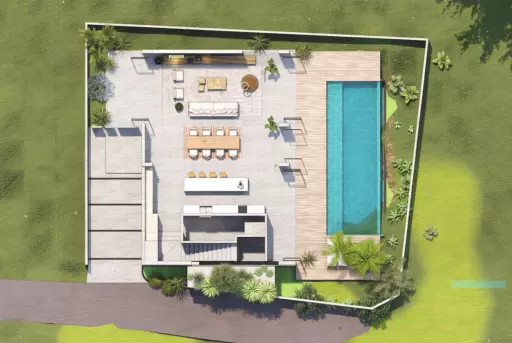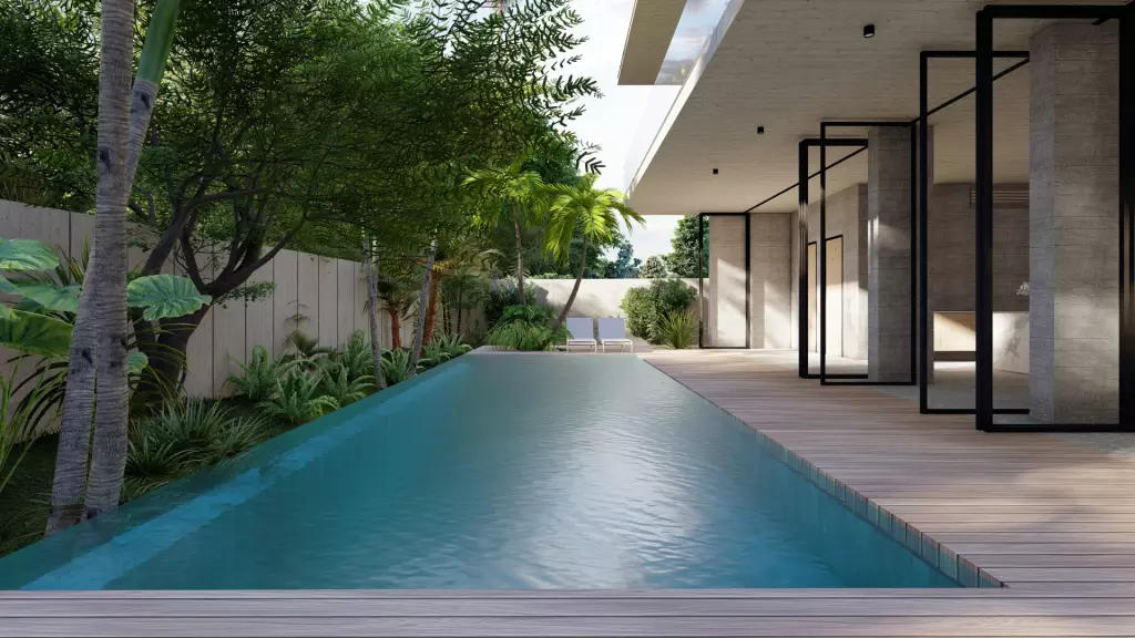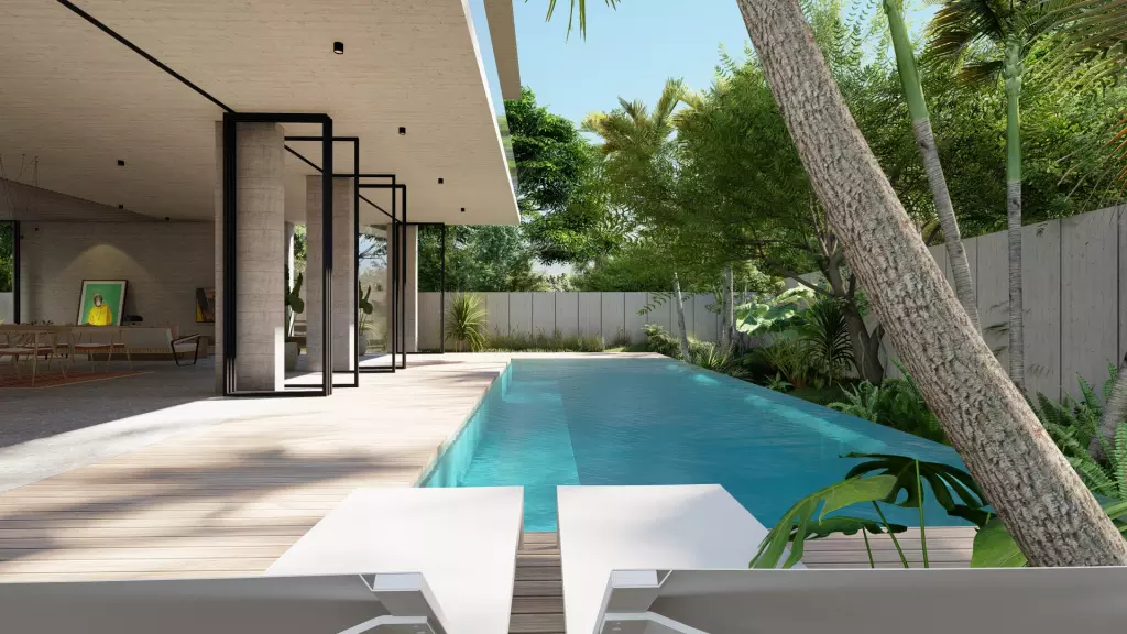 This impressive villa, designed in the striking brutalist Topical style, is currently being built in the coveted area of Pererenan, Tiying Tutul. Not only is it conveniently located near the beach, a diverse range of sophisticated eateries and cafes, but it is also surrounded by stunning natural scenery and an affluent community. The West Bali coast is renowned for its spectacular beaches, which attract a global surfing community.