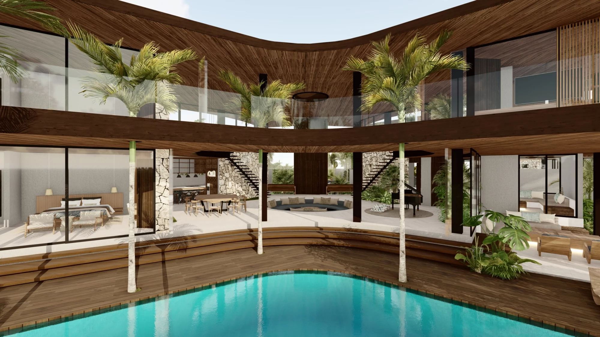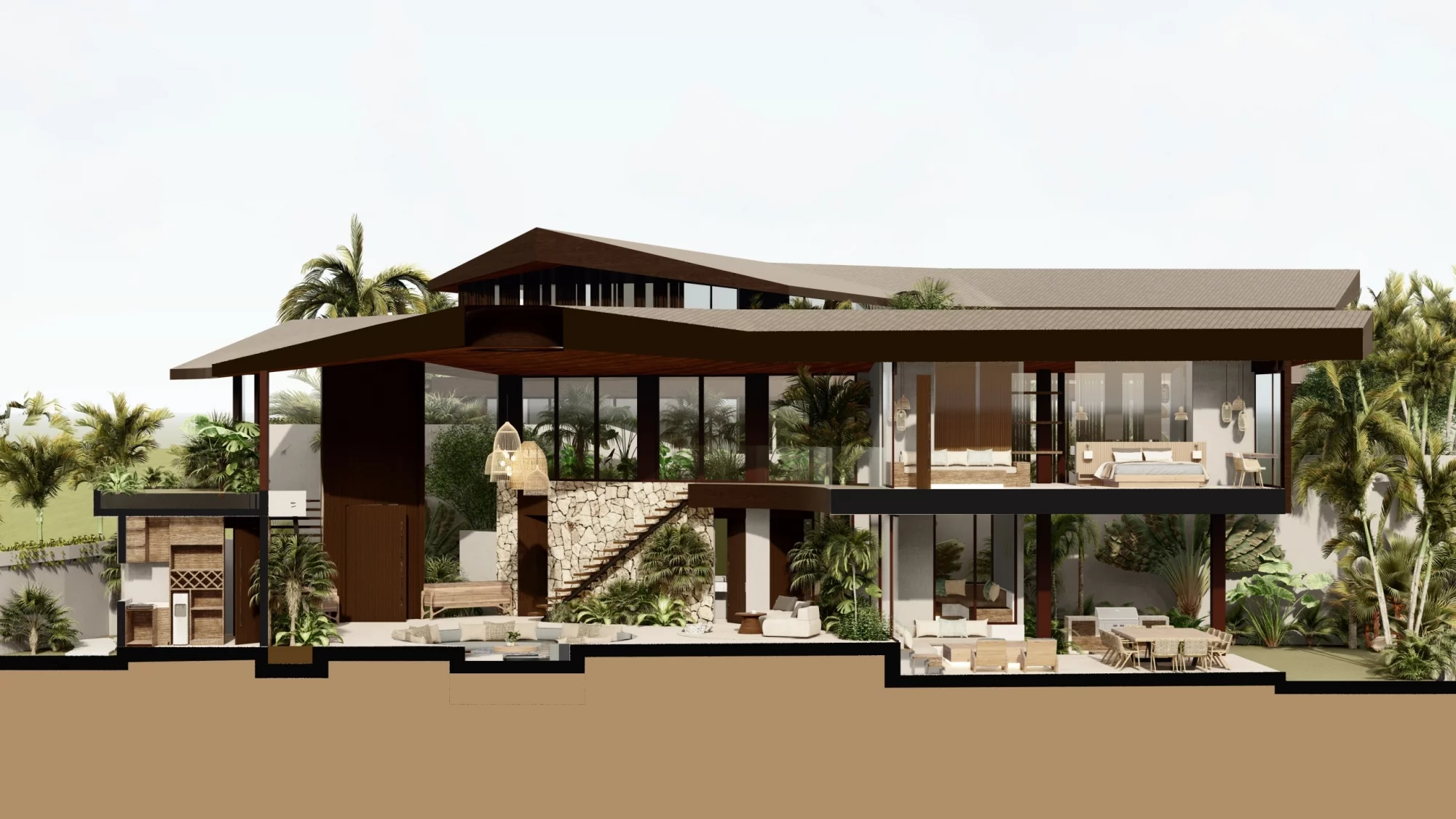 The villa has been built on a slightly sloping terrain and boasts a two-story designer layout, with a spacious and modern design created by the renowned Spanish architect Nacho of Bamboo. The design concept is focused on achieving a seamless integration between the patio, decking, and garden with the interior spaces. This is accomplished through the use of a wide openable façade, which offers unobstructed views and creates a holistic living experience.