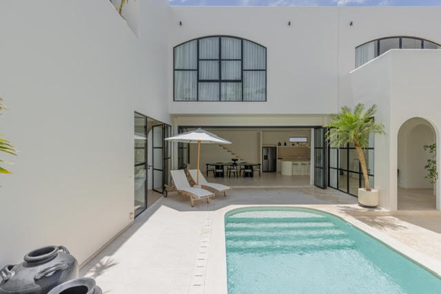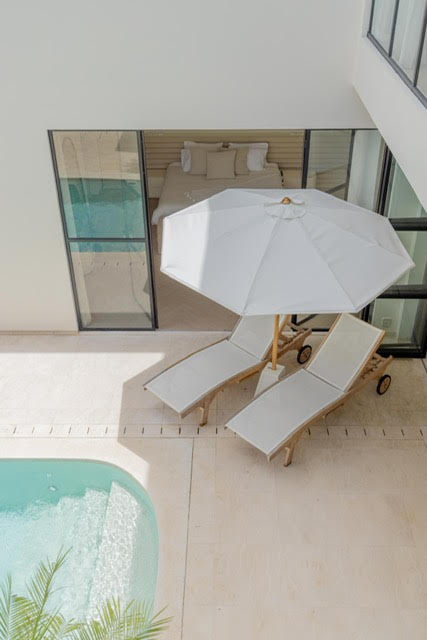 The outdoor section on the ground floor of this villa features a spacious pool and comfortable sun loungers, allowing you to fully enjoy the outdoor facilities.
