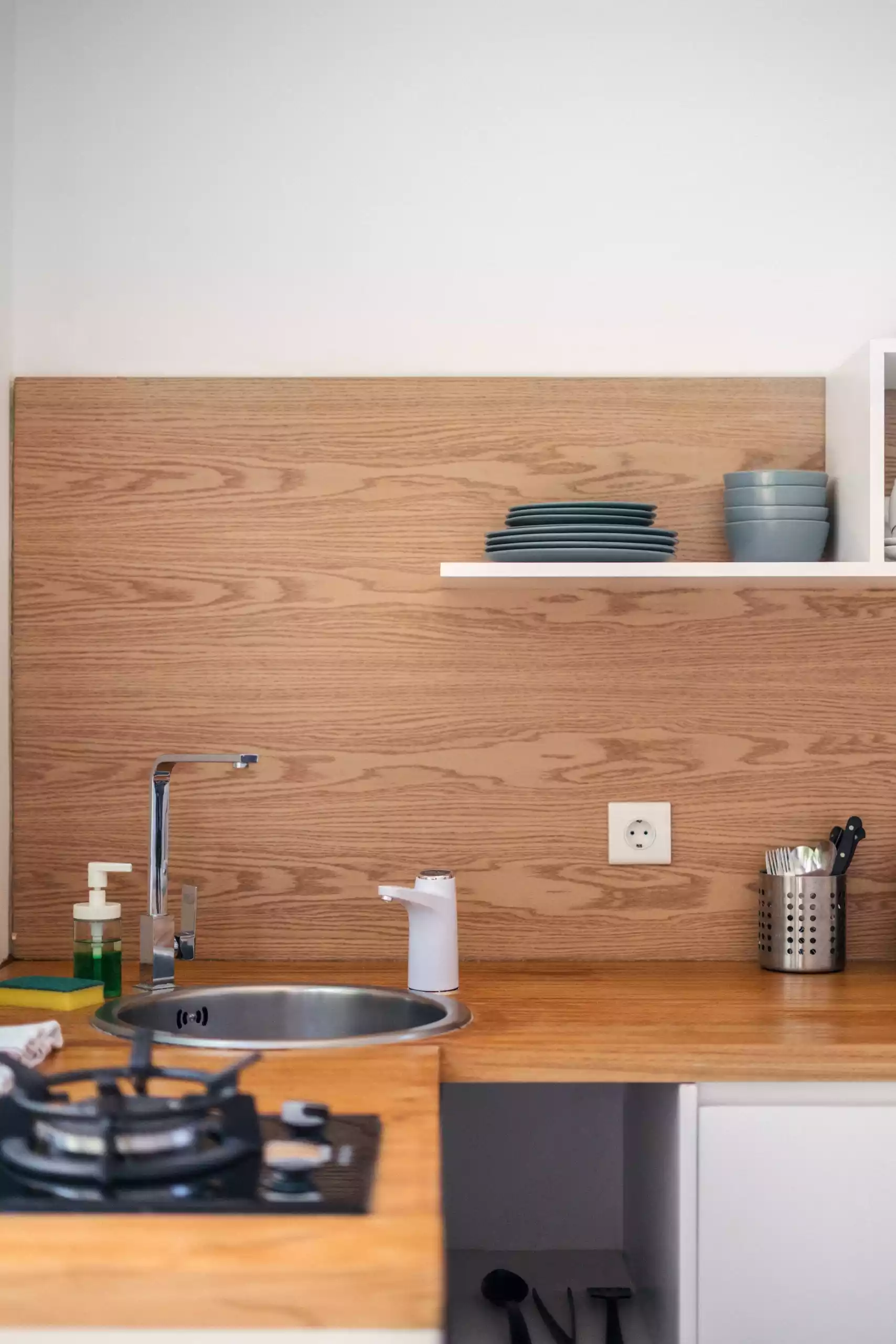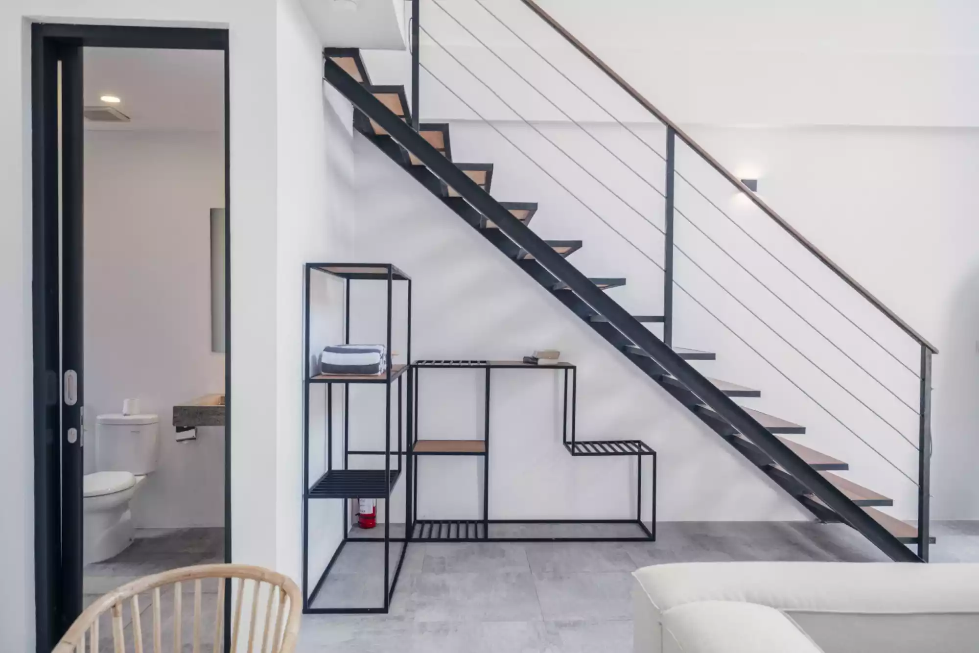 The outdoor area features a terrace with a little pool, ideal to chill & have a drink with your friends. Large French doors invite you to enter the property, designed as a loft. You’ll find an enclosed living room and an open-plan kitchen. You’ll also find the bathroom with a large shower. Wooden & iron stairs lead you to the first floor, fitted out as a bedroom.
