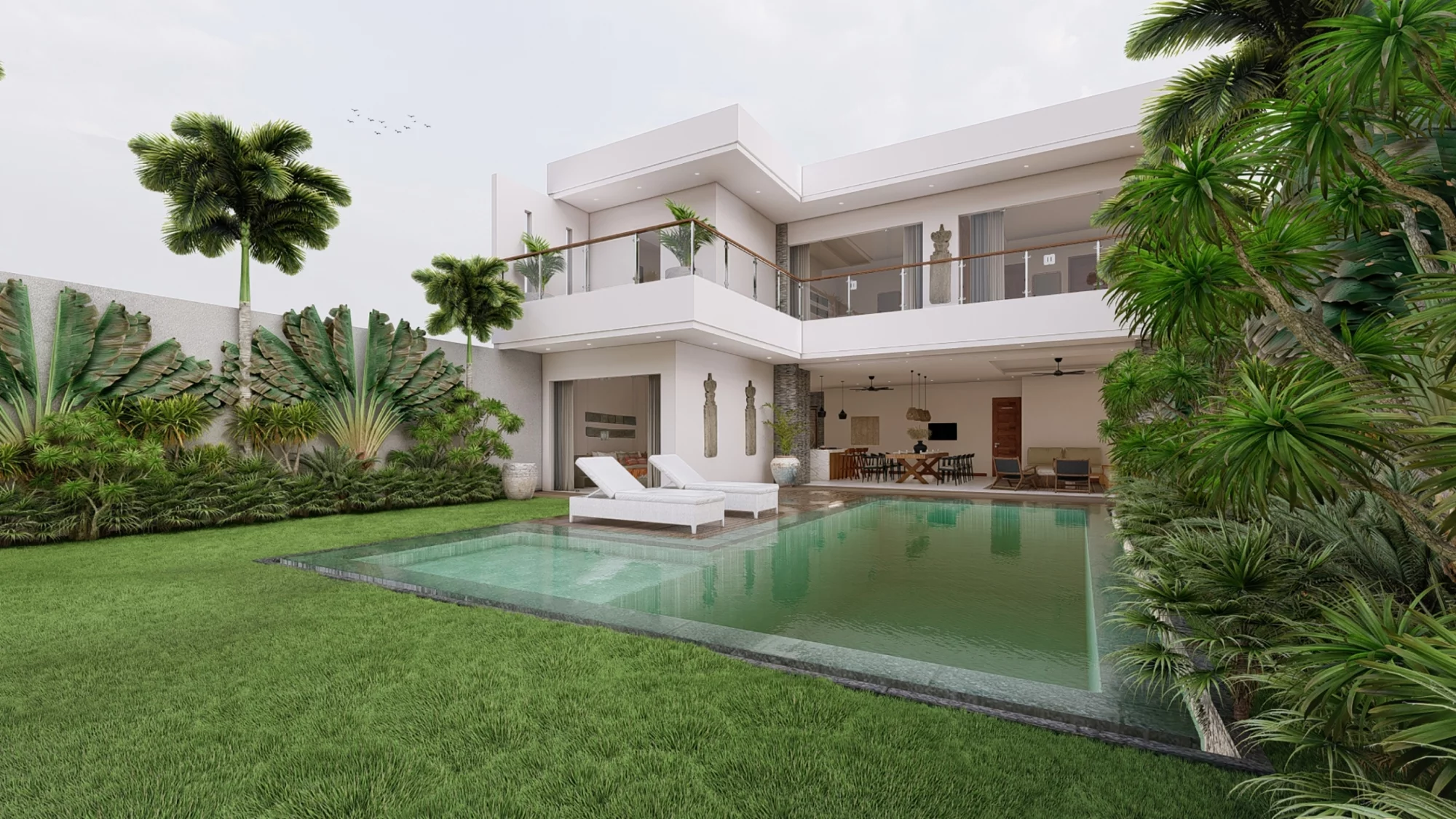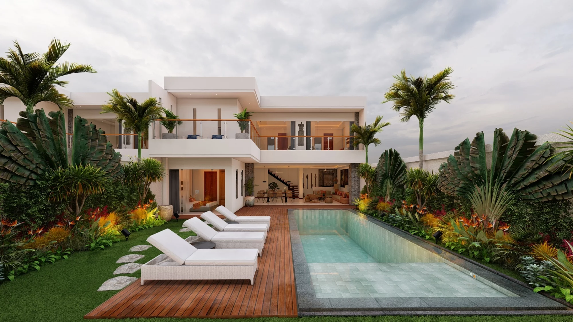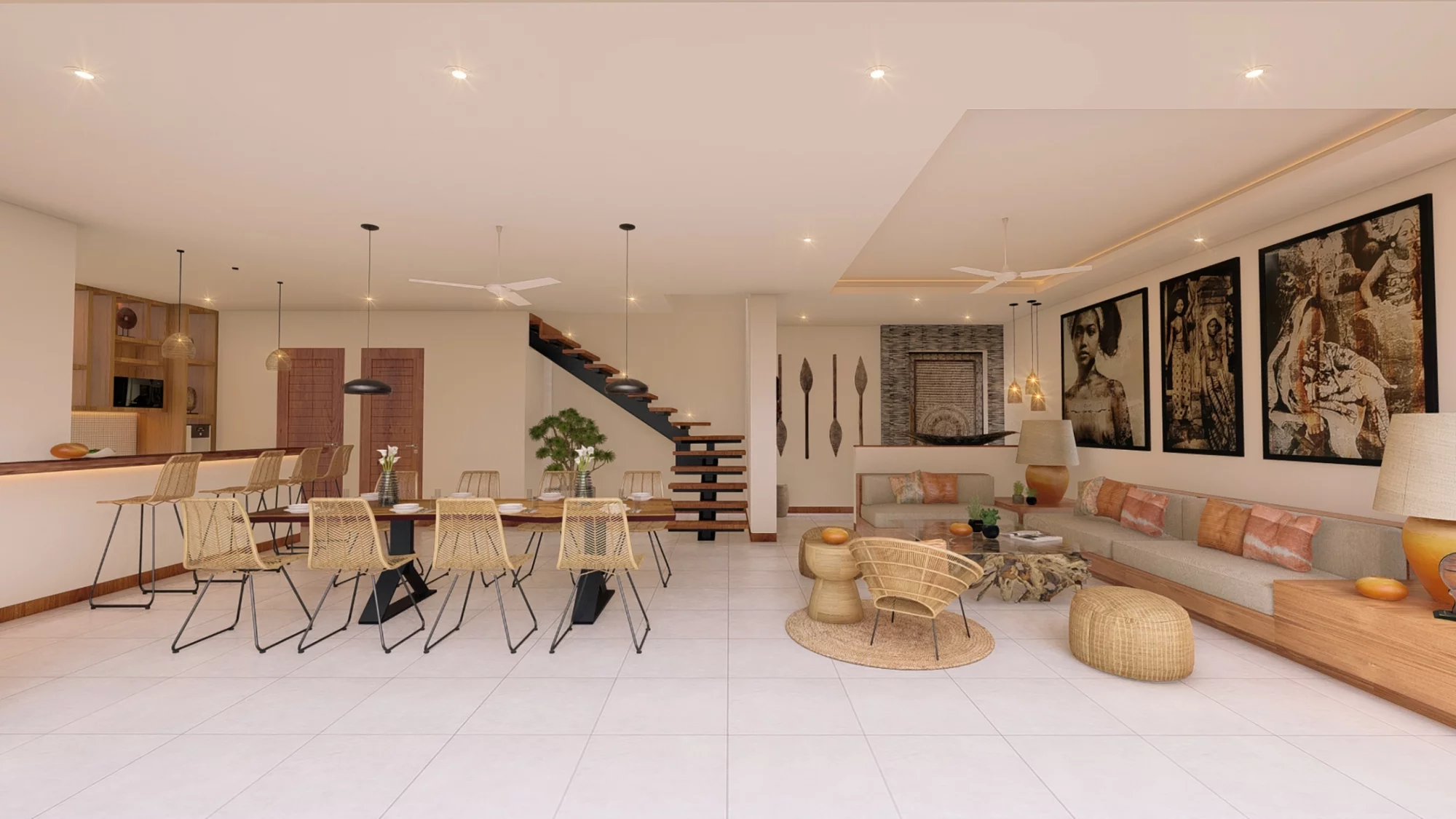 This stunning L-shaped villa is situated on a 300 sqm plot of land and has a building size of 198 sqm. The main living area is located on the first floor, providing a spacious environment with a beautiful view of the garden and pool area. The unique design adds a touch of modernity and luxury to the villa, and the interior is furnished by an international designer. The design concept focuses on creating a clean and uncluttered space, while incorporating antiques and Balinese artifacts to enhance the elegance and comfort of the villa