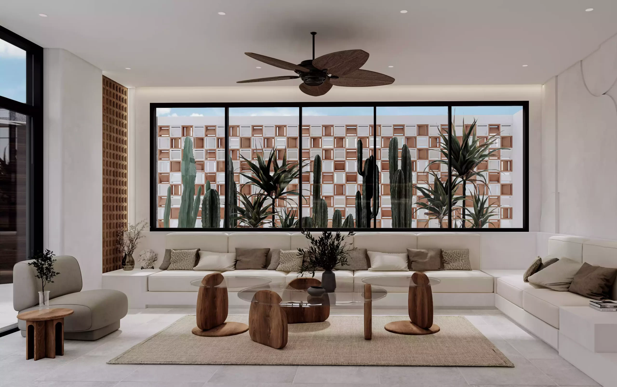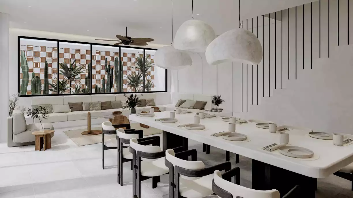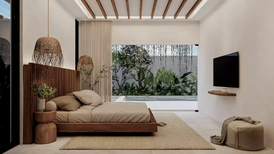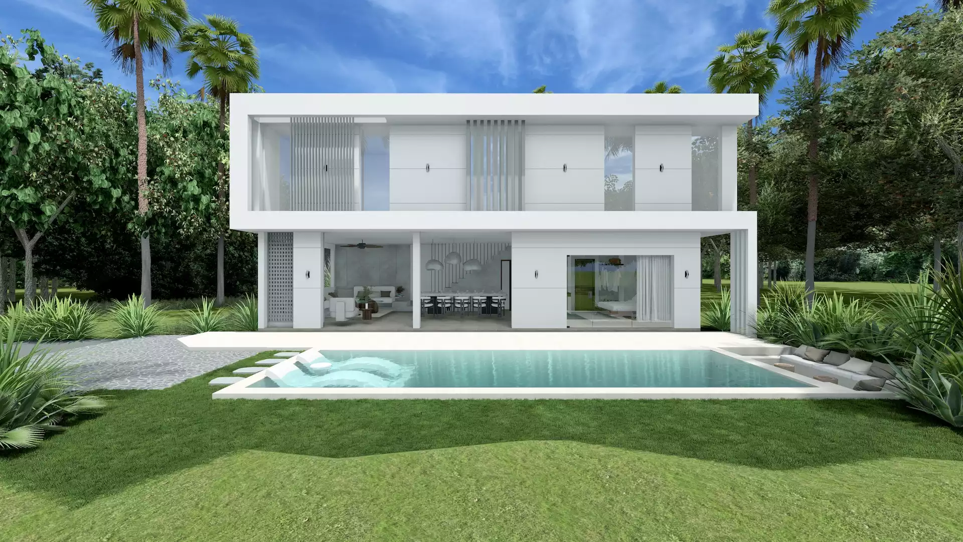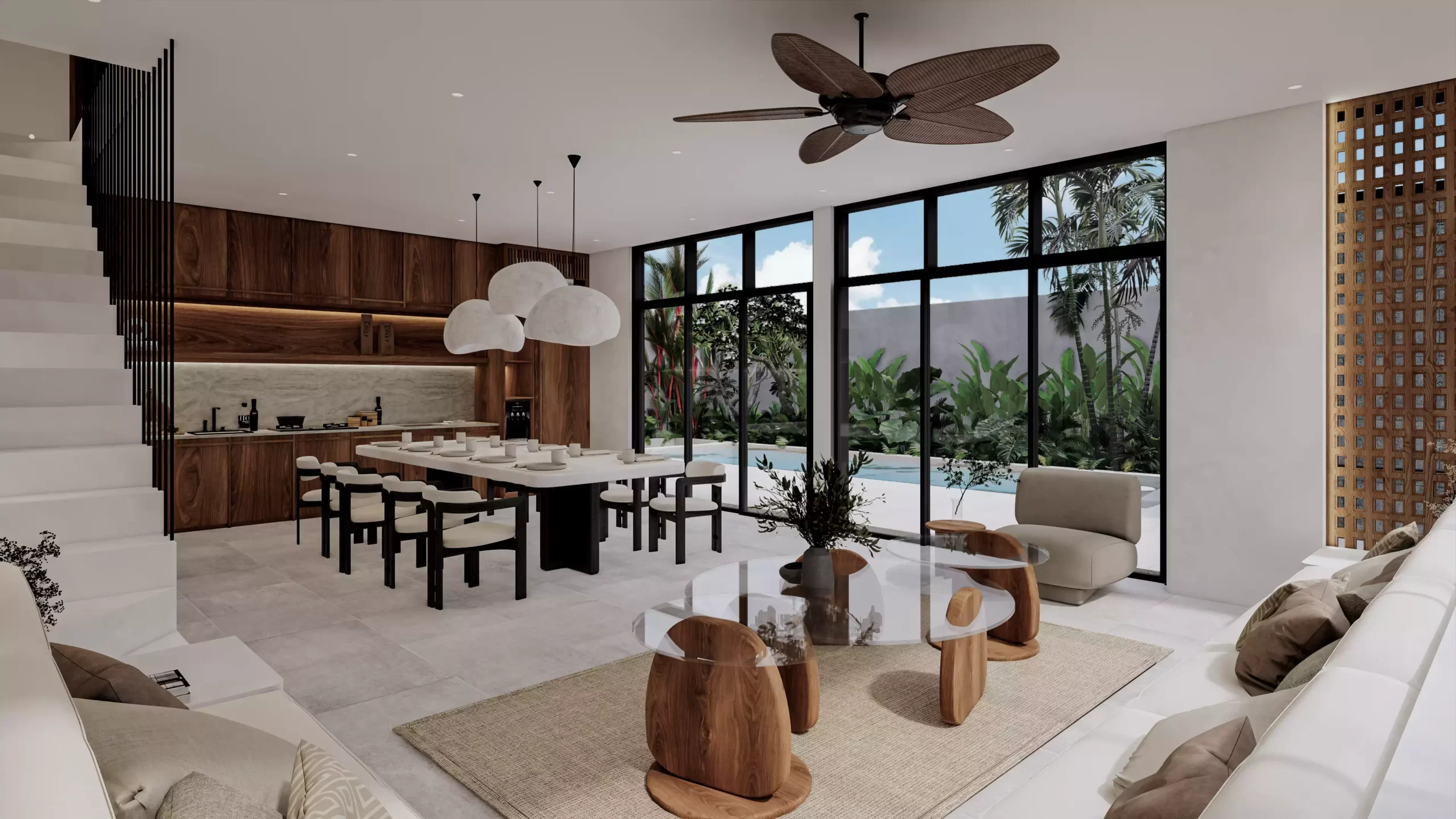 he main living area features a lavish dining space and a cozy lounge area, seamlessly connected to the garden and pool, providing a seamless indoor-outdoor living experience. The interior of the house exudes elegance with its tasteful decor and wooden accents. Abundant natural sunlight filters through the expansive windows, infusing the living spaces with warmth and a tropical ambiance.