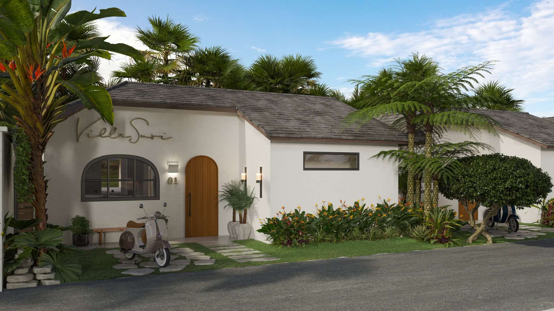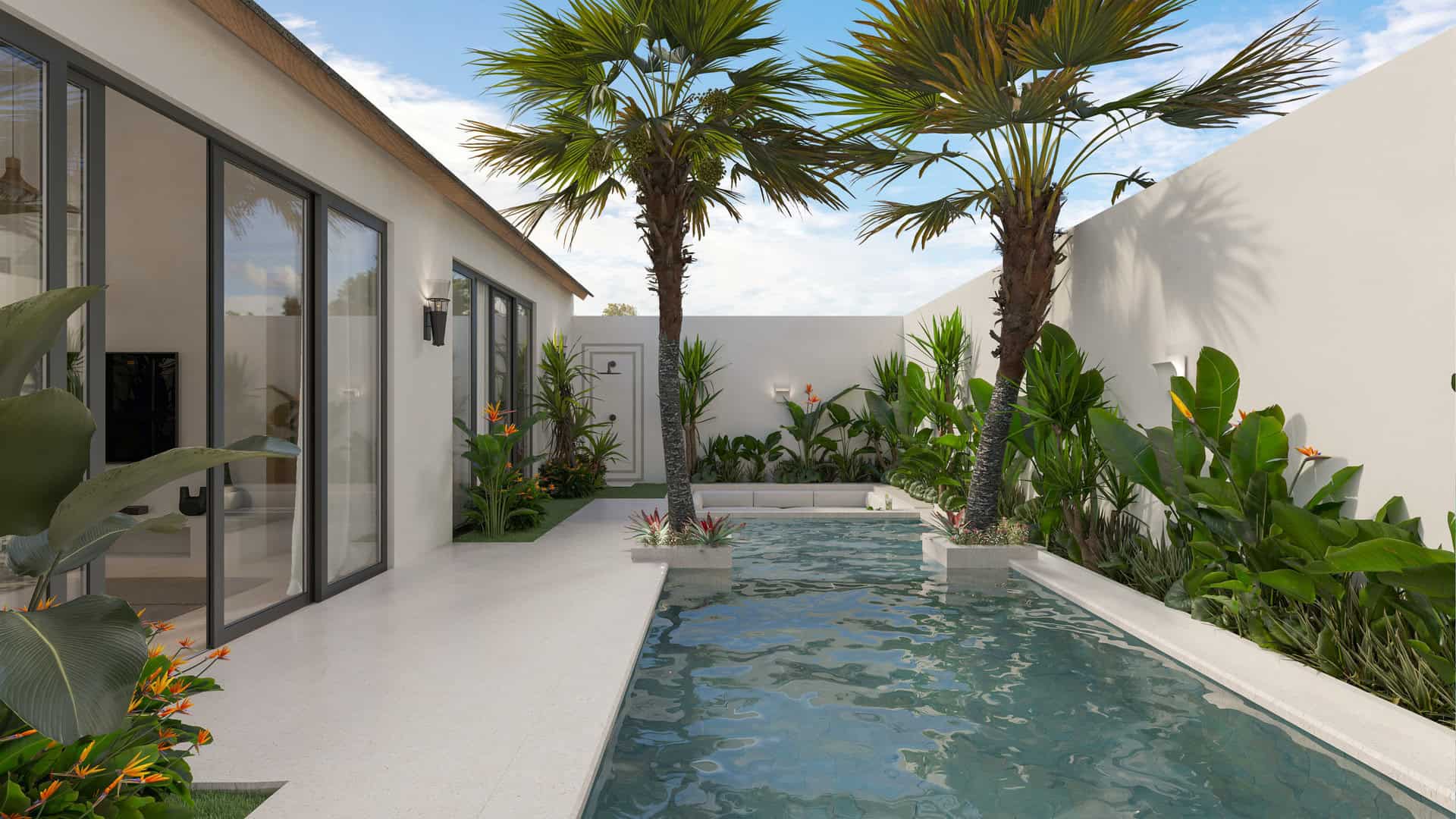 À l’extérieur, profitez d’une piscine privée de 16,25 m², avec un espace lounge en contrebas idéal pour se détendre ou socialiser avec style. La villa offre également des commodités pratiques, telles qu’un espace de stationnement dédié pour scooter.