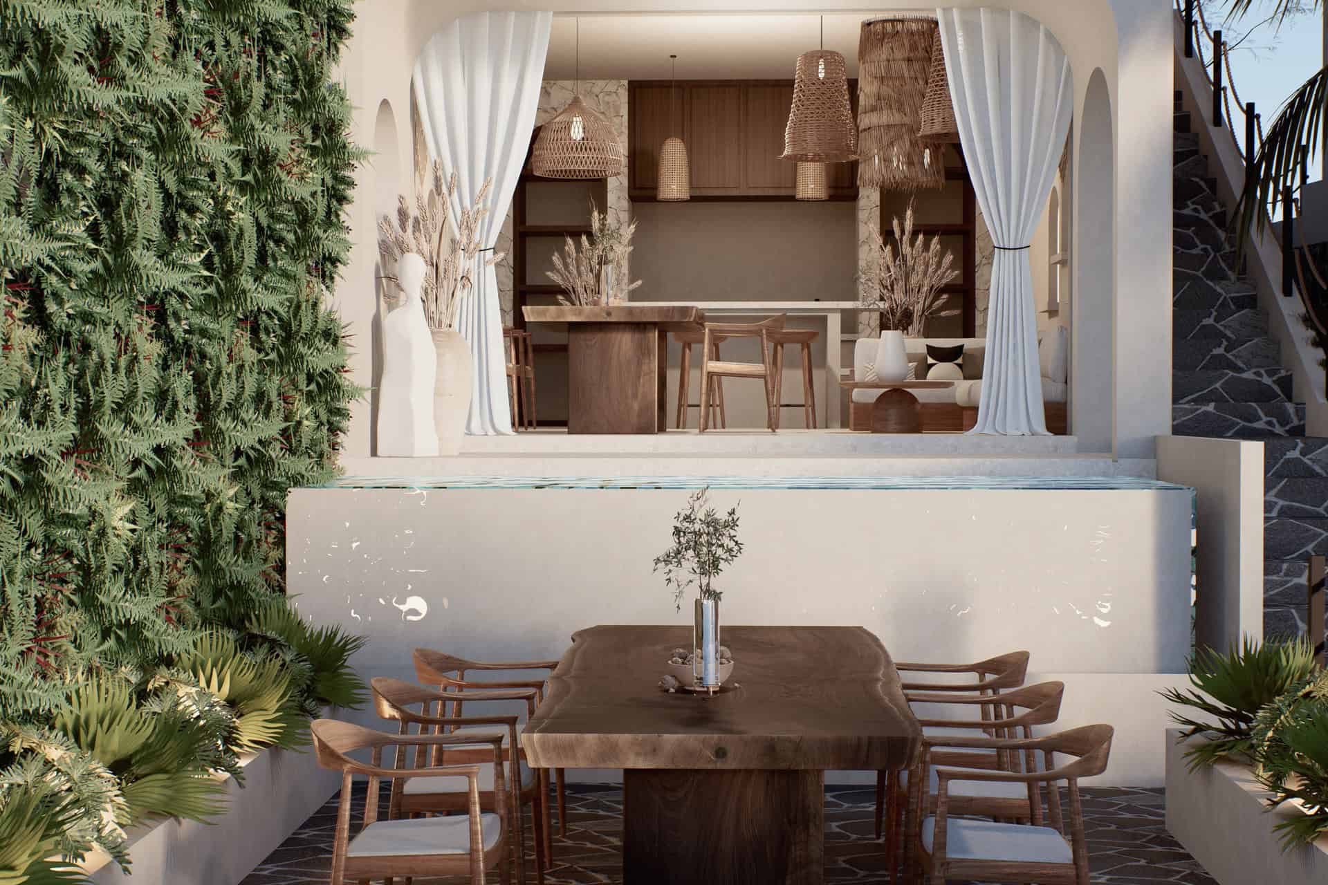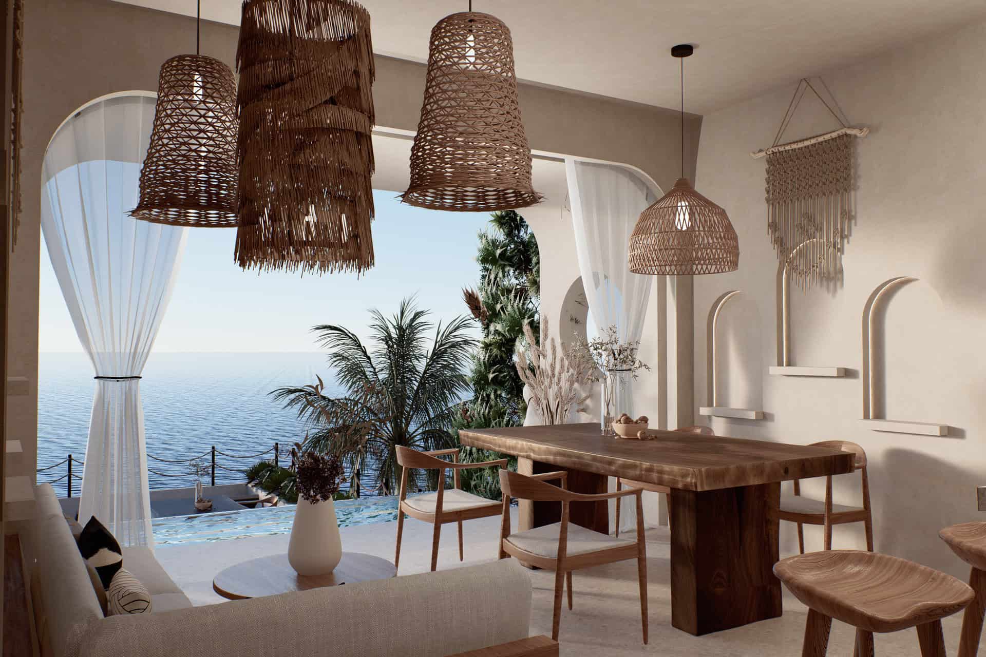 Cette villa spectaculaire avec vue sur l’océan présente un design tropical contemporain et écologique, avec des accents en bois élégants et une palette beige, s’étendant sur plus de 185 mètres carrés de terrain, avec une généreuse surface de 246 mètres carrés pour le bâti. Elle comprend 2 chambres, 2 salles de bains, un espace de vie confortable, une cuisine moderne et une salle à manger élégante. Chaque aspect de cette villa est conçu pour offrir aux invités des vues imprenables sur l’océan dès le réveil, la possibilité de savourer un café, de se rafraîchir dans la piscine ou de se détendre dans le salon encastré, le tout avec l’océan turquoise à couper le souffle en toile de fond constante.