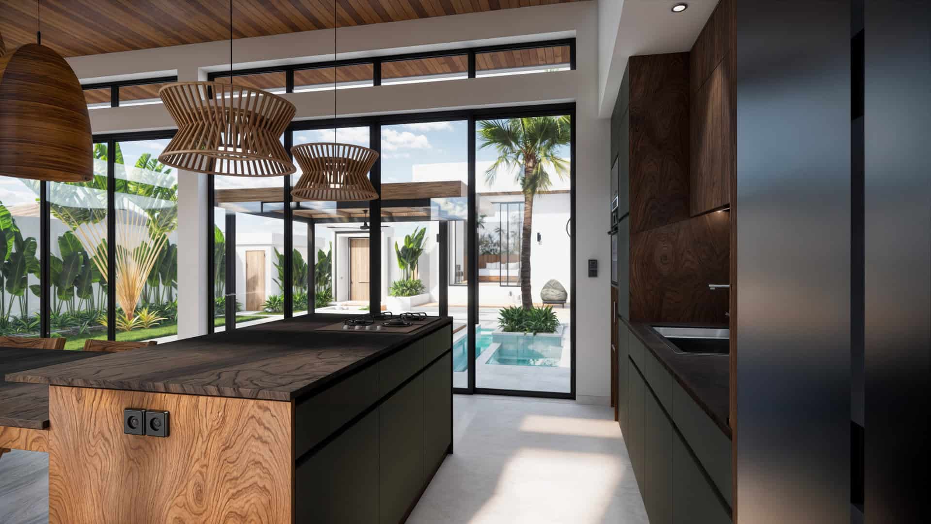 En entrant, la villa dévoile son design spacieux, avec trois chambres accueillantes, chacune dotée de sa propre salle de bains attenante. Entièrement meublée, elle comprend un salon en contrebas, un espace unique en son genre. Les grandes fenêtres à haut plafond offrent une atmosphère ouverte et lumineuse, tandis que la cuisine entièrement équipée est prête à accueillir vos invités.