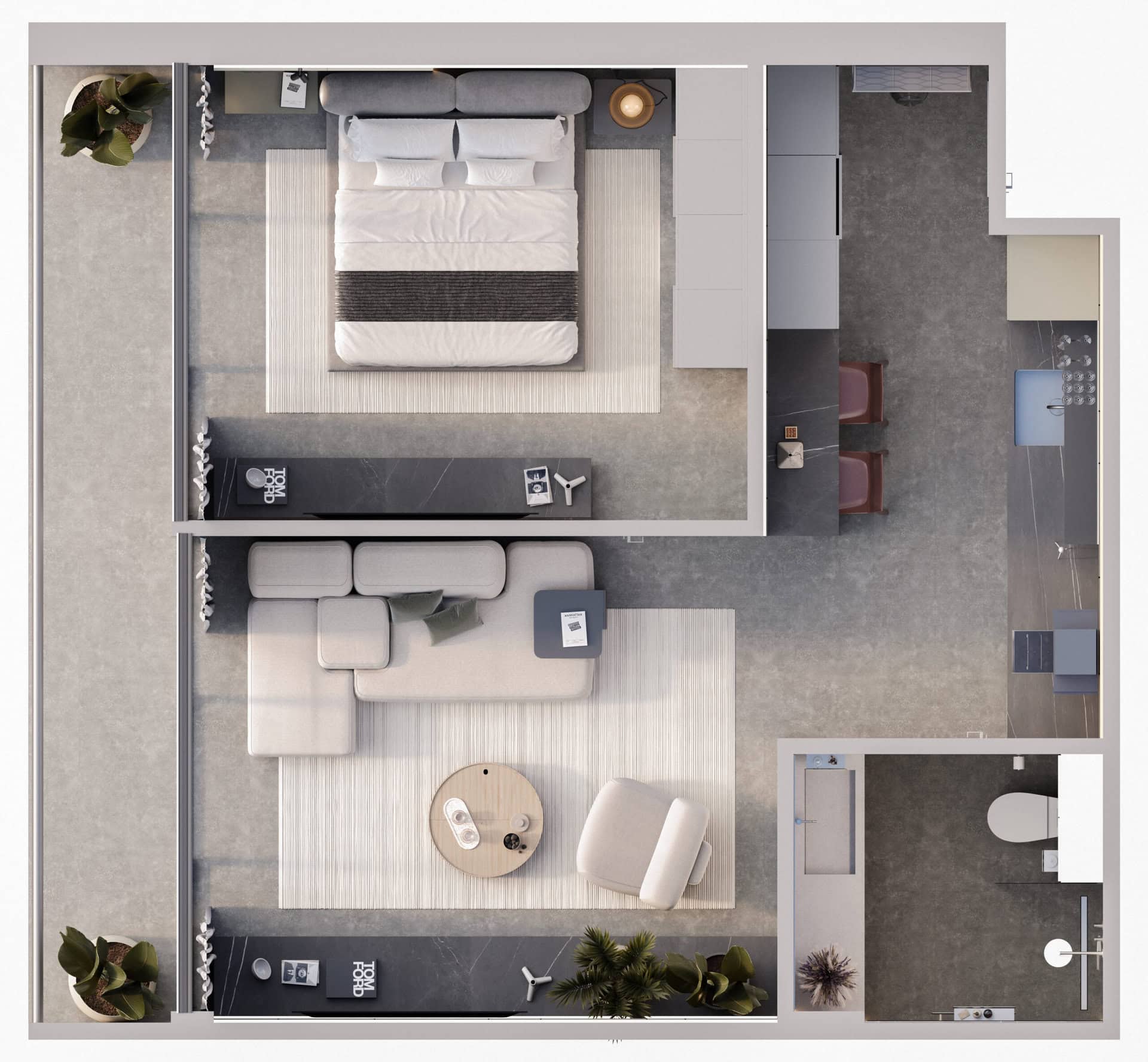 Step into a world of elegance with our modern apartments, boasting a sleek white design that offers a clean and futuristic ambiance. With sizes ranging from 25 to 40 square meters, each unit is thoughtfully designed to provide comfort and luxury, featuring a spacious bedroom, bathroom, cozy living room, fully equipped kitchen, and a chic dining area.