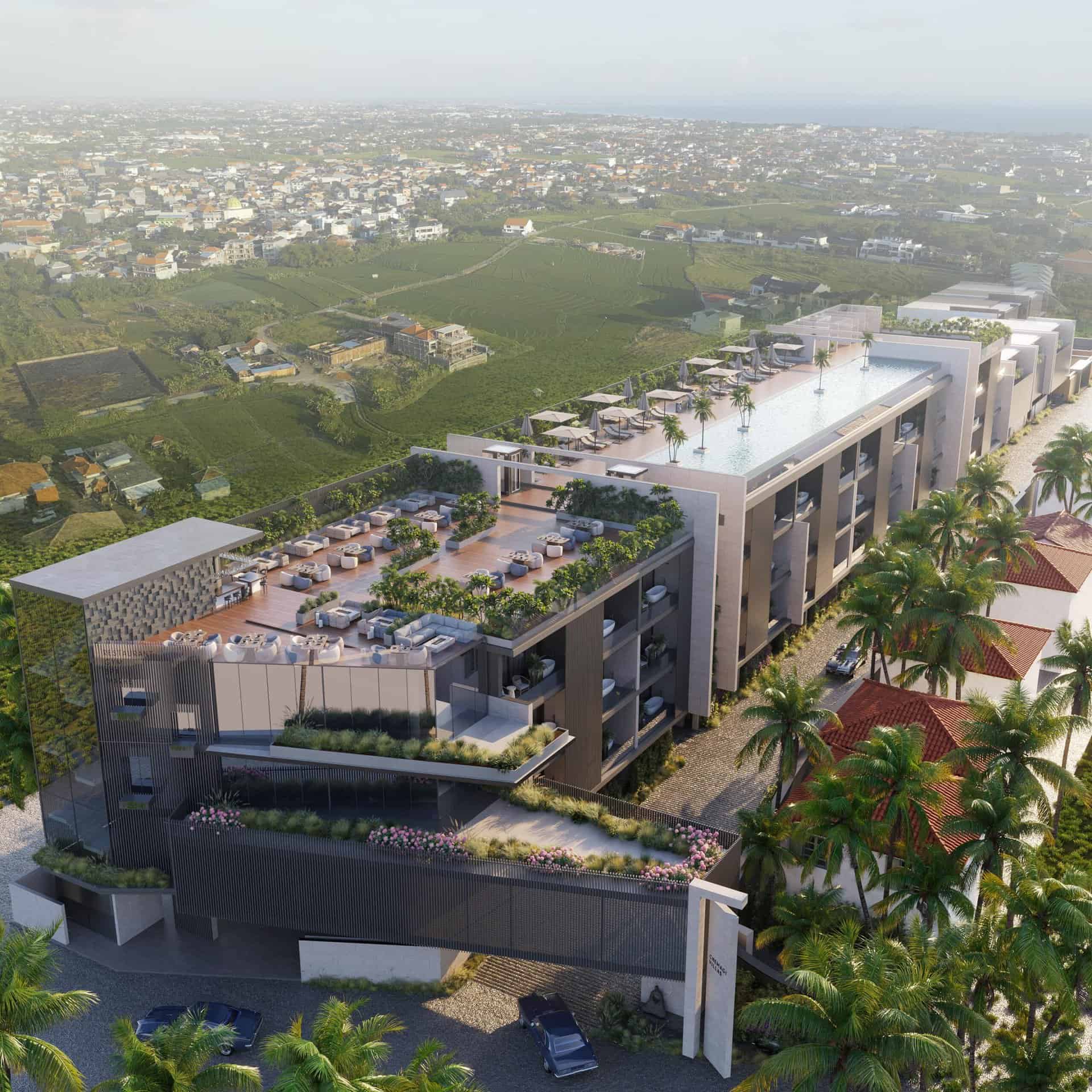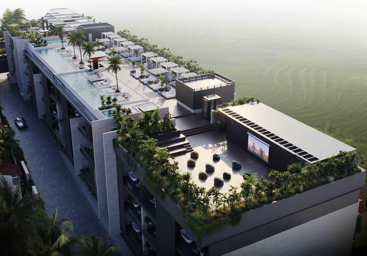 These apartments represent the pinnacle of contemporary luxury, featuring a refined design that harmoniously combines futuristic elements with modern elegance. These are smart apartments with stunning views of either the rice fields or the ocean, from the 3rd , and fourth floor. The residents will have free access to a cinema room, a luxury spa, steak house, restaurant, rooftop with a bar and ocean views, a shisha lounge, a cafe, co-working, and a well-equipped gym .