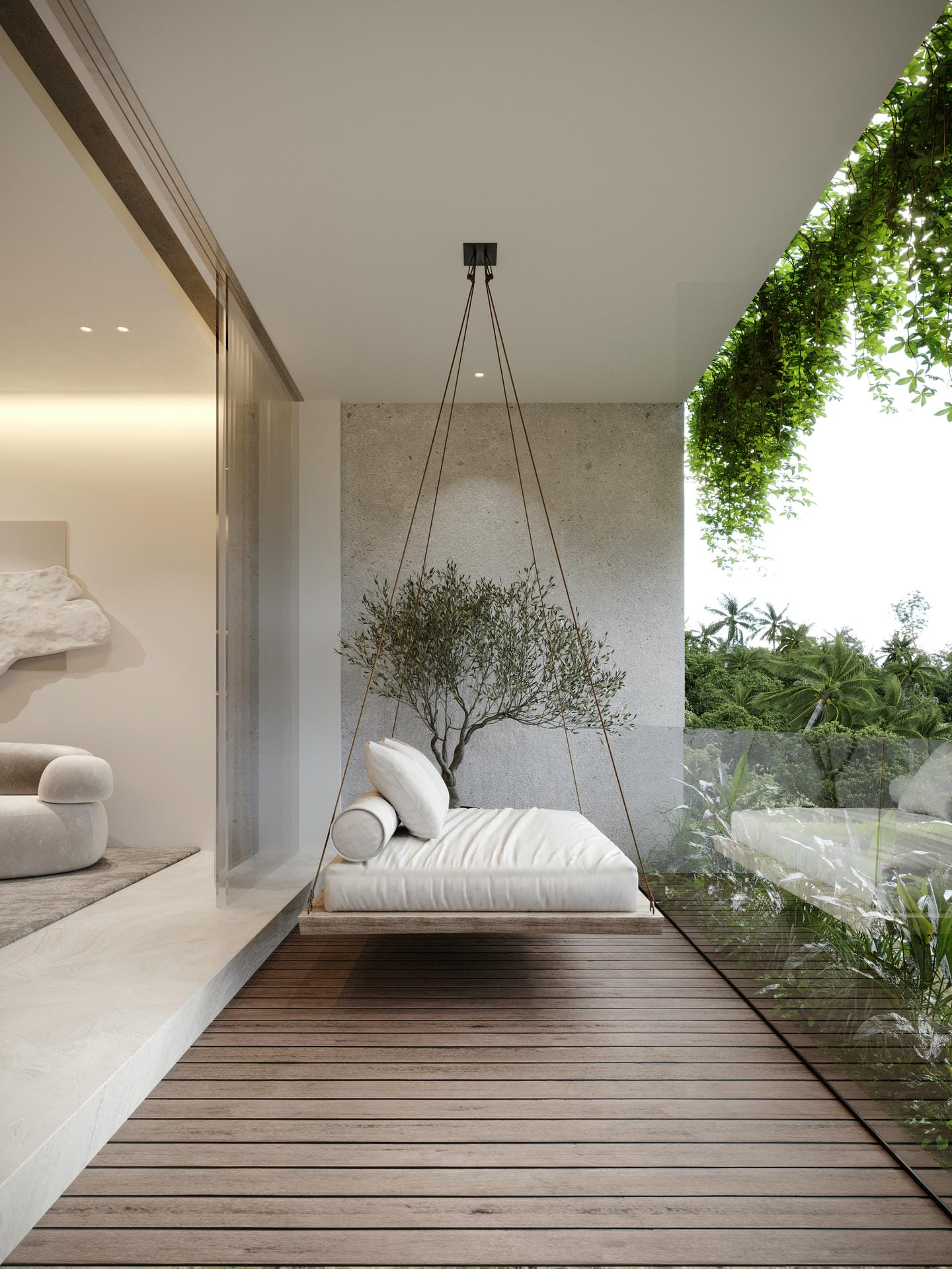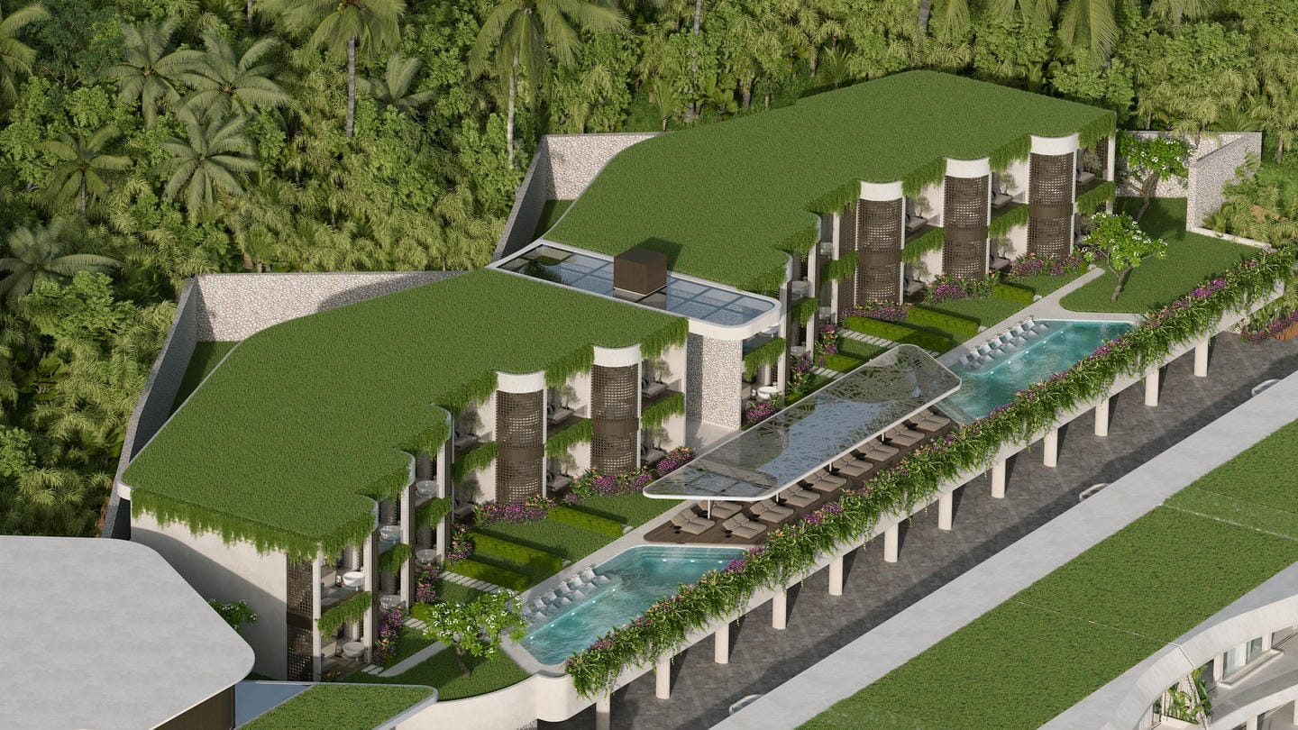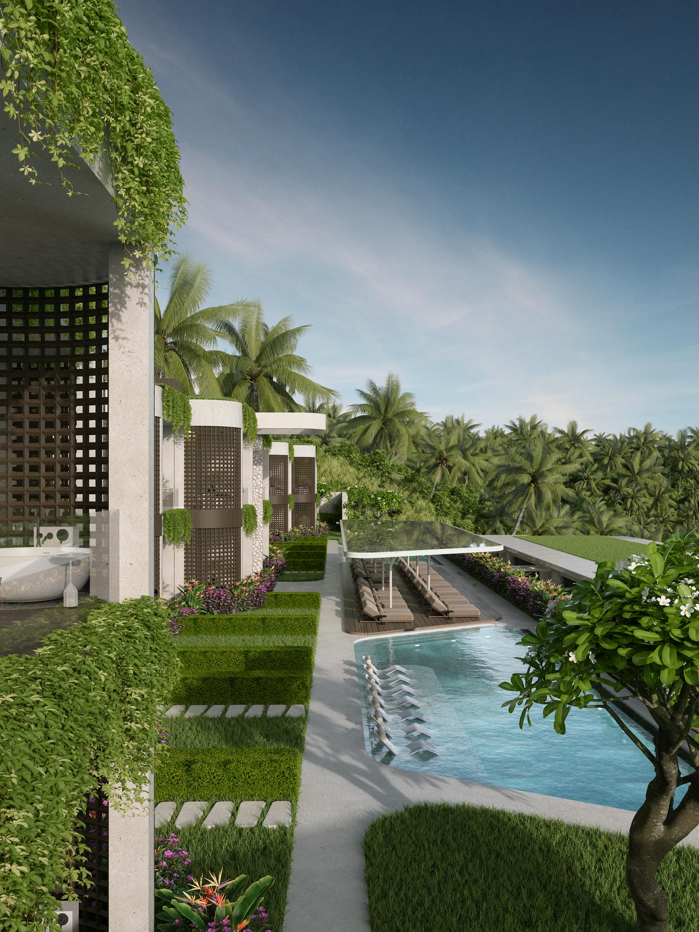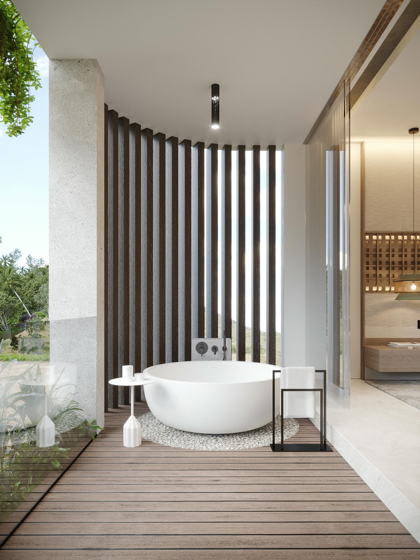 Designed with modern tropical aesthetics, the villa boasts 96 sqm of build size, featuring 1 bedroom, 1 bathroom, and an outdoor bathtub. The spacious living room and open bar kitchen provide a welcoming atmosphere. The balcony comes with a comfortable lounge area, perfect for relaxing and soaking in the stunning views.