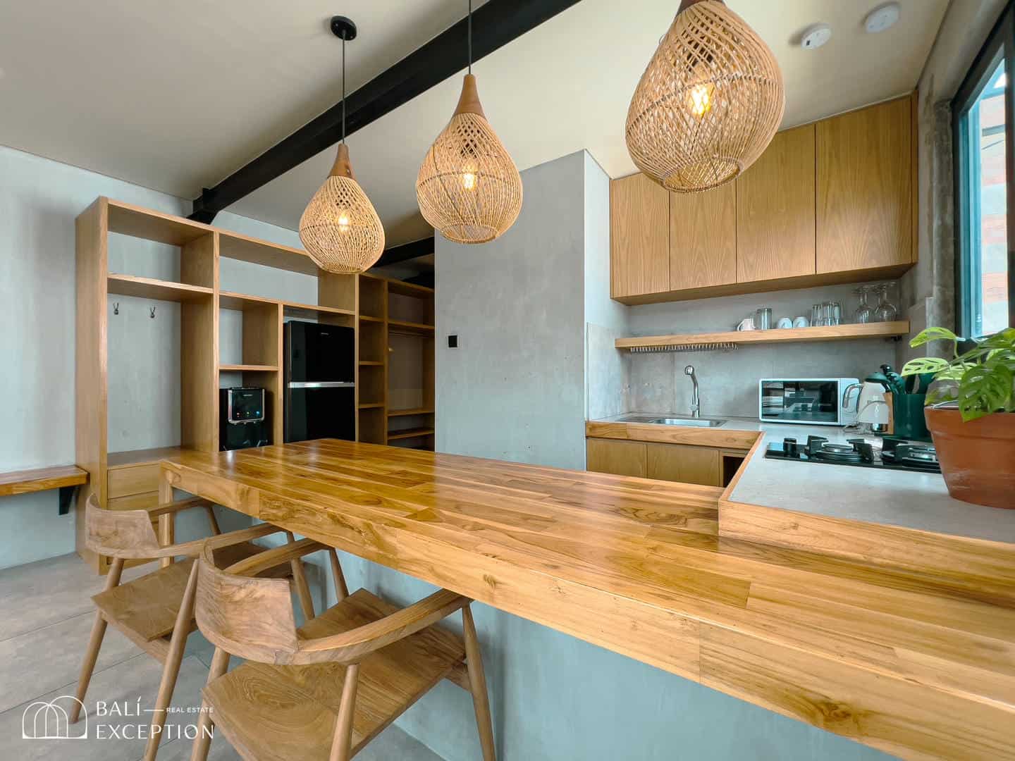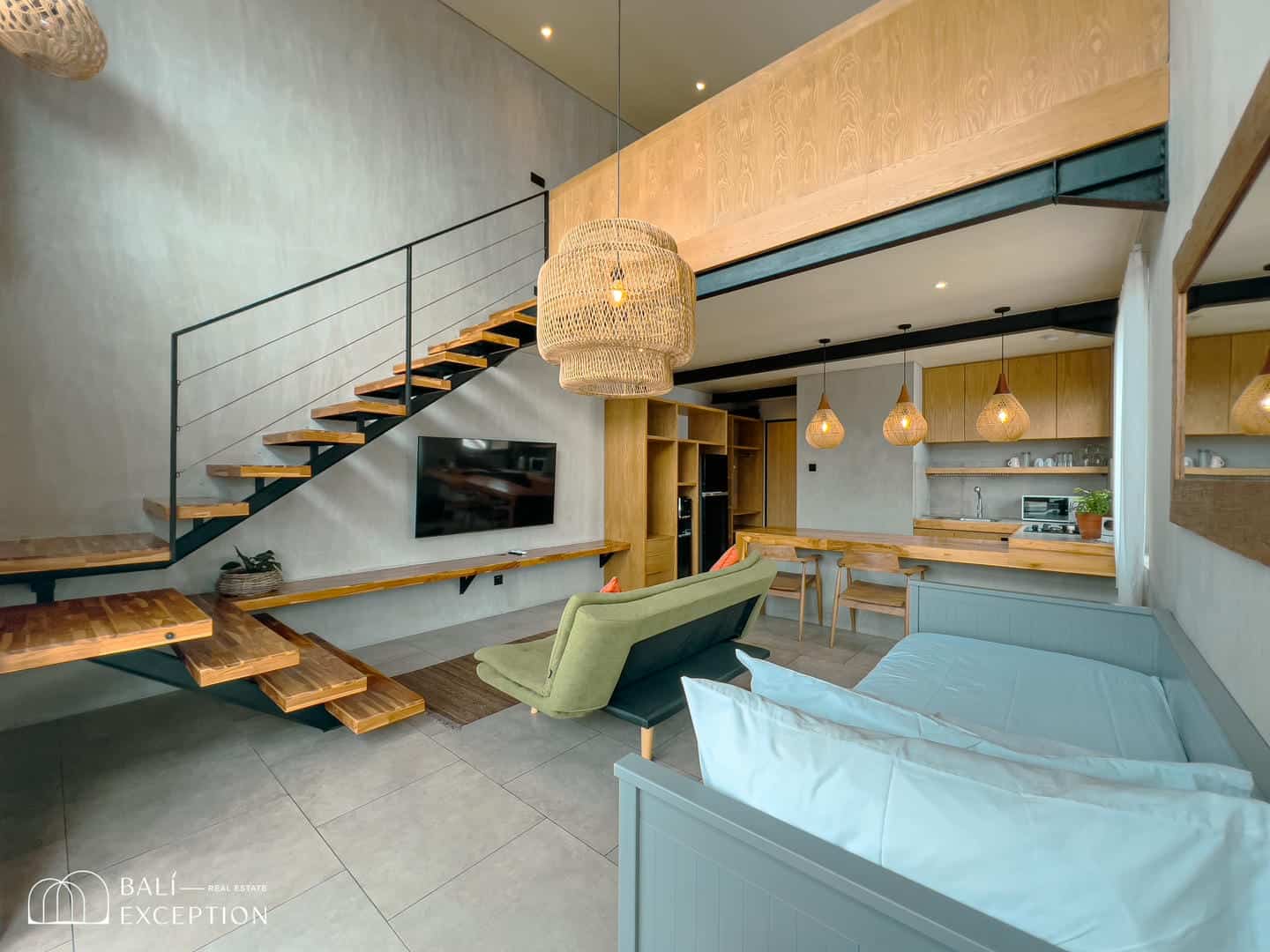 The interior blends industrial chic with warm tropical elements. Clean concrete walls are paired beautifully with natural wood finishes, creating a minimalist yet cozy ambiance. The open-plan living room features a loft-style layout with high ceilings, sleek iron-framed stairs, rattan lighting, and thoughtfully curated furnishings that reflect modern island living.