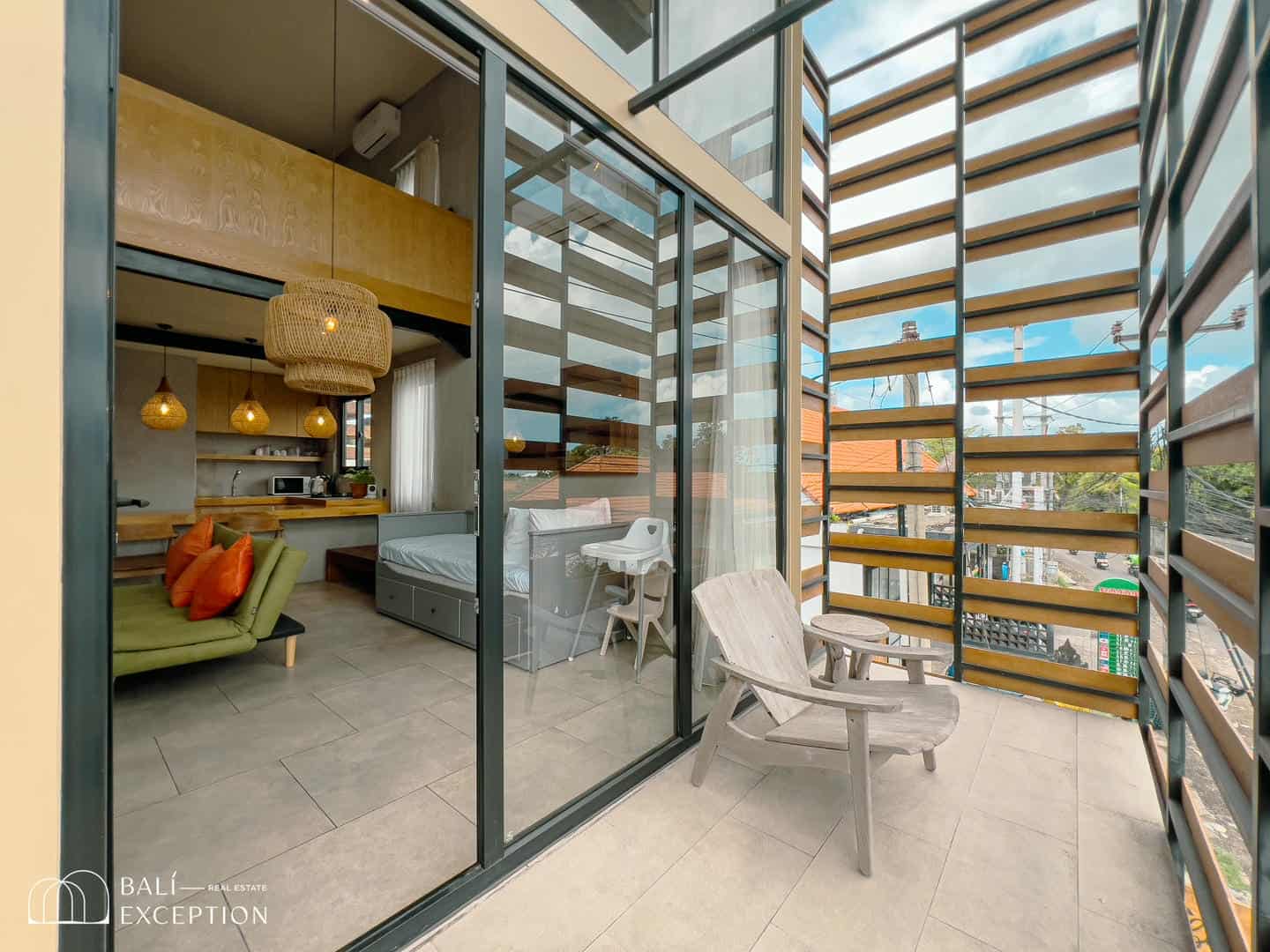 Large windows bring in natural light and offer relaxing views of the surrounding rooftops and tropical greenery. From the upper floor, you can enjoy an elevated view that opens up to Bali’s laid-back village atmosphere — giving you a peaceful contrast to the busier tourist hubs nearby.