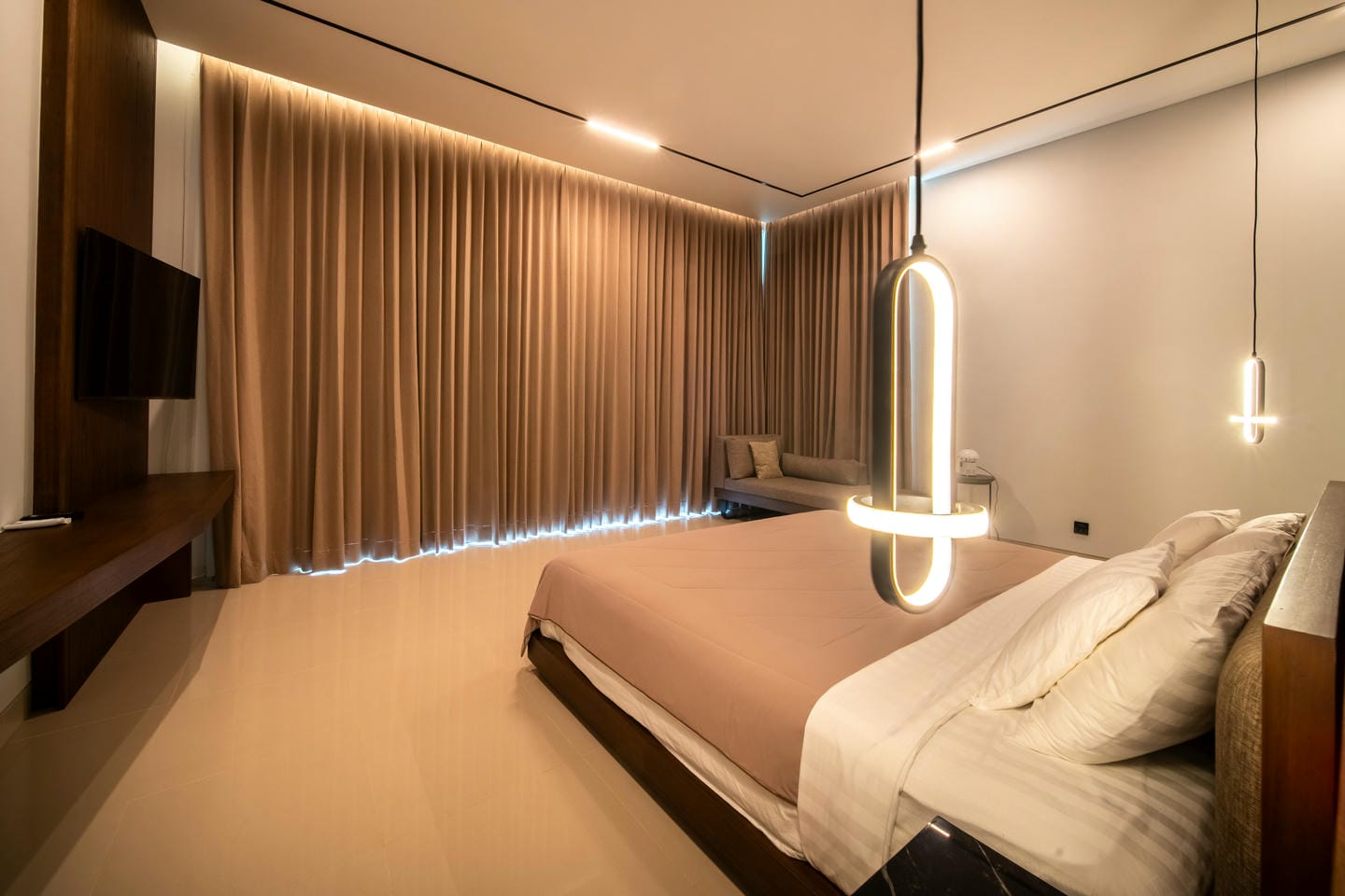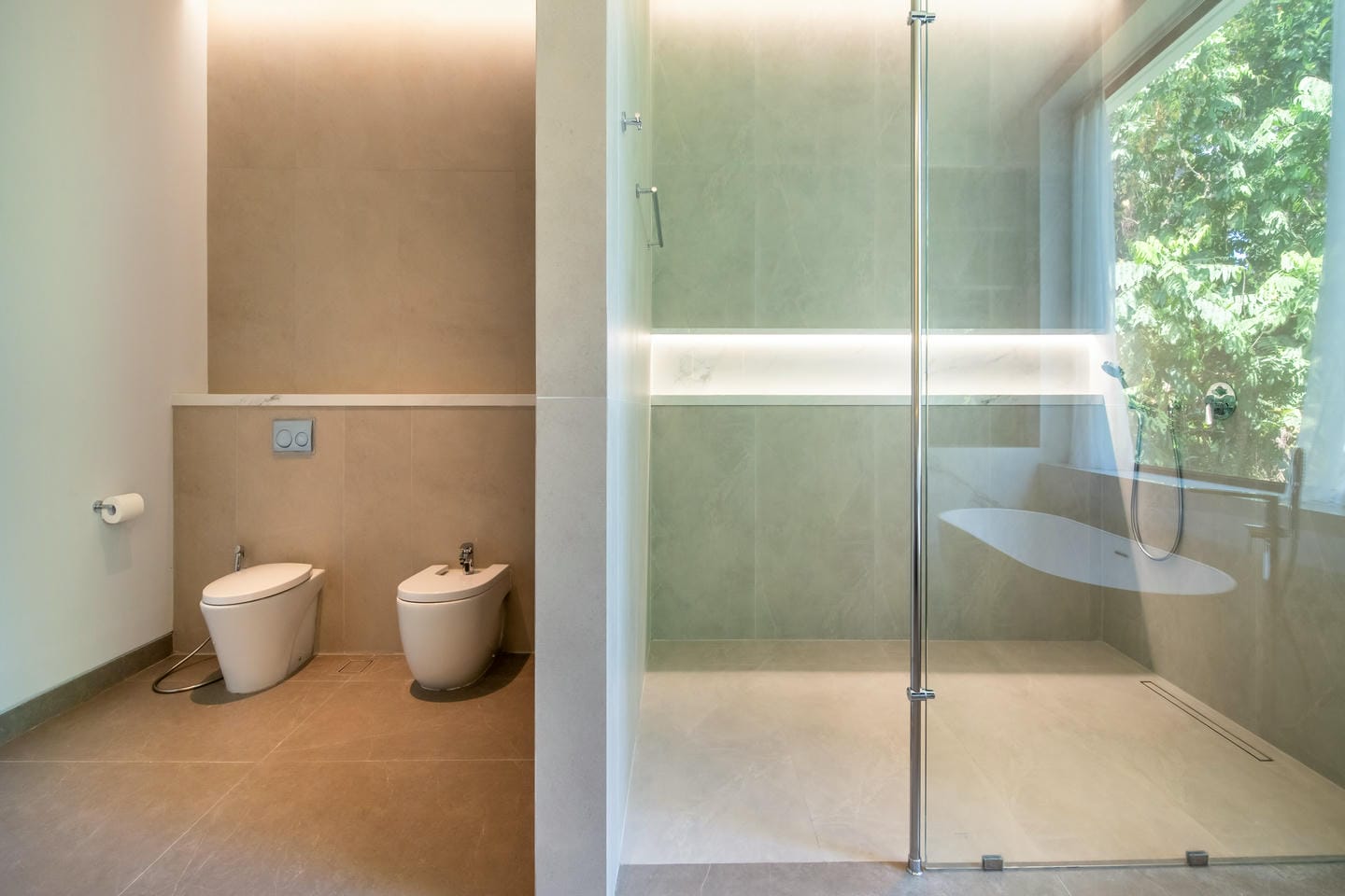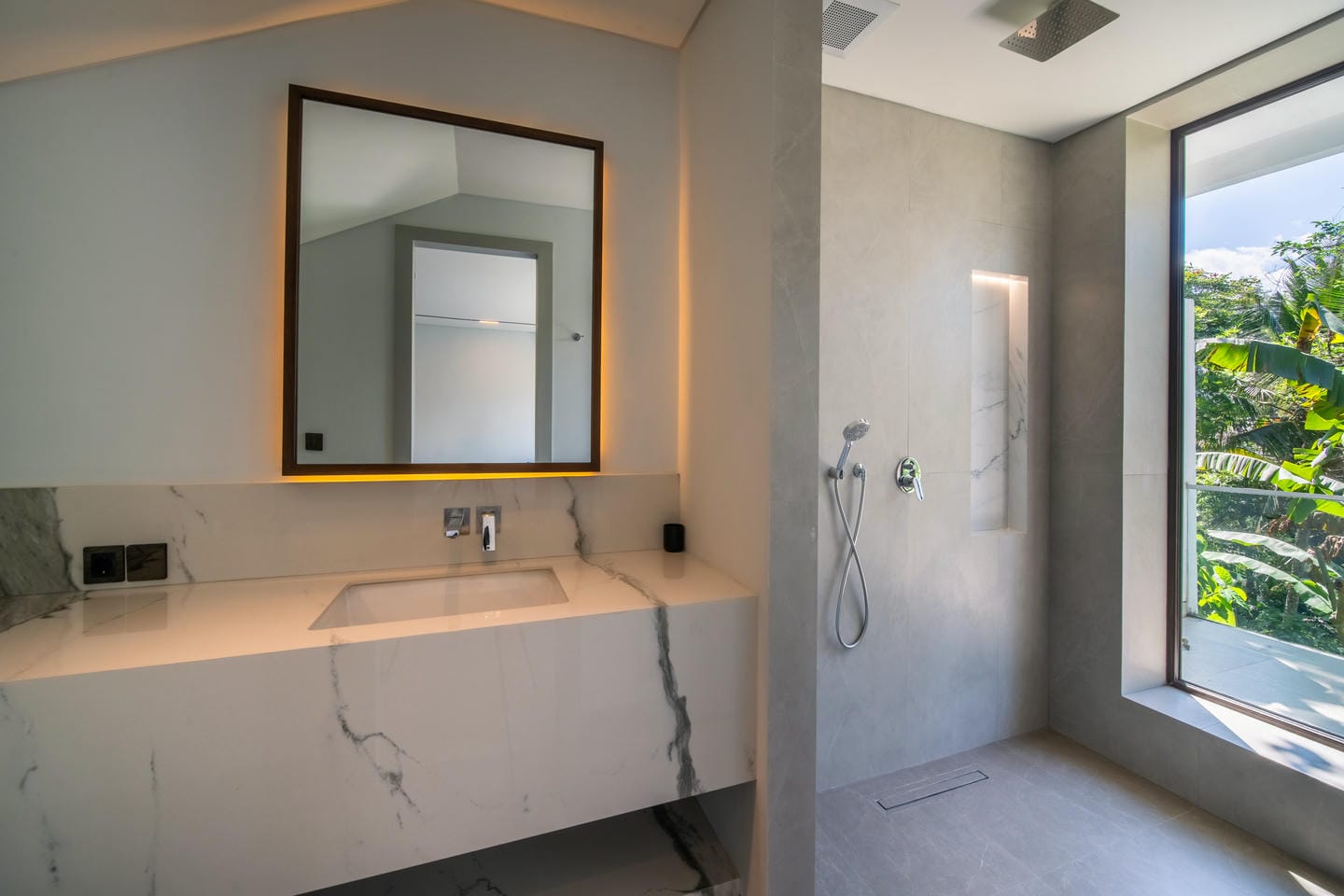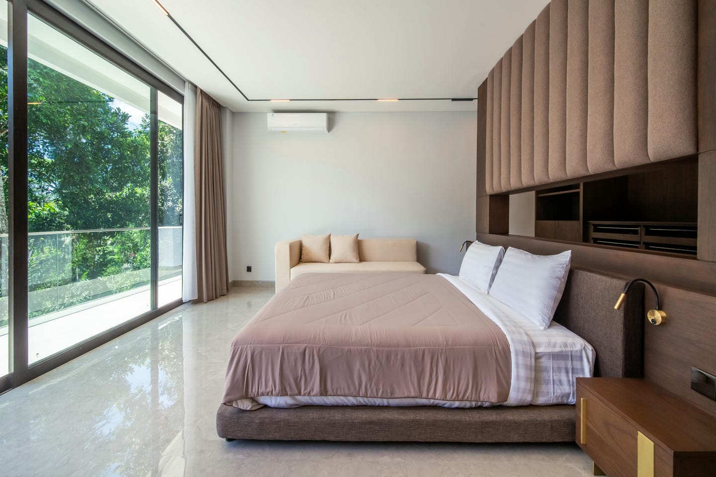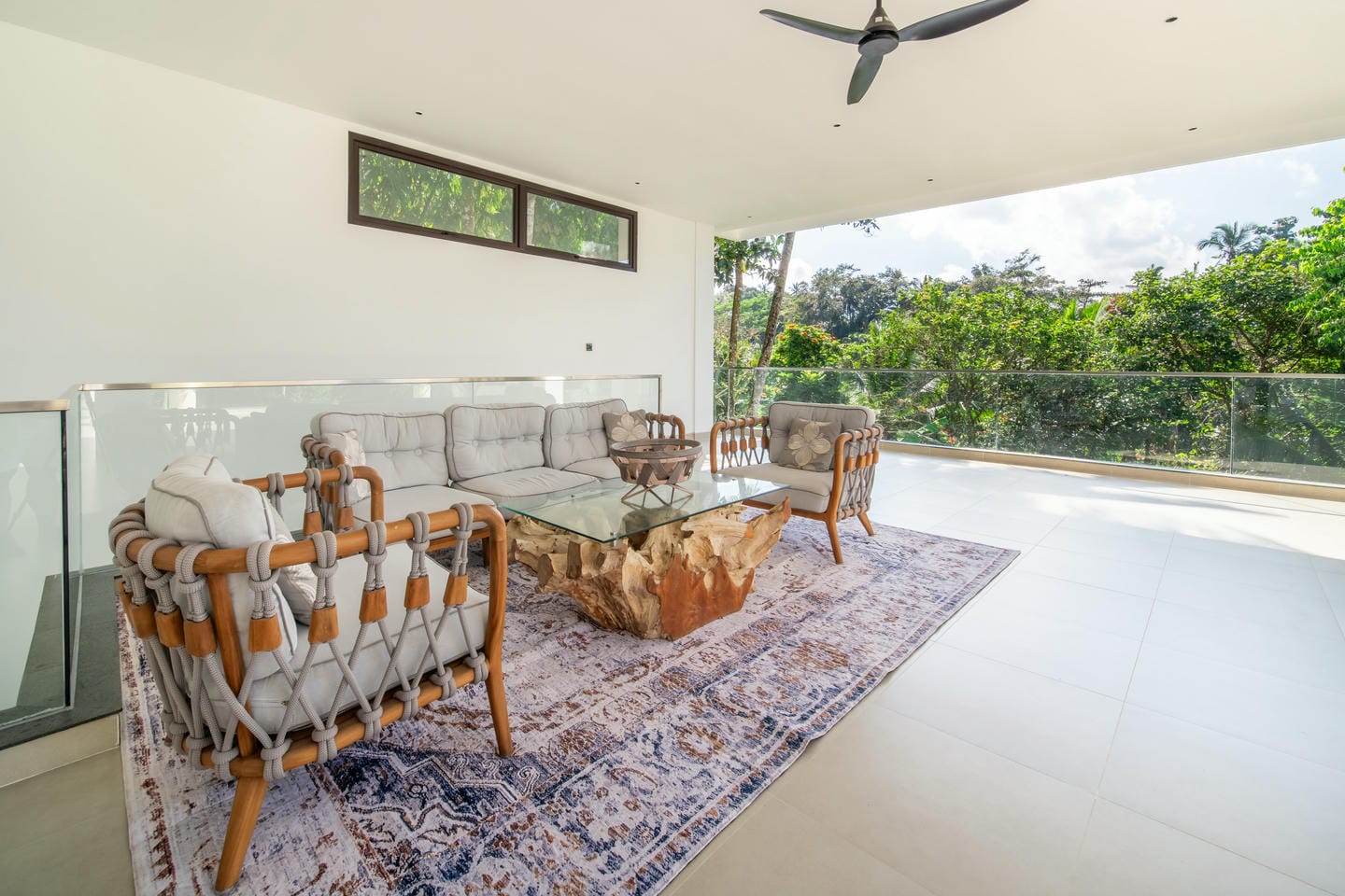 The outdoor area is designed for relaxation and entertainment with features such as a Sauna. A large private swimming pool sits at the center of the property, surrounded by an open terrace and tropical greenery. The villa enjoys beautiful views of lush trees and tropical surroundings, creating a calm and private ambiance that feels like a hidden retreat in nature.