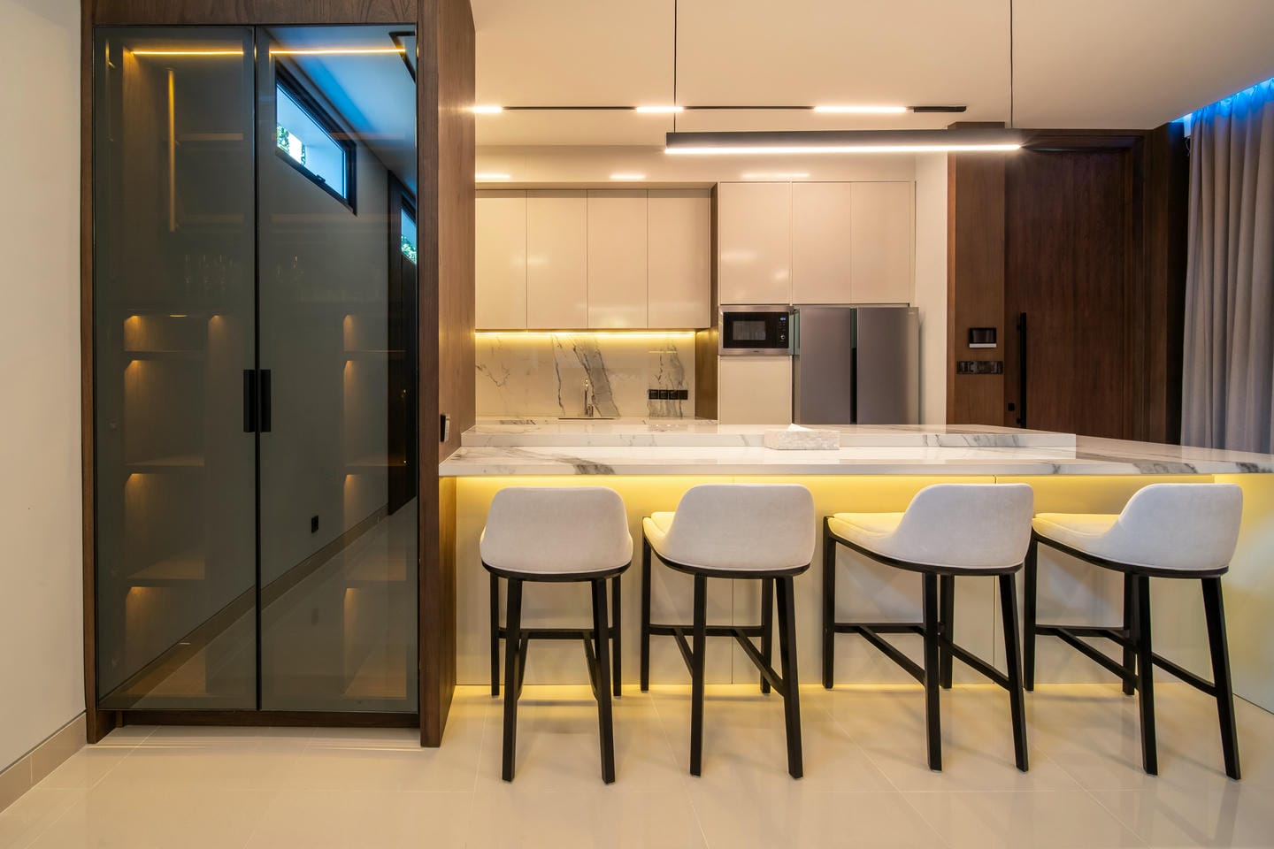 The villa features a two-storey design with 4 spacious bedrooms, showcasing a modern contemporary style. The interior is elegant and bright, highlighted by large glass windows that allow natural light to flow throughout the living areas. The living room features a stylish marble TV wall, comfortable seating, and a clean minimalist aesthetic that blends perfectly with warm wooden accents and high-quality finishes.