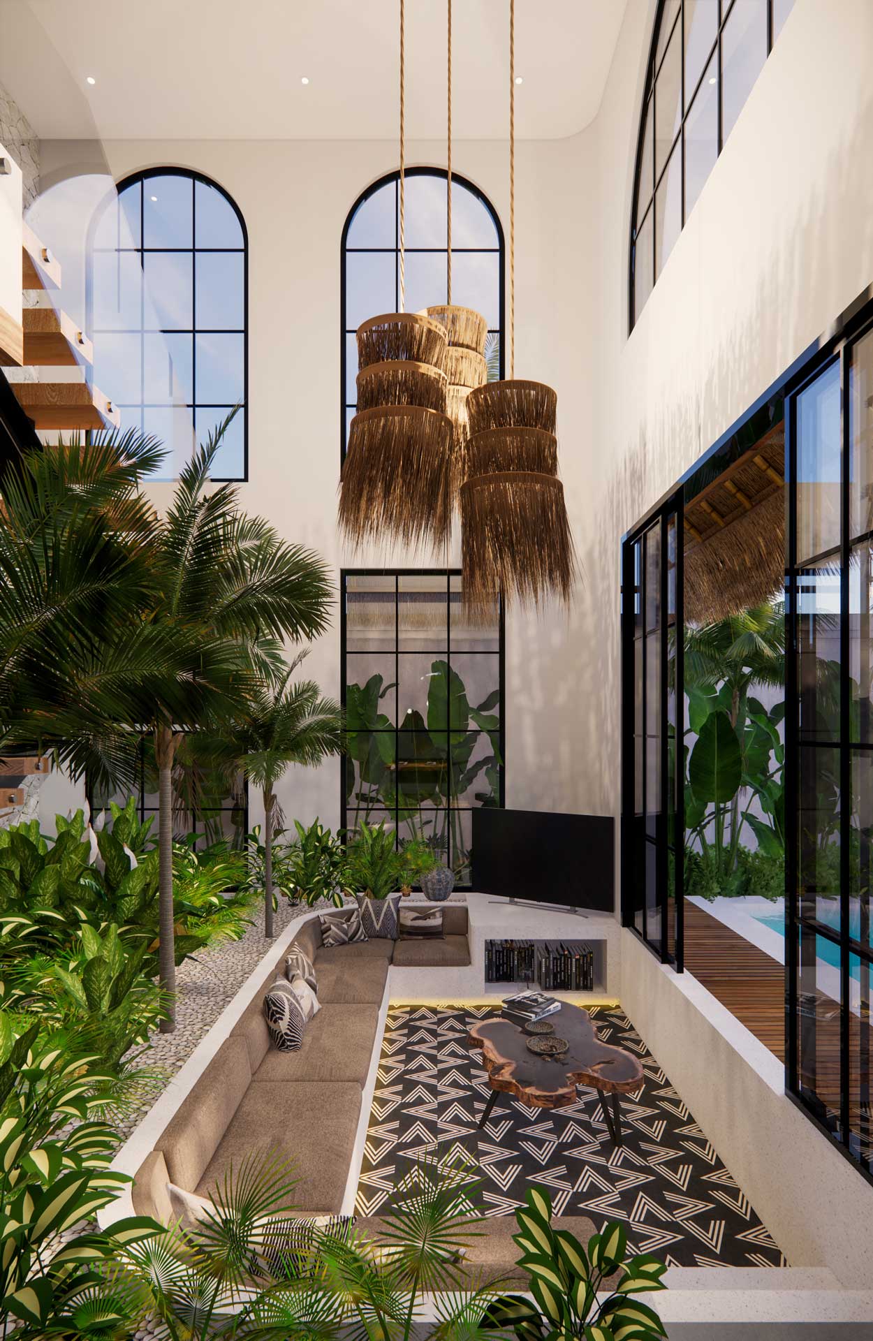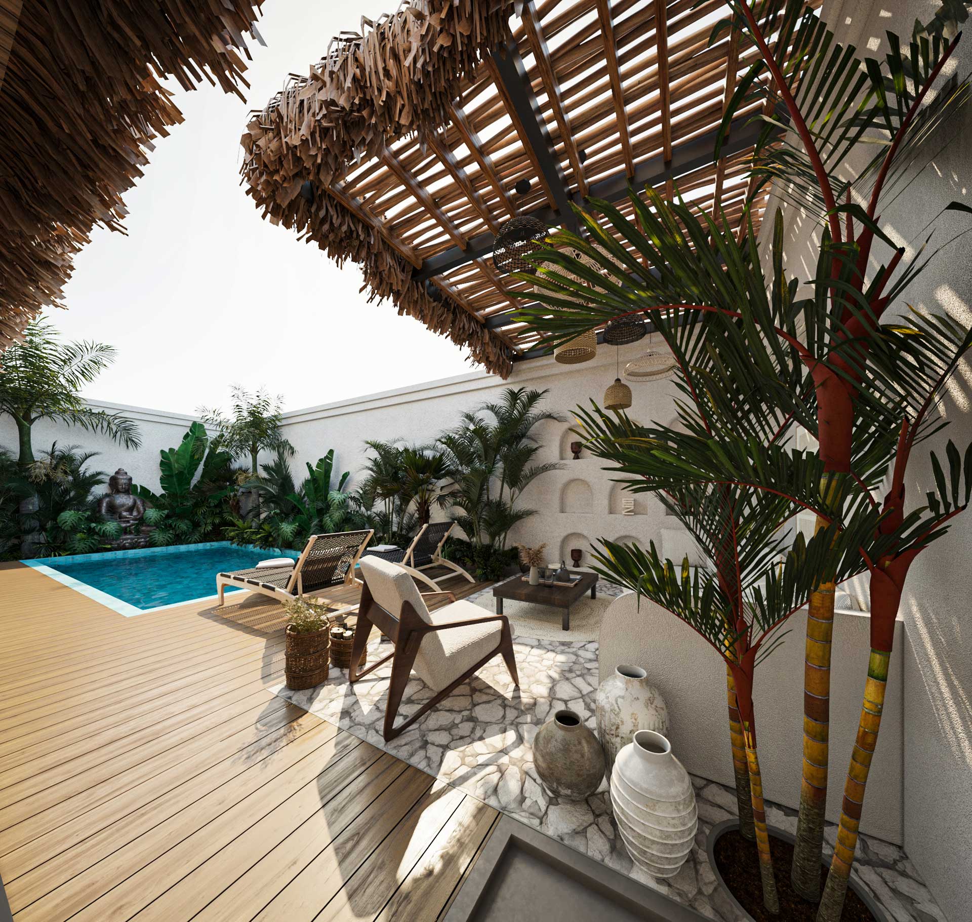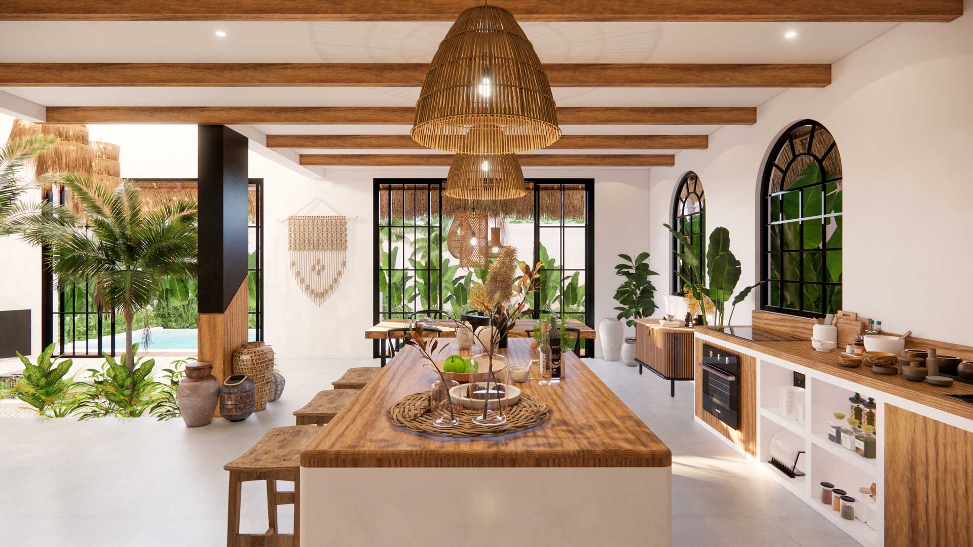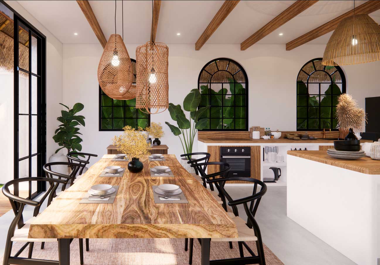 The villa boasts a modern tropical design with bohemian influences. Spanning 231 sqm building on a 190 sqm land plot, it showcases a sophisticated fusion of modern, tropical, and bohemian elements, creating an elegant and comfortable ambiance.