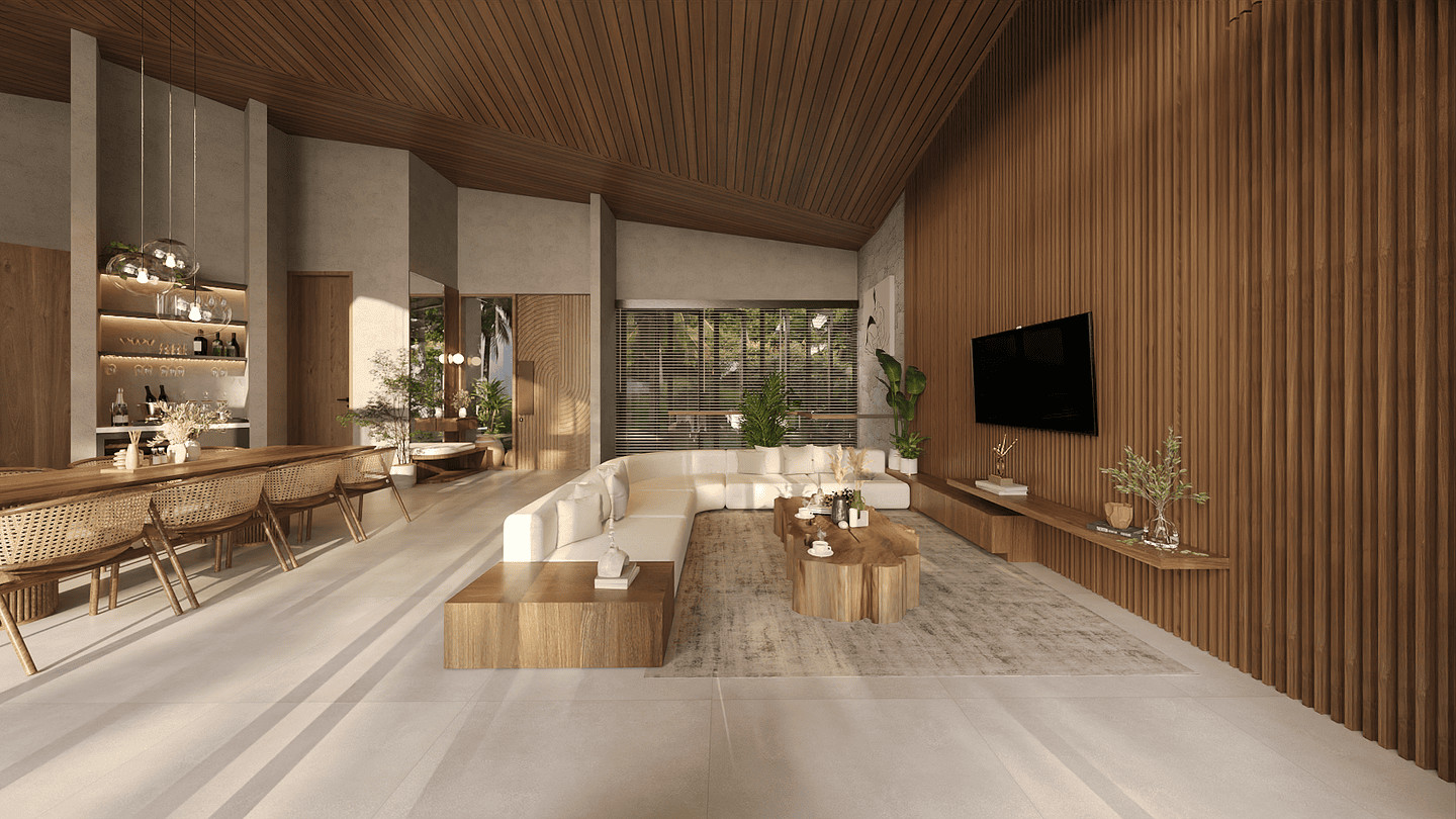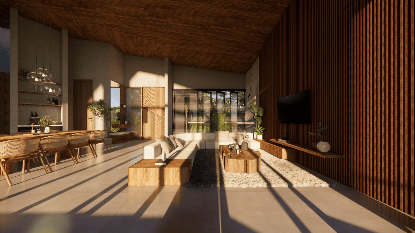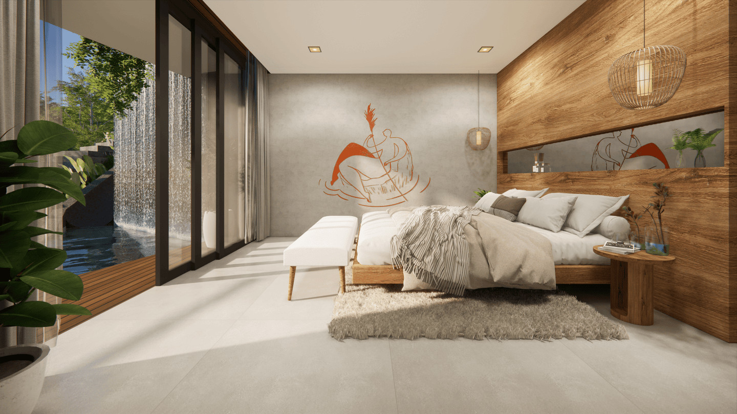 This villa features four bedrooms, including a spacious master suite with a walk-in wardrobe and sweeping panoramic views. The children’s rooms are thoughtfully designed to adapt over time—transitioning from playful, creative spaces into practical rooms for teenagers. An open-plan kitchen and dining area connect seamlessly to the outdoors, complemented by a pantry, laundry area, and convenient exterior dog wash. Bathrooms are crafted with natural textures and modern comforts, featuring double basins, open showers, and soft ambient lighting.