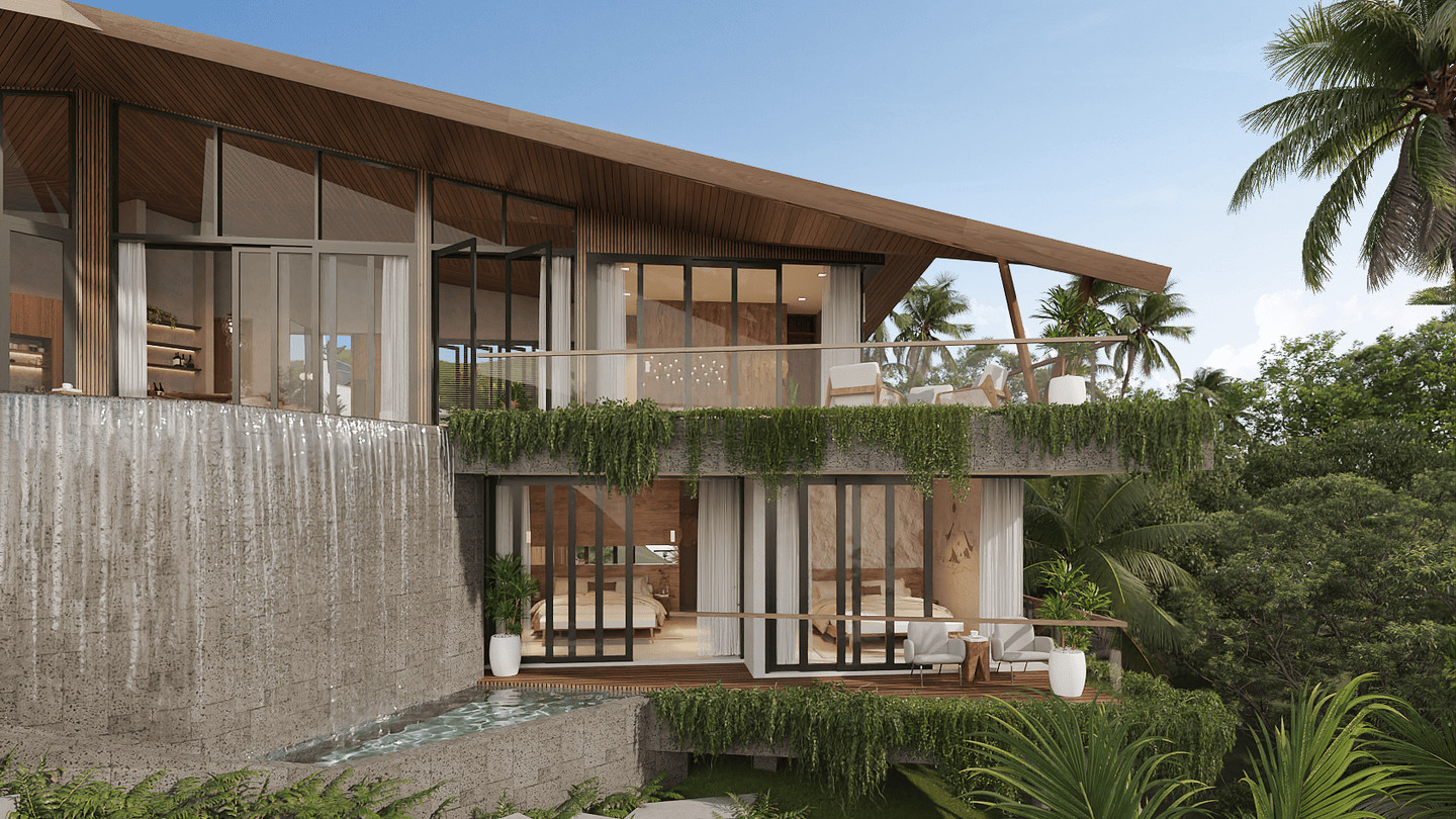 From the carport, a stone path leads through lush landscaping to a striking entrance marked by a sharp triangular feature. Inside, clean volumes and an open layout flow seamlessly toward a covered deck and angular infinity pool, where cascading water, integrated greenery, and an optional slide create a refined yet playful tropical setting.