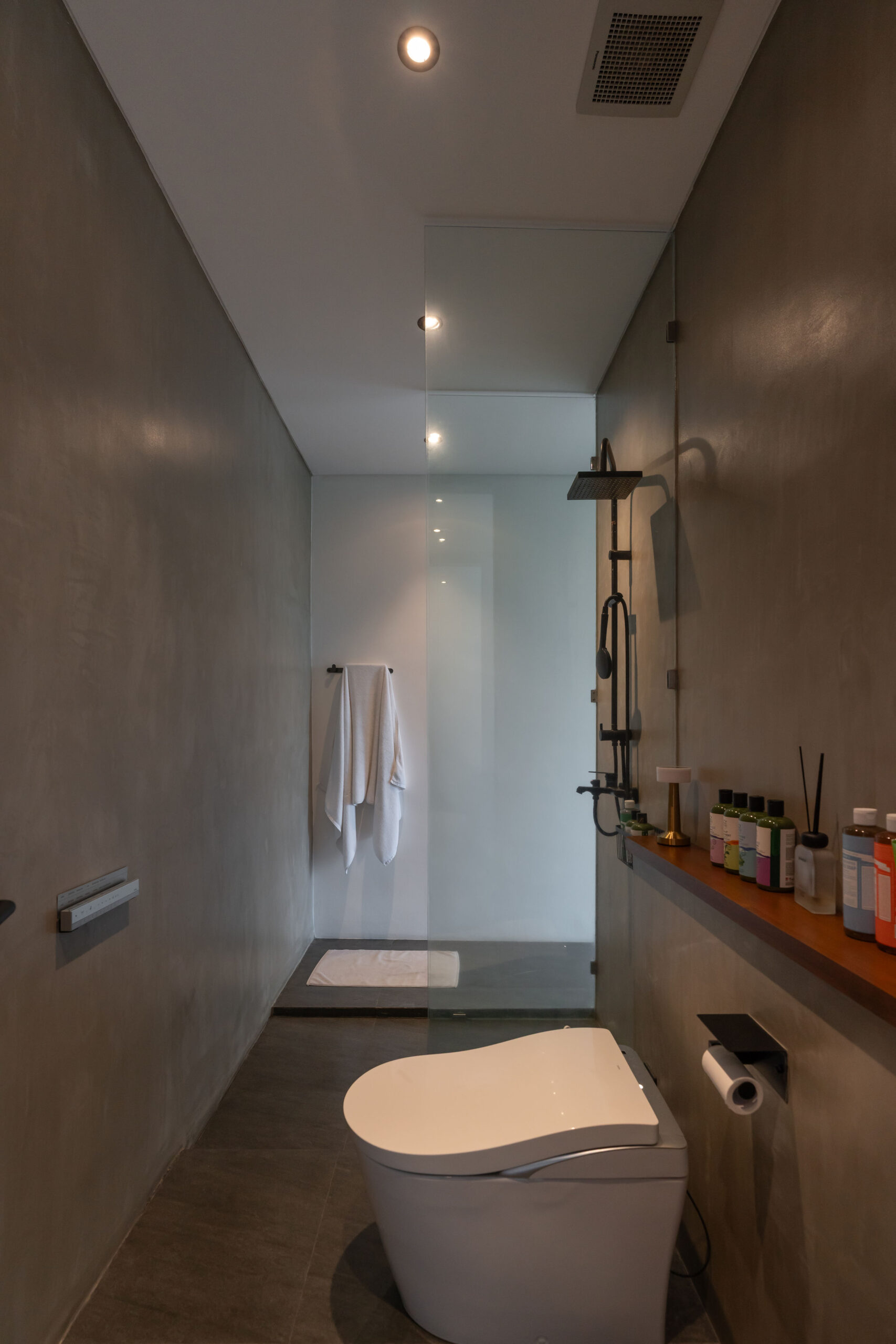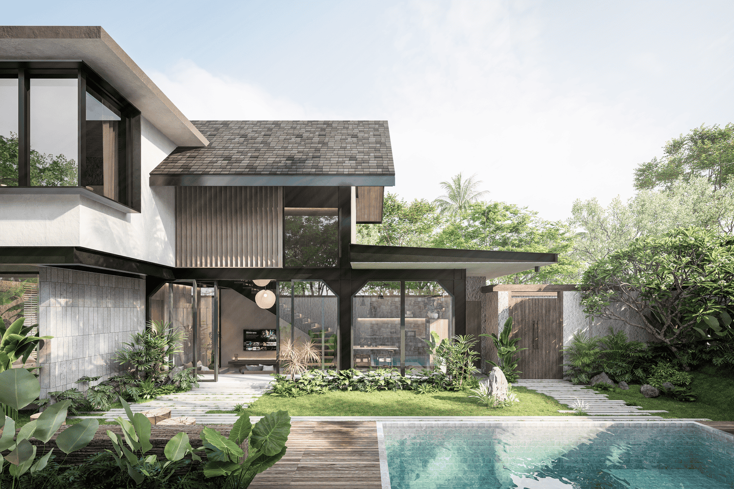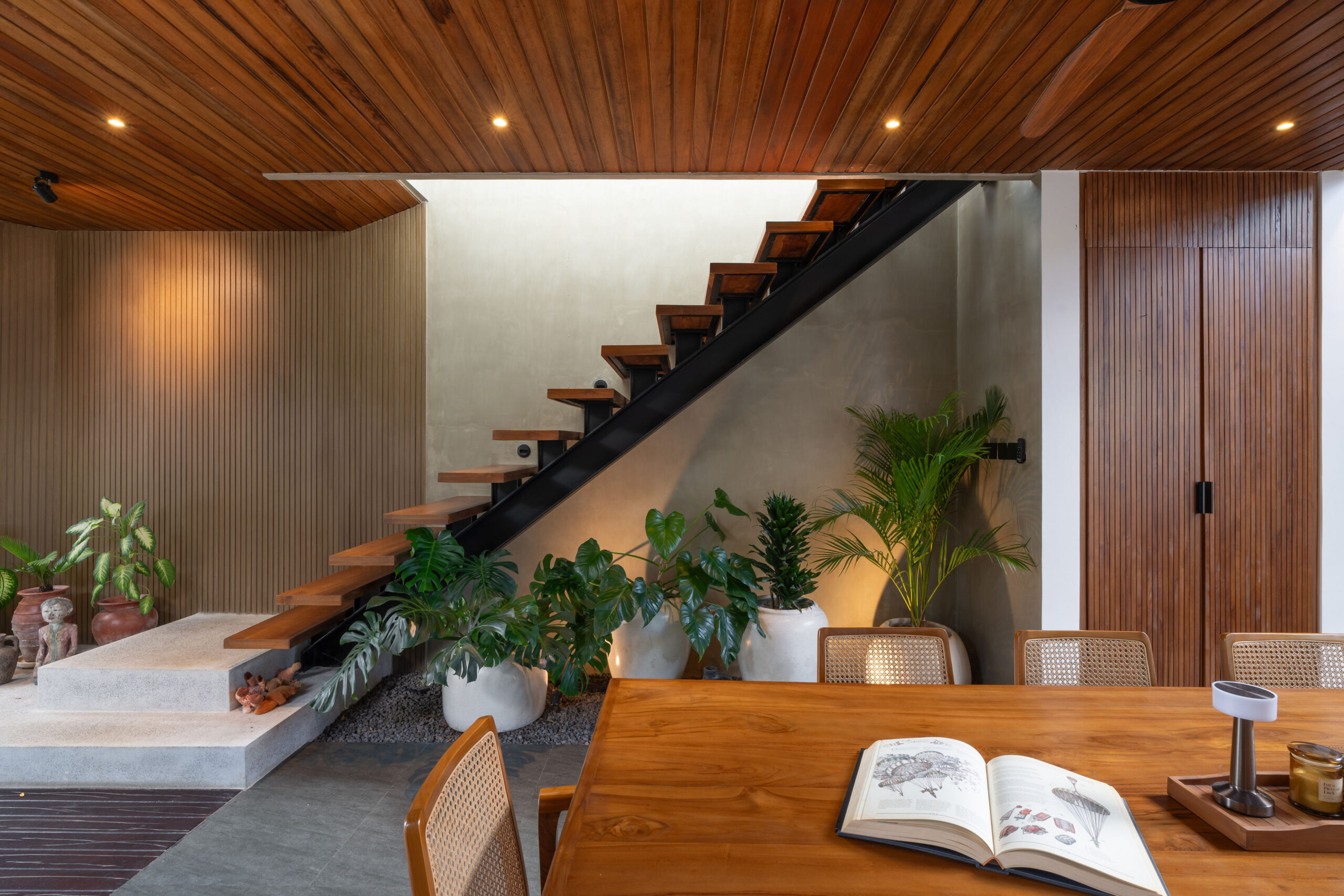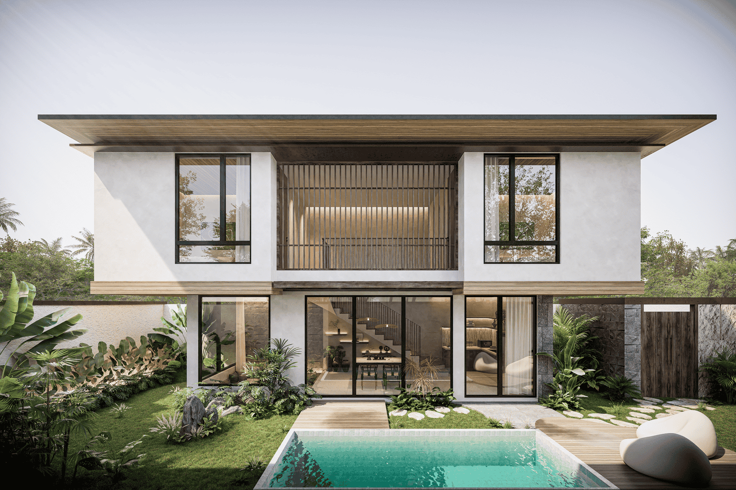 The interior showcases an architect-designed monolithic tropical modernism, blending raw textures with warm wood finishes and abundant natural light. This two-level villa features 4 spacious bedrooms and 6 bathrooms, with an open-plan living and dining area, statement floating staircase, and curated design elements that create a refined yet inviting atmosphere. A strong wellness focus is integrated with dedicated spaces for a gym, sauna, and ice bath.