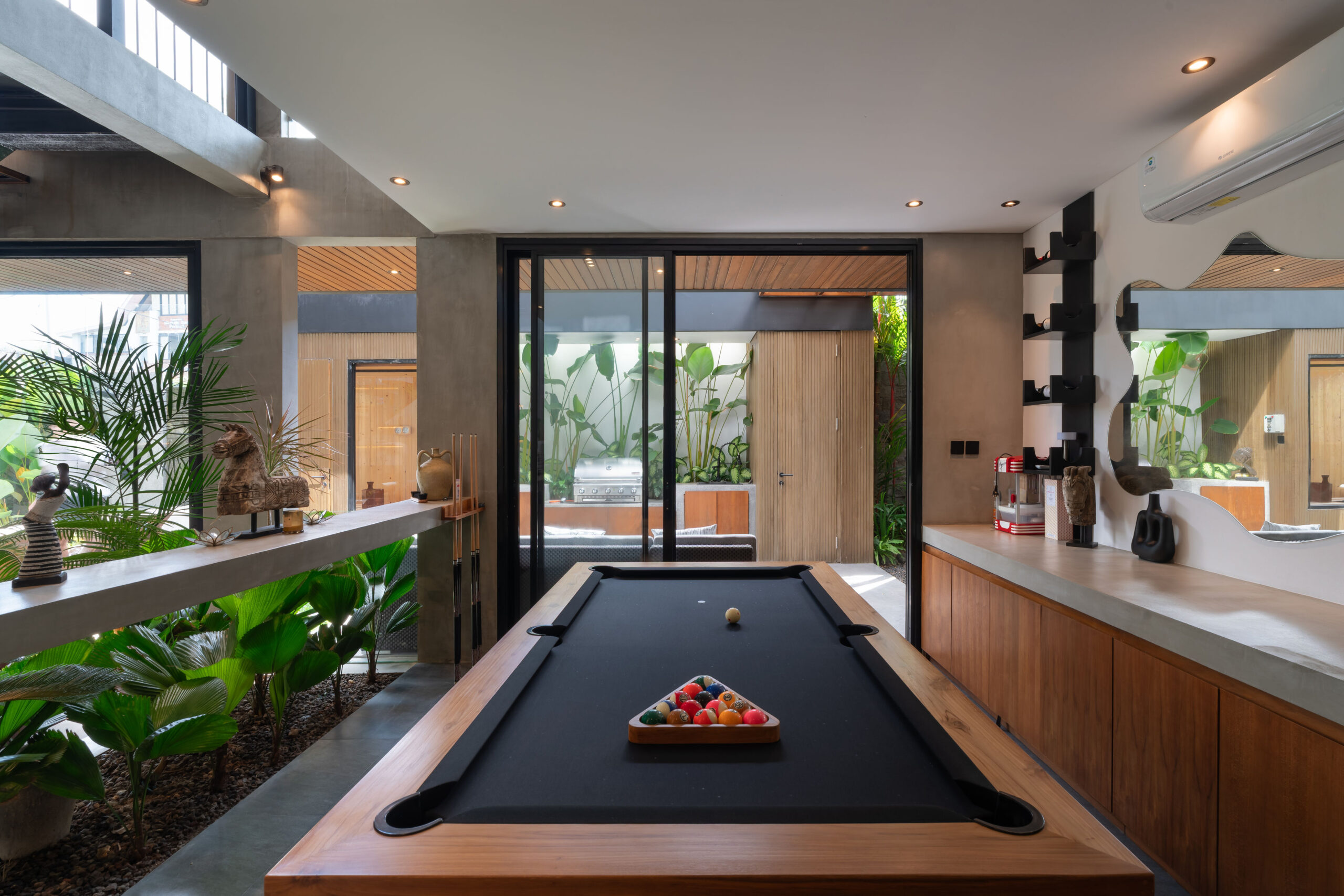 Outdoors, the villa opens to a serene private pool surrounded by lush greenery and uninterrupted green zone rice field views, ensuring long-term visual openness. The seamless indoor-outdoor connection enhances the tropical lifestyle, with sun loungers, an outdoor shower, and intimate relaxation corners.