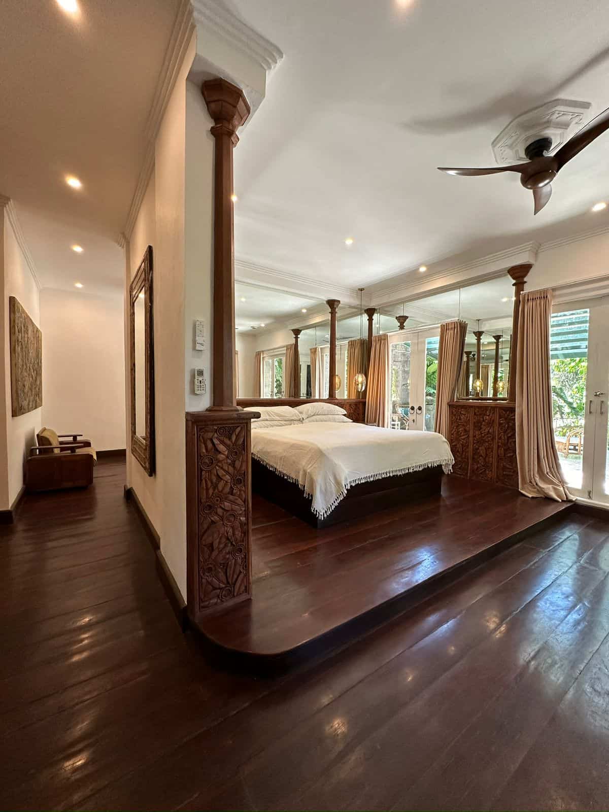 A 300-year-old Kalimantan ironwood walkway leads you into the heart of the villa, where a newly constructed timber living area overlooks the river, blending rustic charm with modern luxury. The villa boasts six spacious ensuite bedrooms, including a luxurious riverfront apartment ideal as a separate owner’s residence.