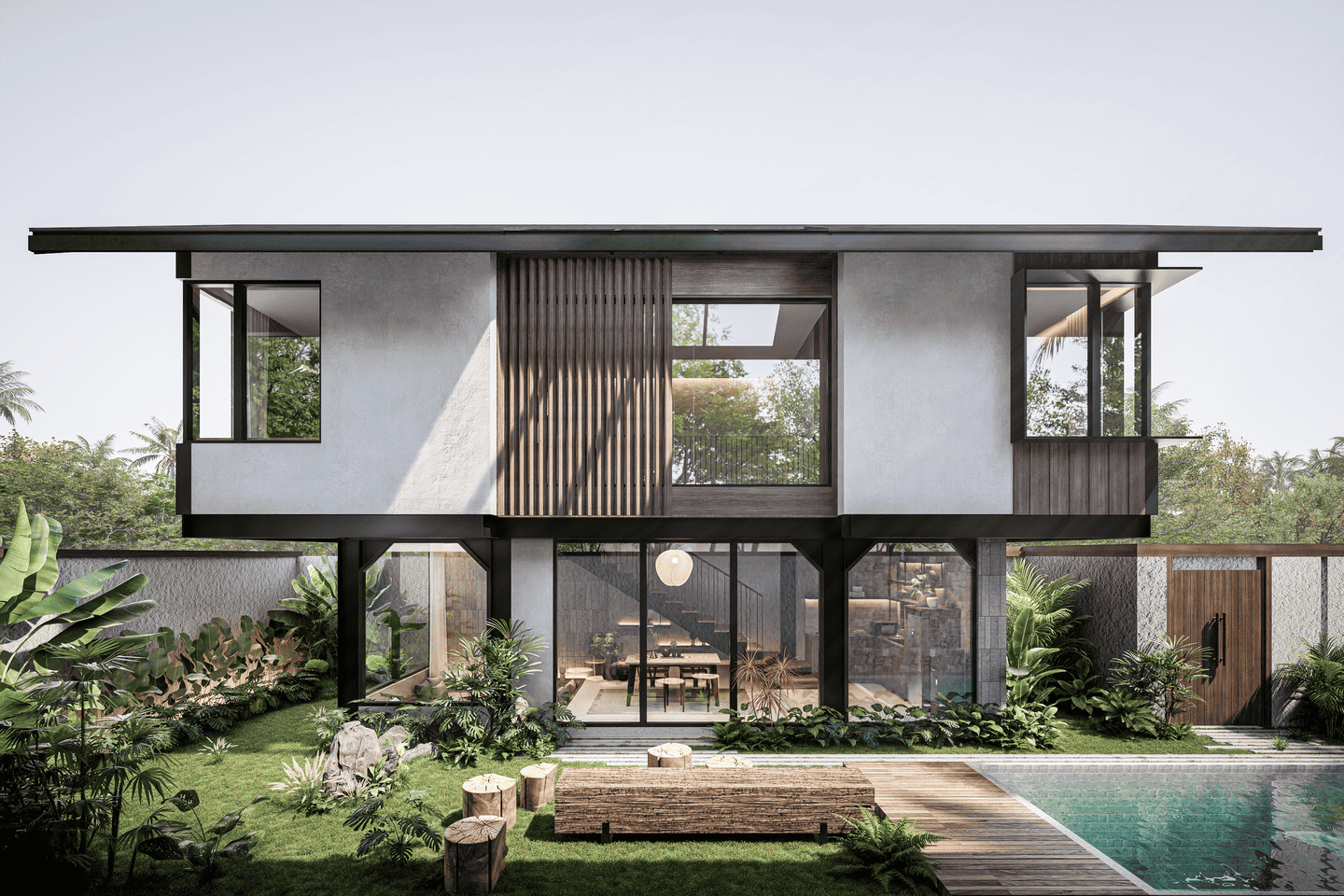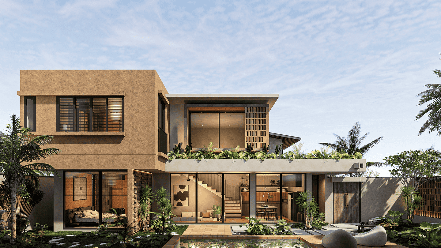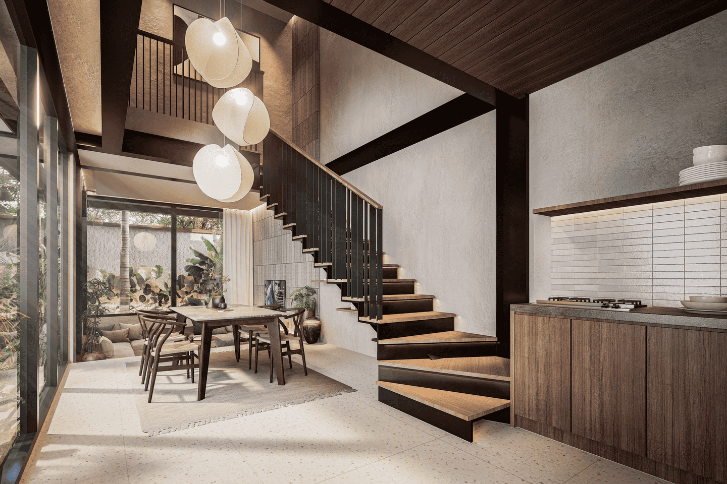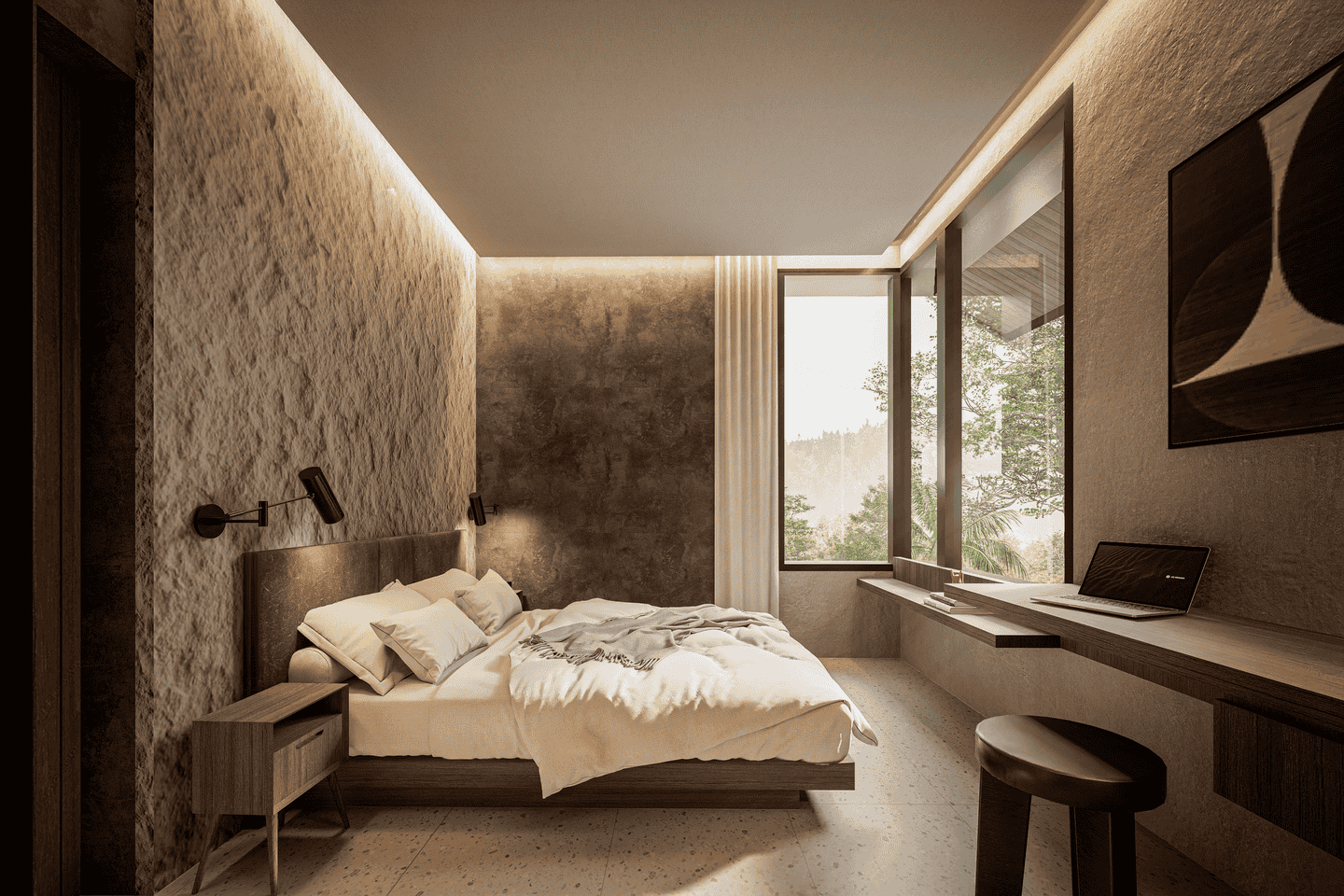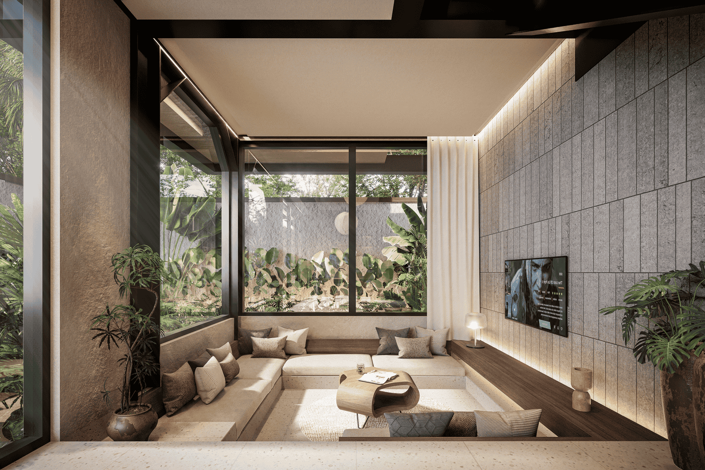 Step inside to an industrial-meets-natural design concept. The interiors are thoughtfully designed with a mix of exposed textures, natural stone, rich wood tones, and modern minimalist furniture. High ceilings and large windows invite natural light in, enhancing the cozy yet sophisticated ambiance. This villa blends raw materials with refined craftsmanship—perfect for modern living or holiday escapes.