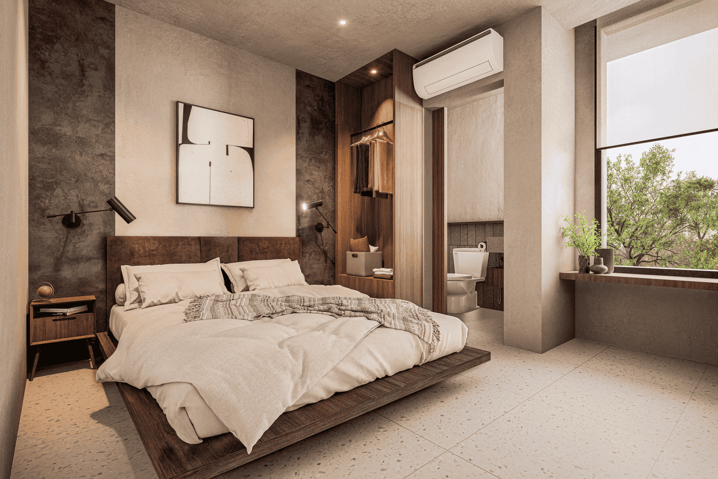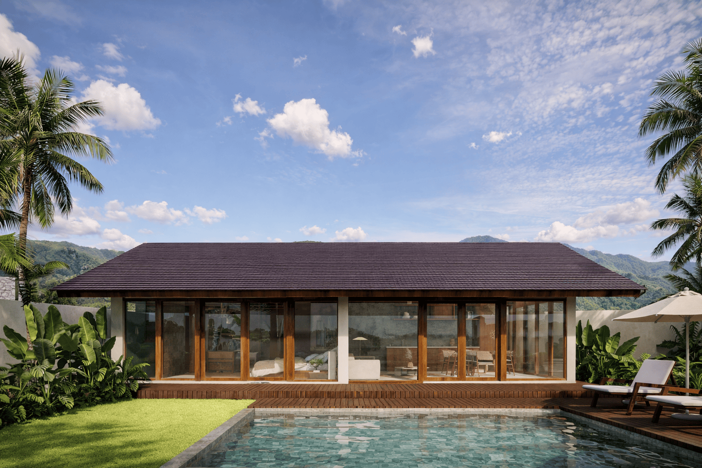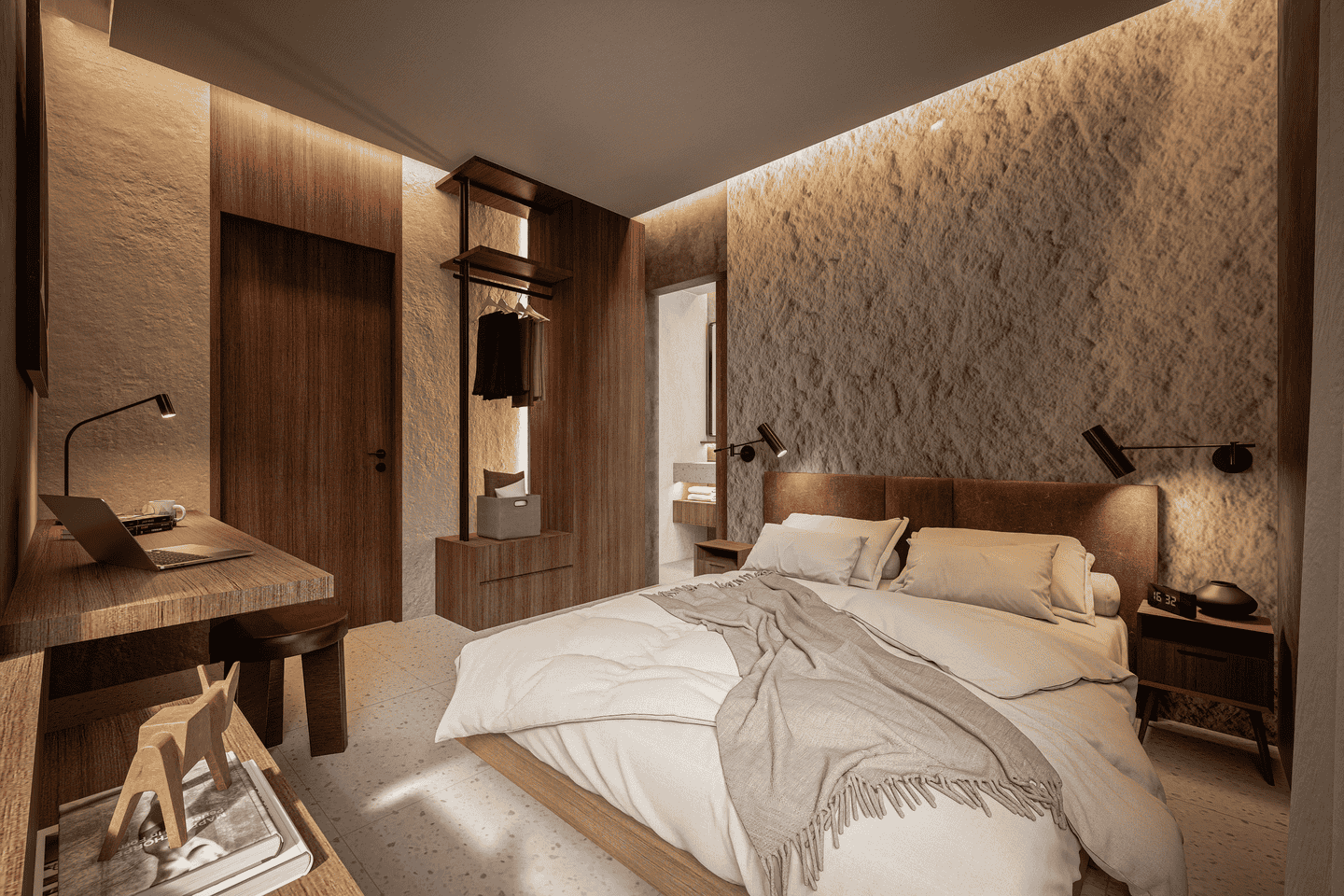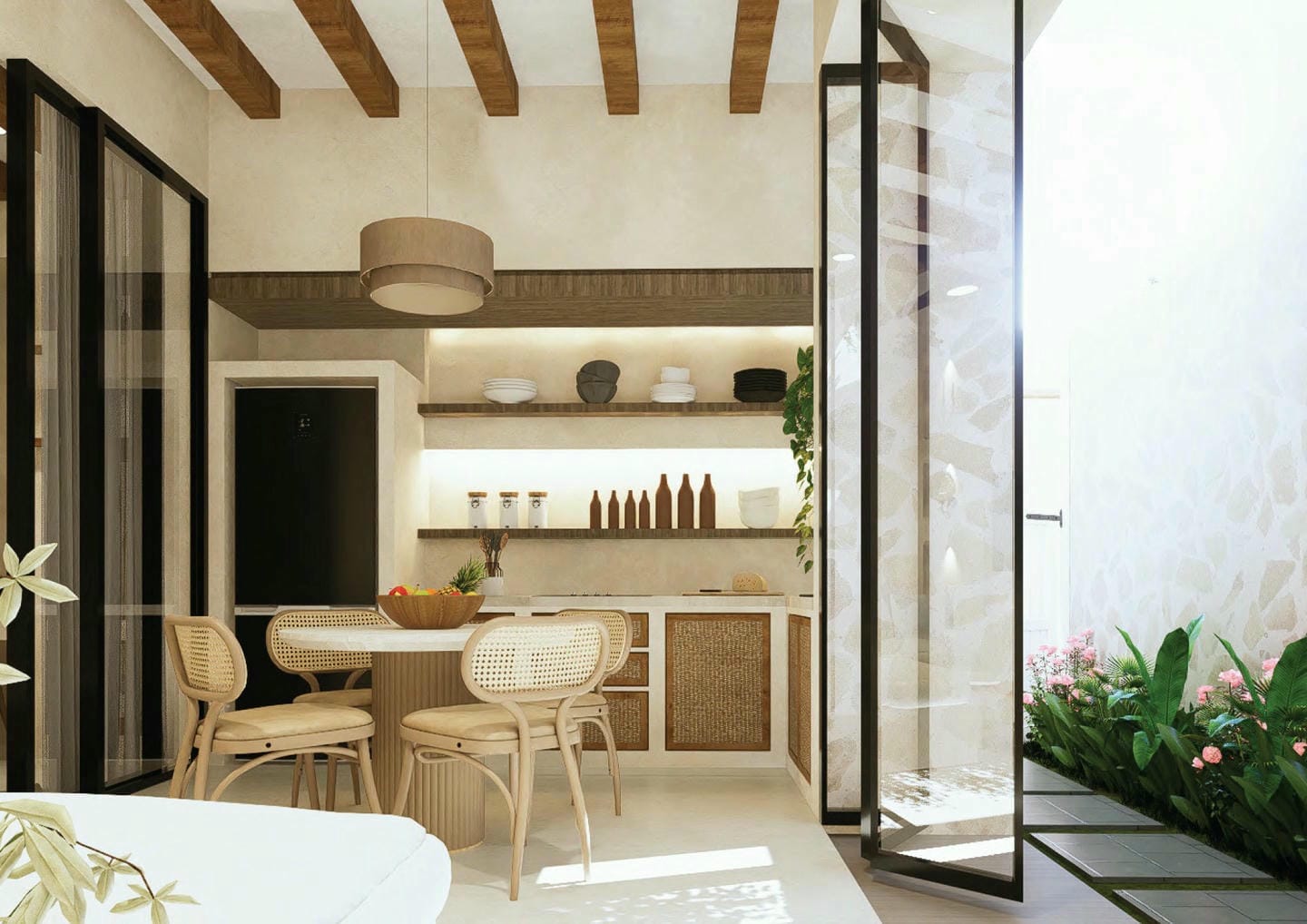 Step inside to an industrial-meets-natural design concept. The interiors are thoughtfully designed with a mix of exposed textures, natural stone, rich wood tones, and modern minimalist furniture. High ceilings and large windows invite natural light in, enhancing the cozy yet sophisticated ambiance. This villa blends raw materials with refined craftsmanship—perfect for modern living or holiday escapes.