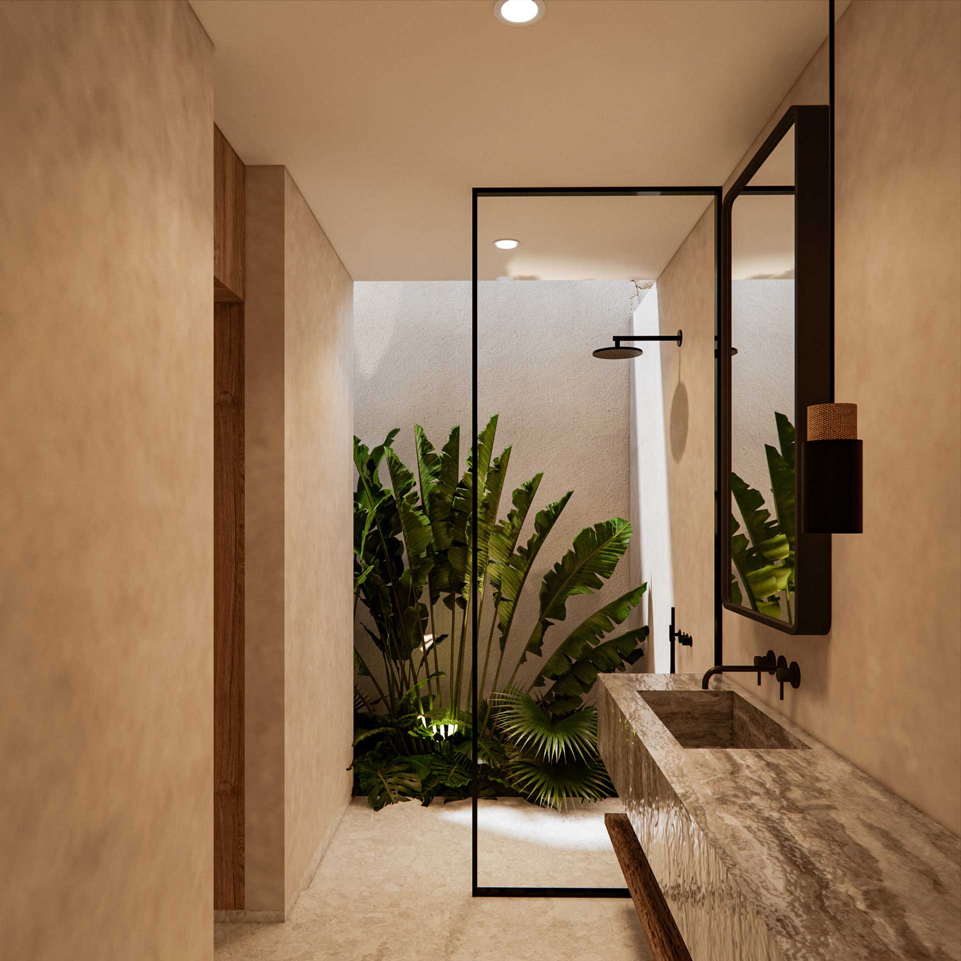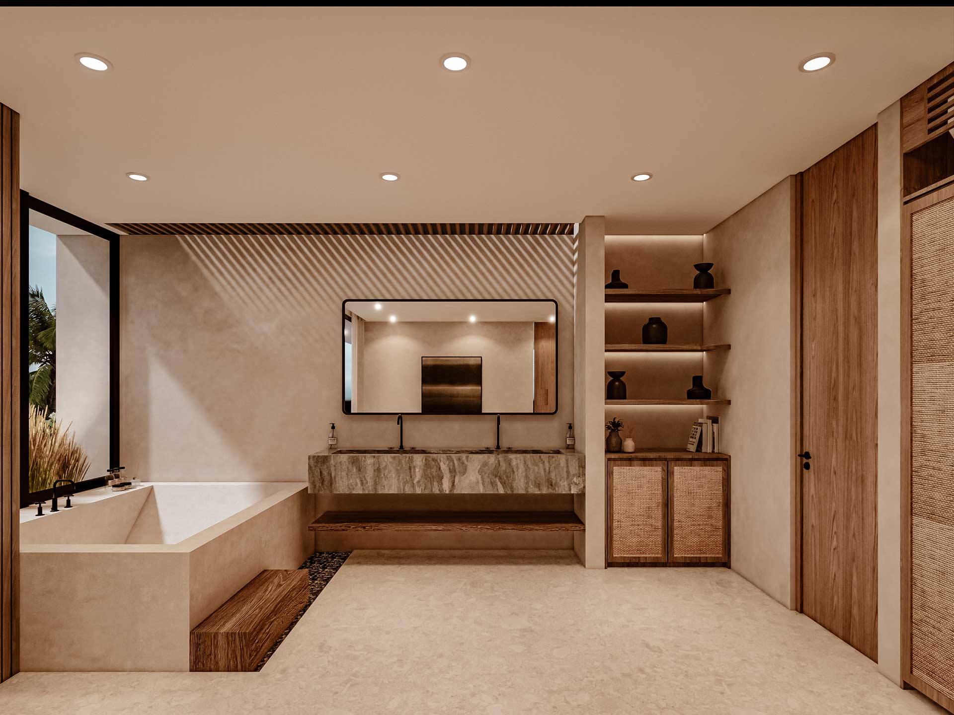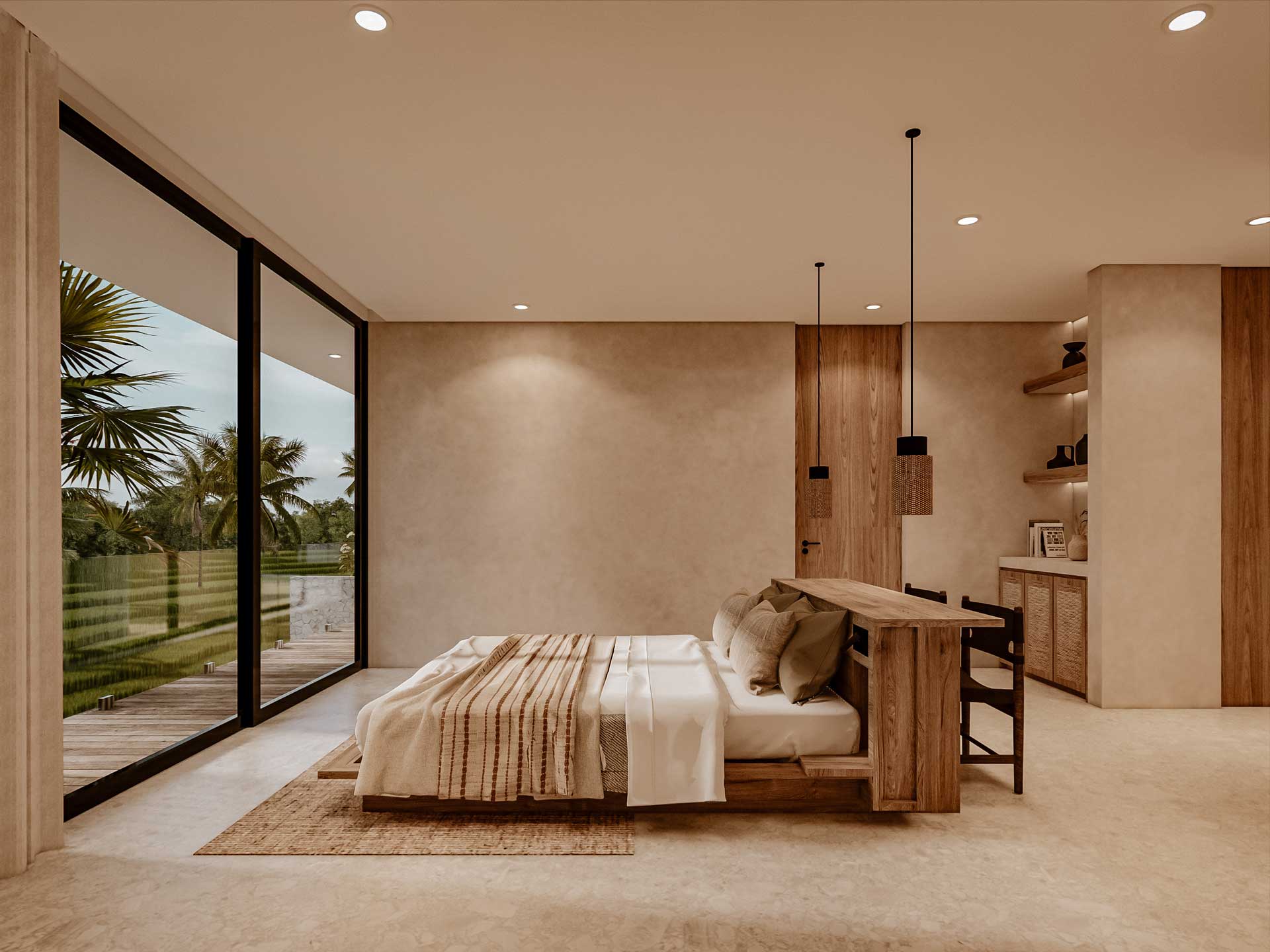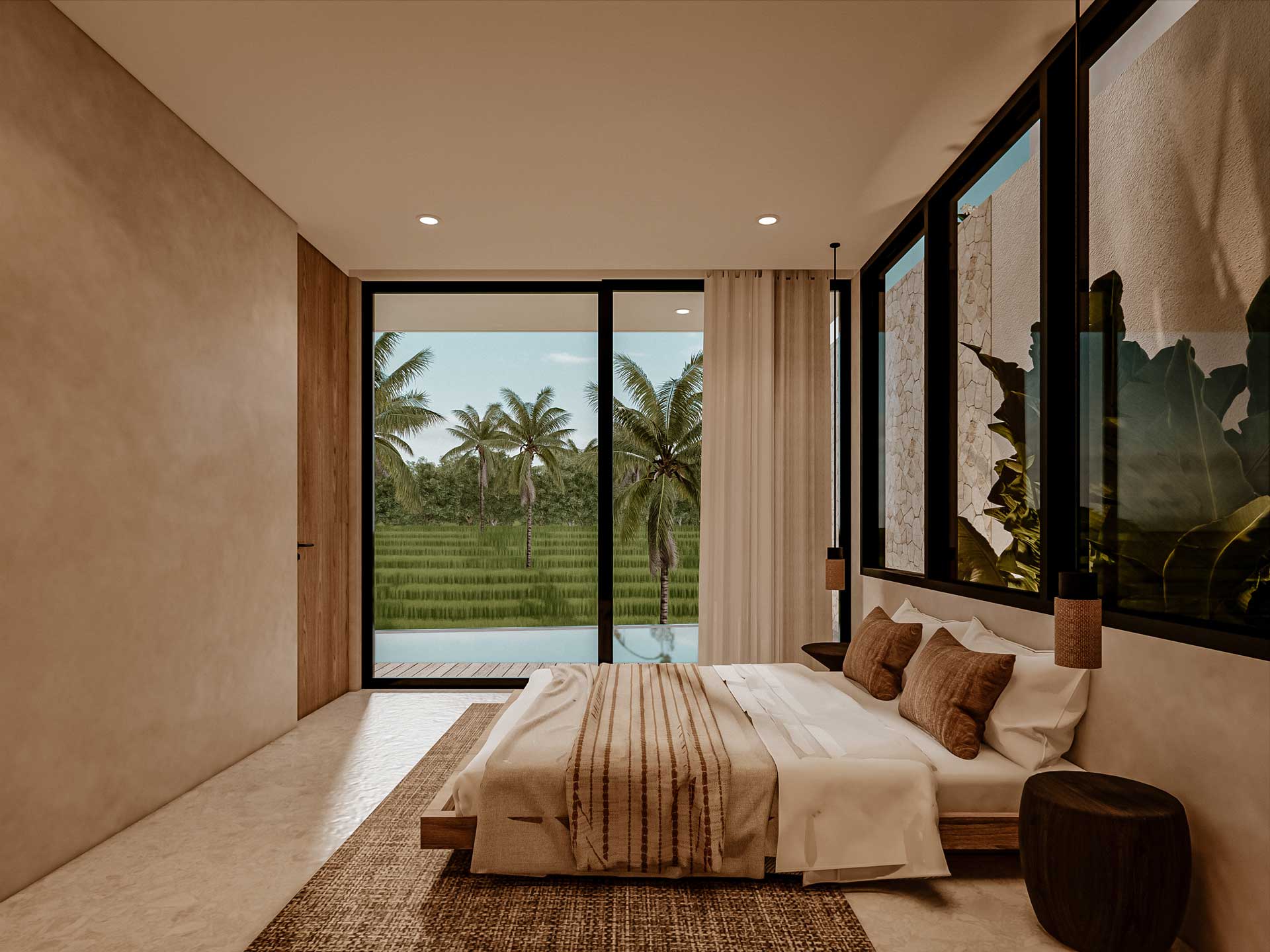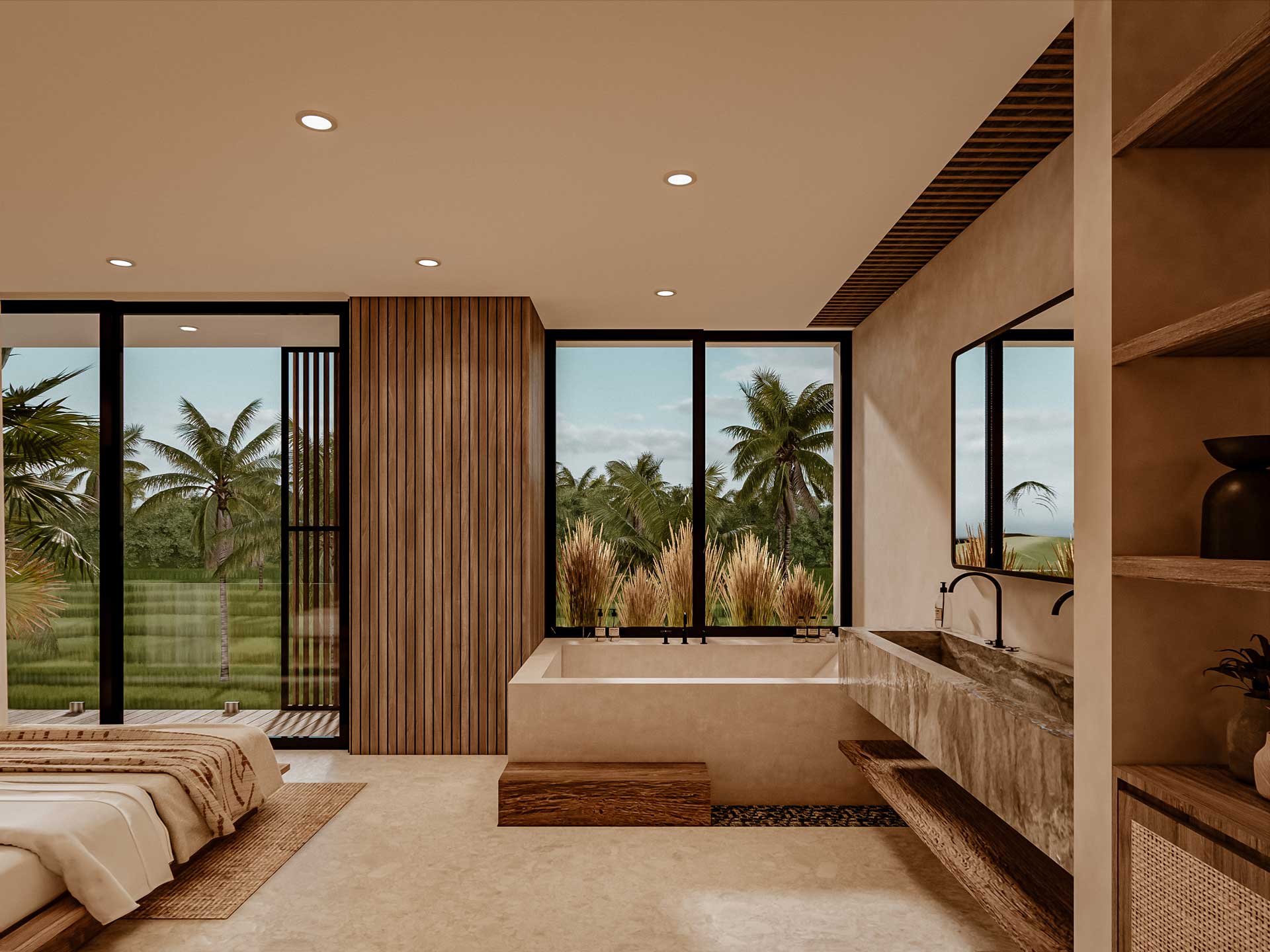 - Second Floor: Features two bedrooms with balconies. The master bedroom includes a luxurious bathtub with a view of the rice paddies.