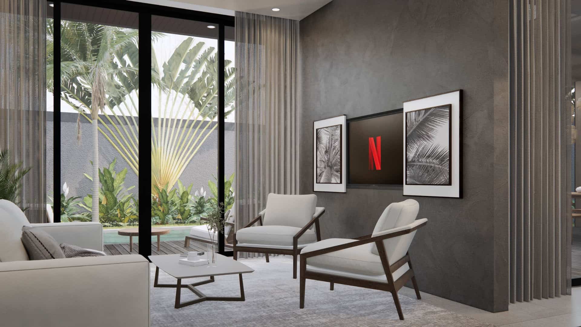 - Living Room: Sunken, sophisticated design