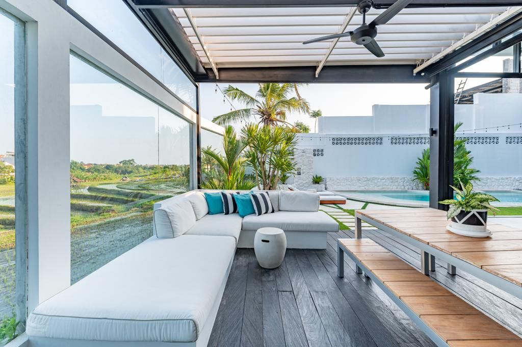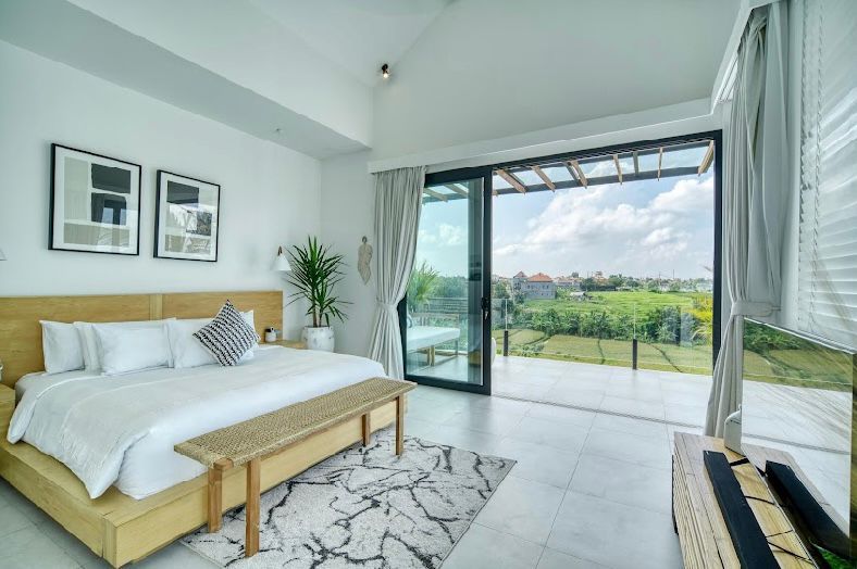 For added convenience, there’s a laundry room with a washing machine. Outside, you’ll discover a dining and seating area with views of the pool, as well as an outdoor gazebo with a built-in BBQ at its center. From the two-story vantage point, you can enjoy views of the rice fields.