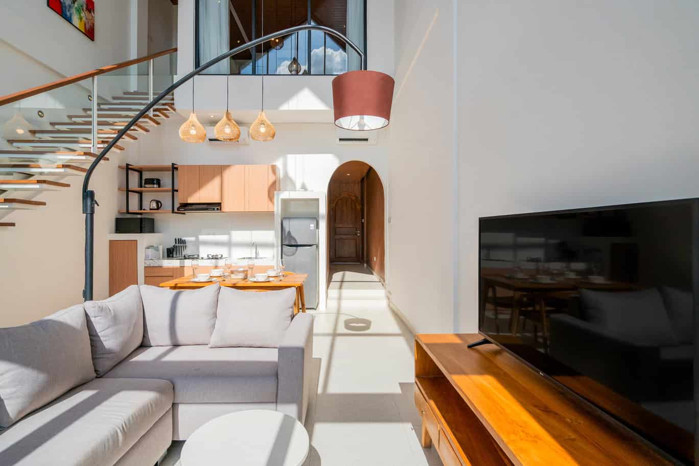- Expansive Living Area: The expansive high-ceiling living area sets the stage for memorable gatherings and moments of relaxation, making it an ideal space for entertaining family and friends.