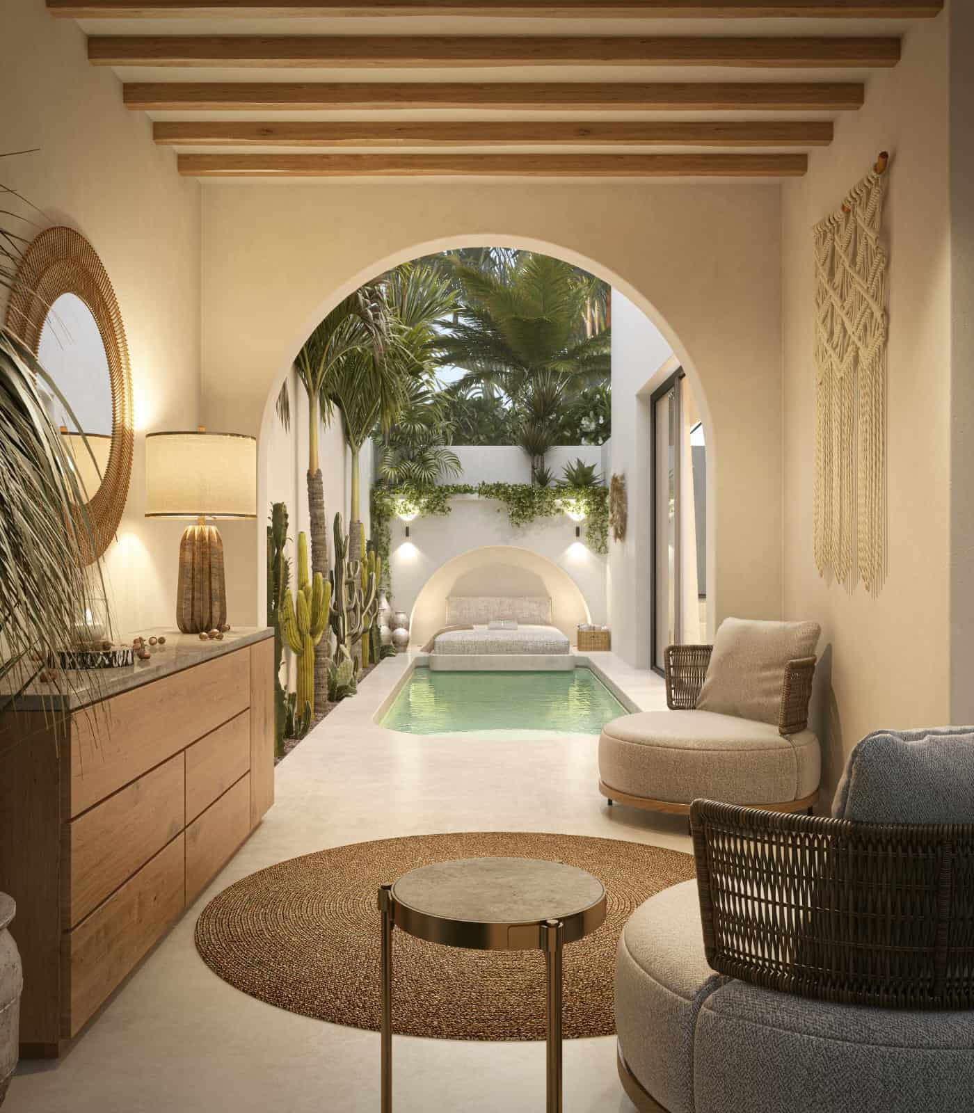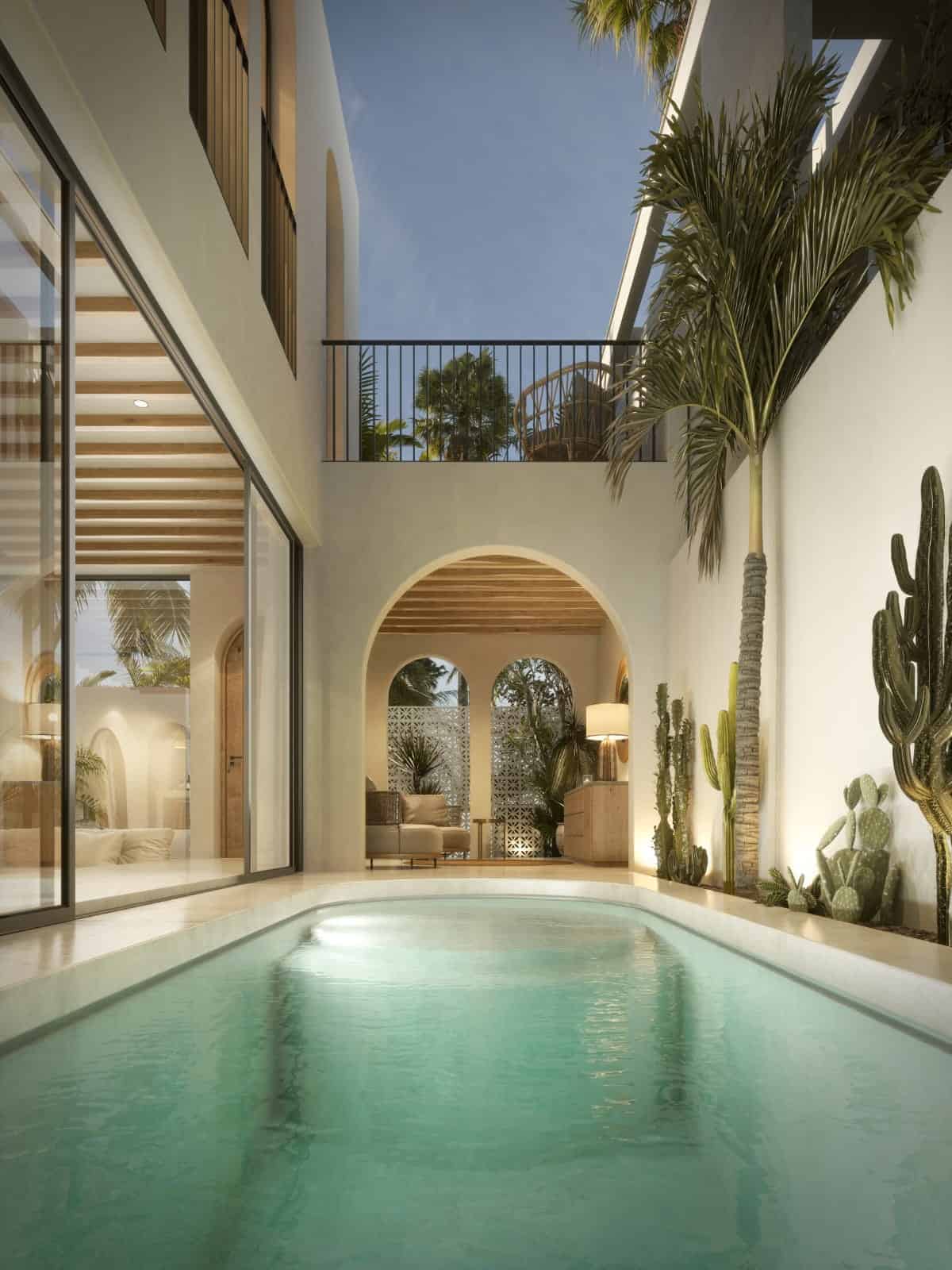 - Sophisticated Living Space: Spanning 92 sqm across two levels with solid off-white stone flooring, the villa is set on a 123 sqm plot surrounded by lush green cactus plants, offering a secluded refreshing pool downstairs for full privacy.