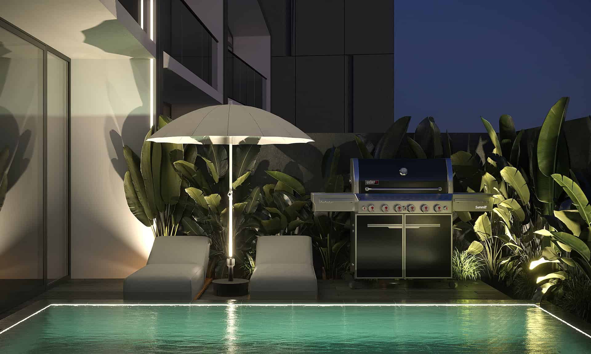 - Outdoor Sanctuary: Step into the outdoor sanctuary adorned with a sparkling pool, inviting lounge area, and lush tropical garden.
