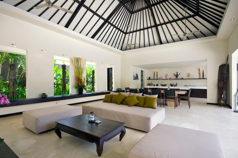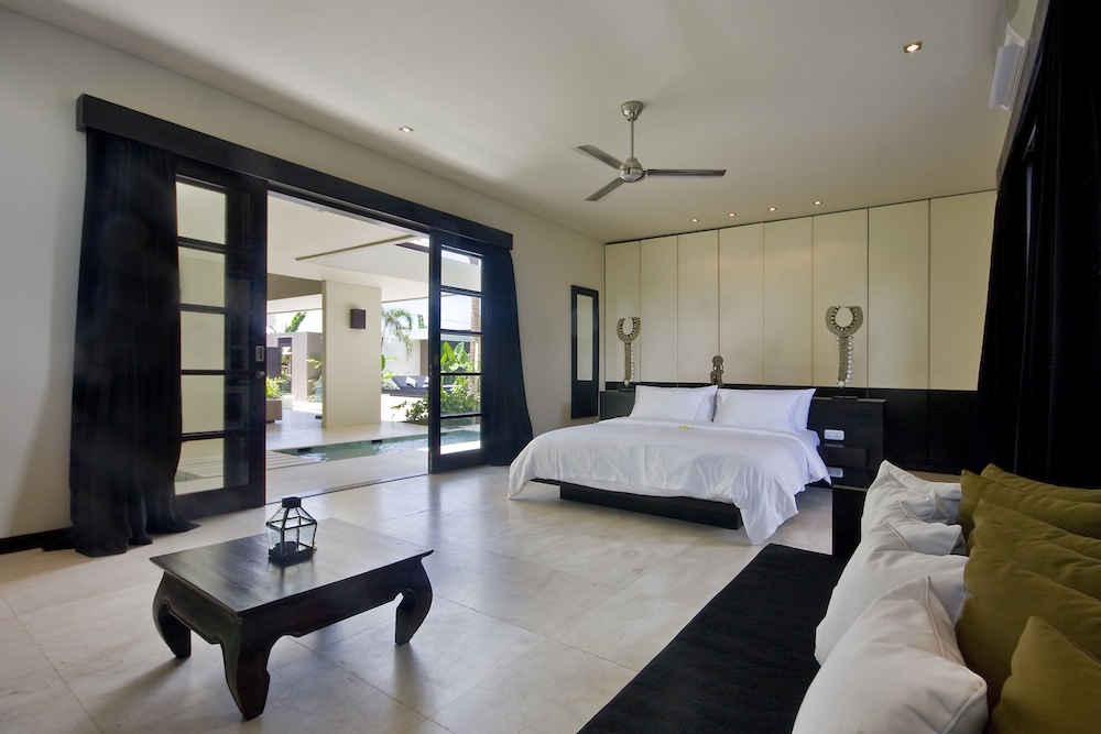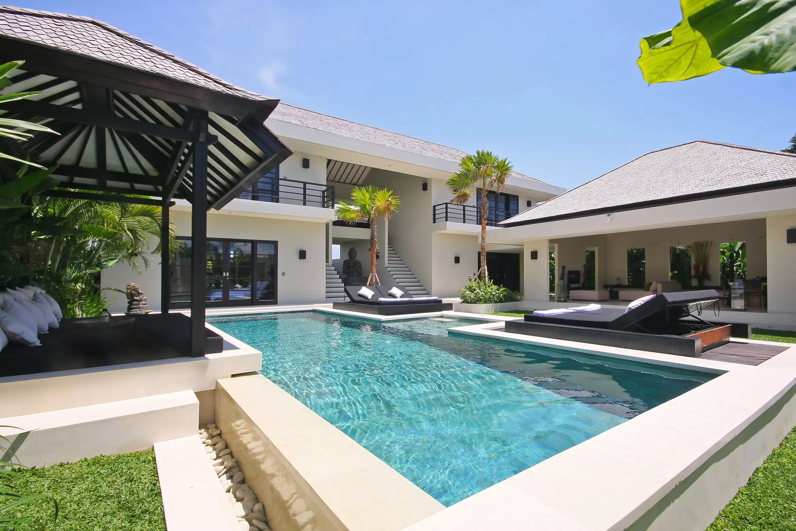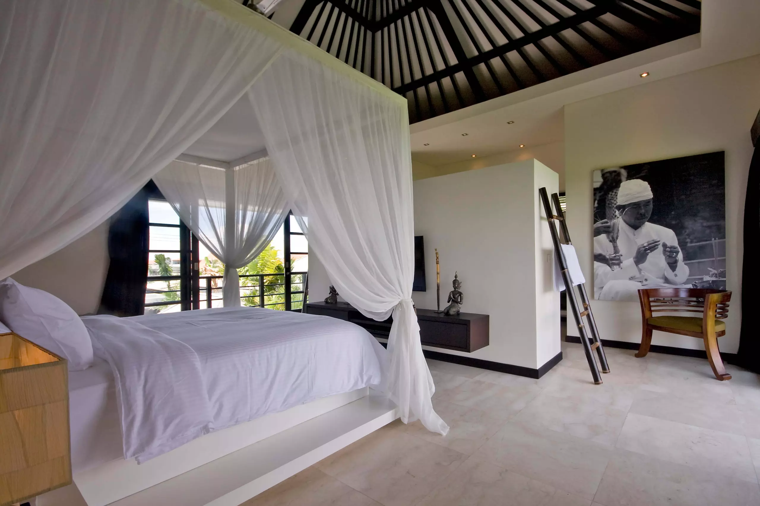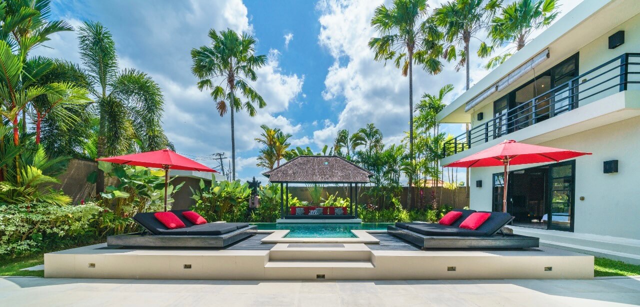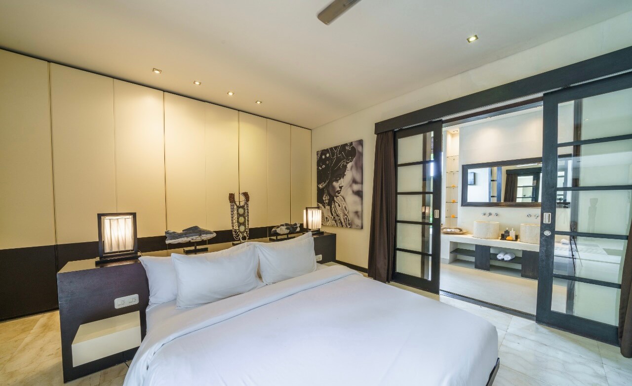Outside, a pool takes center stage, embraced by lounge chairs and a daybed for moments of pure relaxation. The villa’s true charm lies in the second-floor balcony, offering a view of Bali’s iconic rice fields.