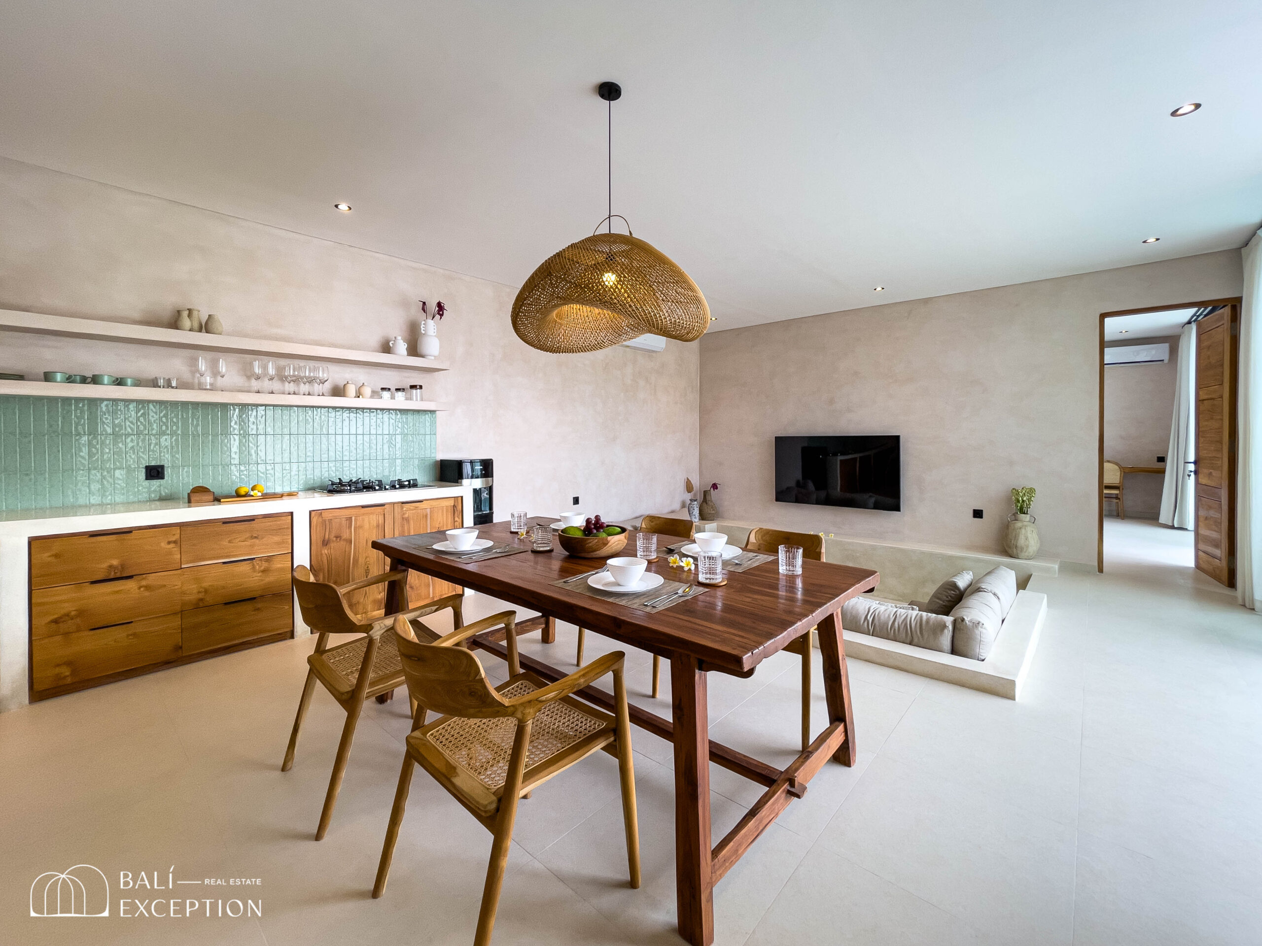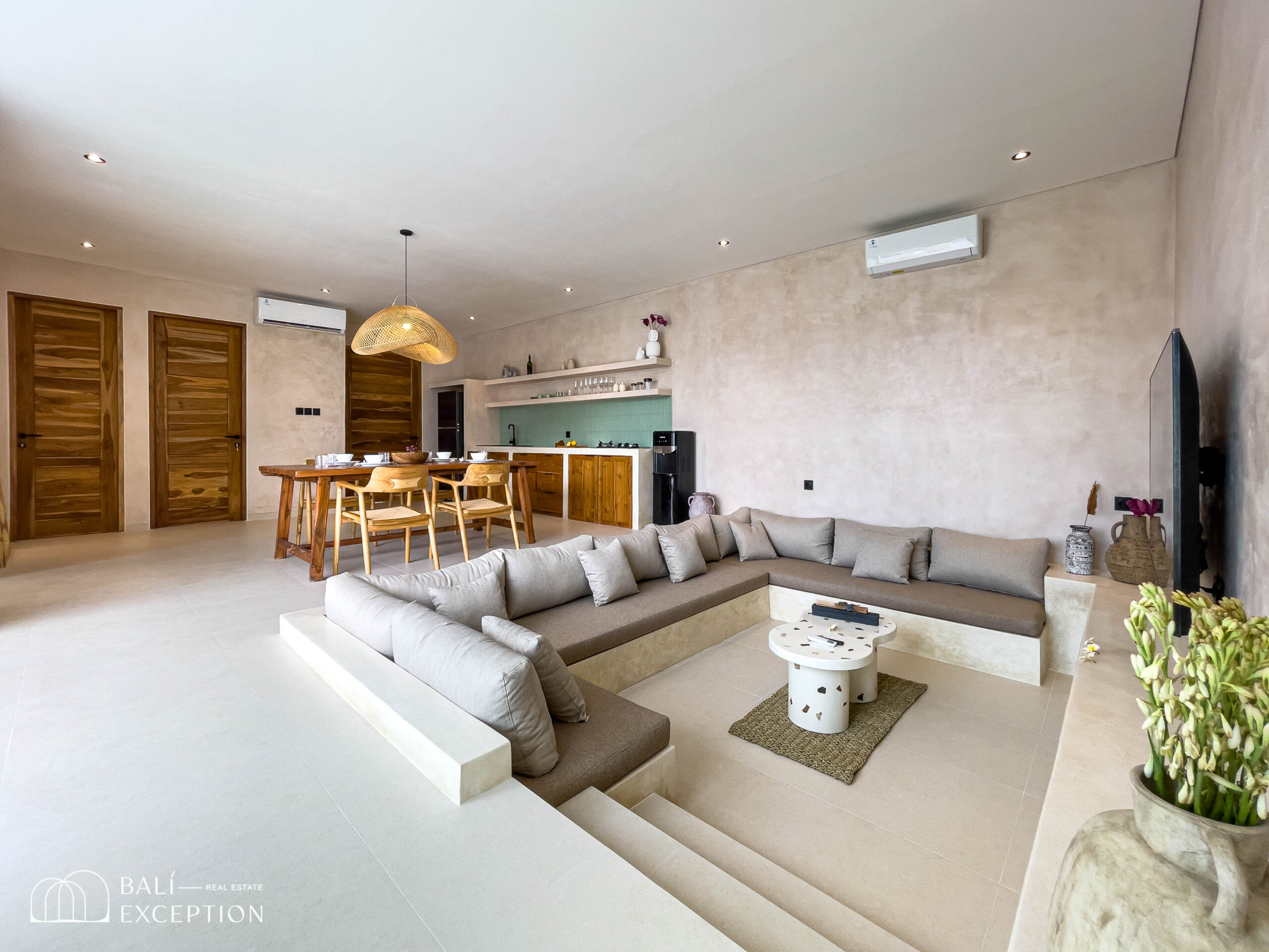The villa’s contemporary design, with clean white finishes, creates a stylish and airy environment. Set on 178 sqm of land with a 127 sqm building, it features 2 bedrooms, 2 bathrooms, a flexible open-closed living room, a modern kitchen, and a charming dining area—ideal for both relaxing and hosting guests.
