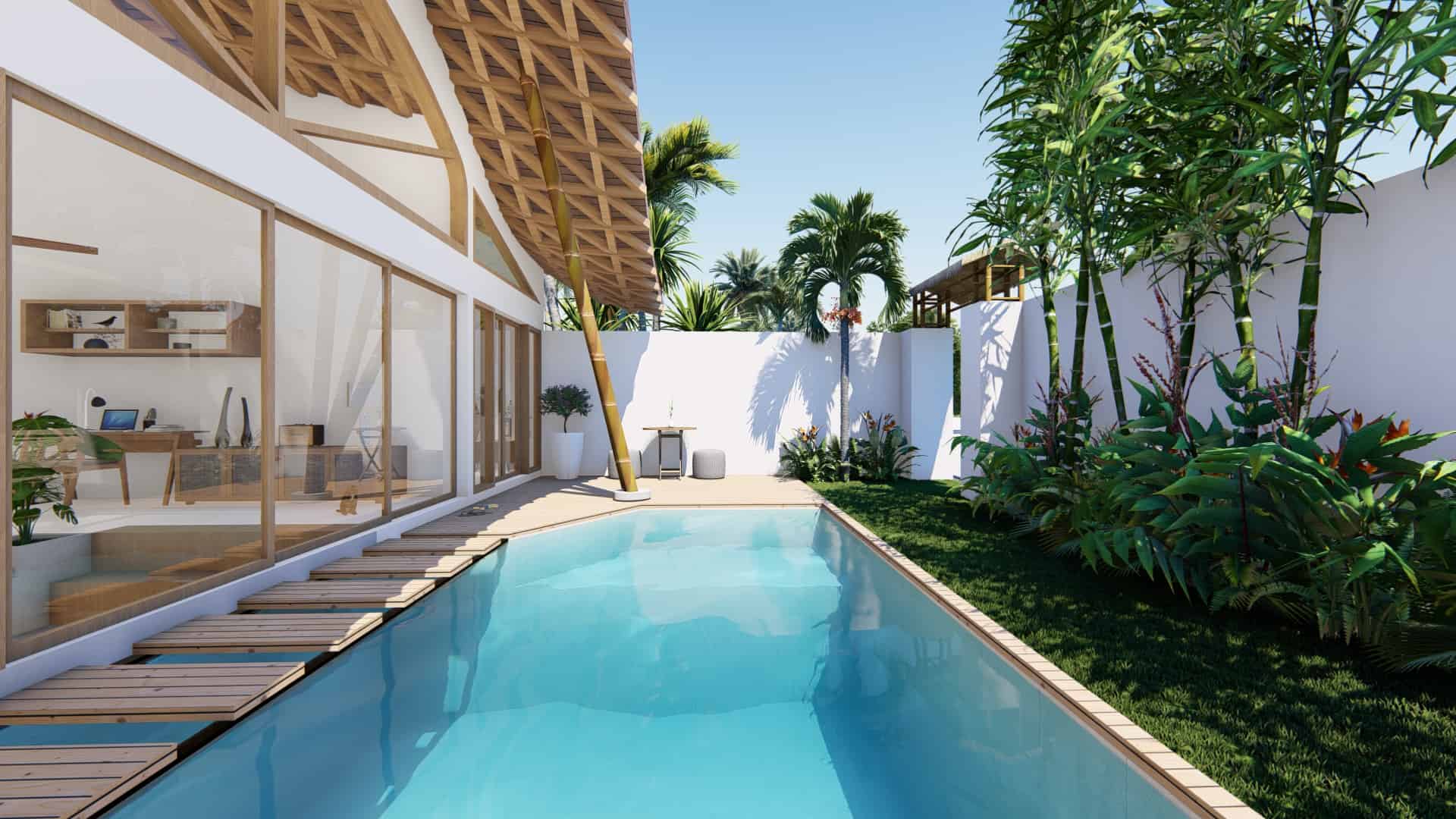 Immerse yourself in the chic allure of Canggu with this trendy tropical bamboo modern villa. The design, characterized by soaring ceilings, introduces a luminous and inviting atmosphere, casting a warm glow throughout the space. Each room strategically frames views of the open expanse, pool, and greenery, fostering a sense of comfort and connection with nature.