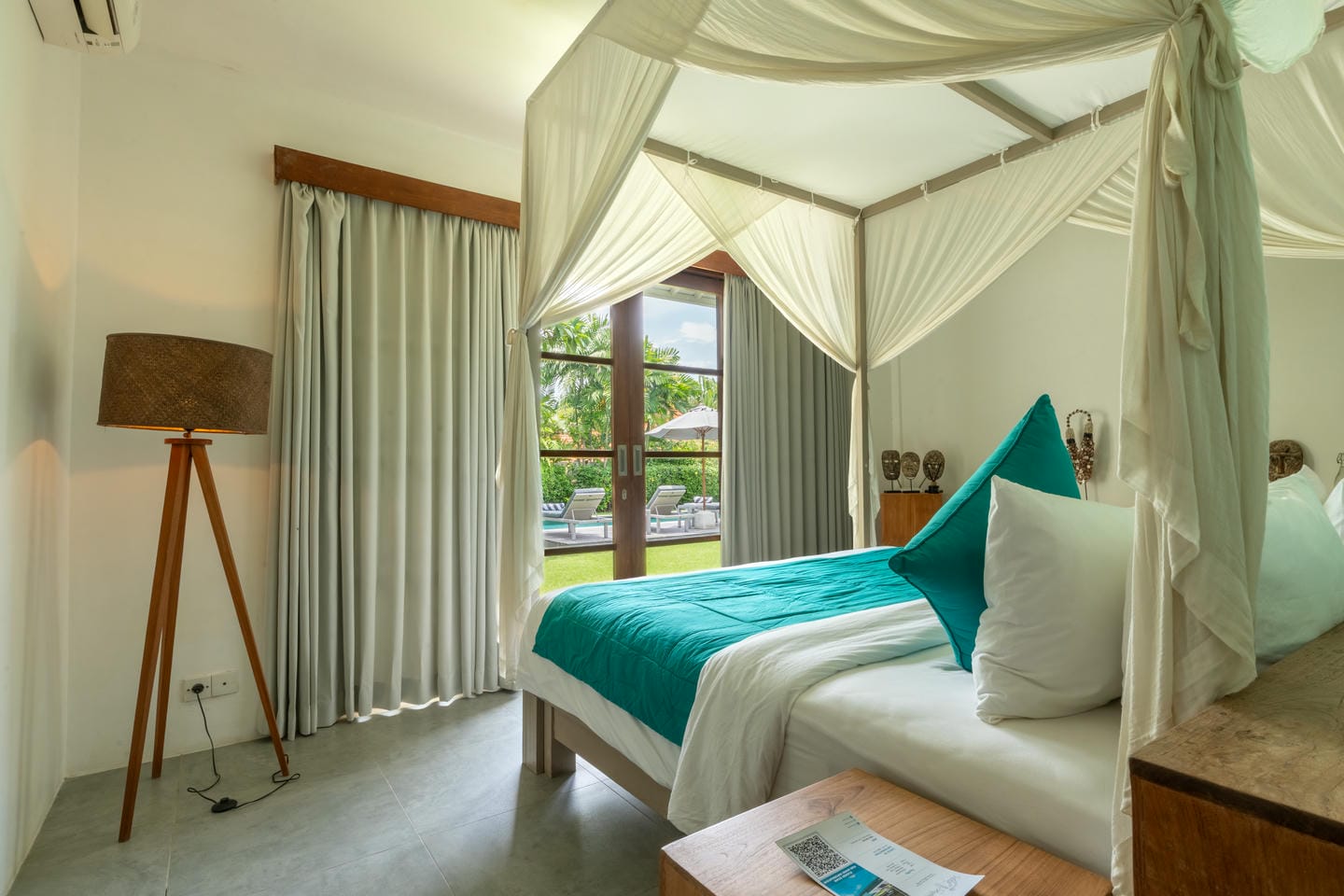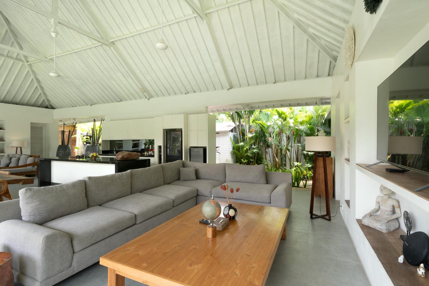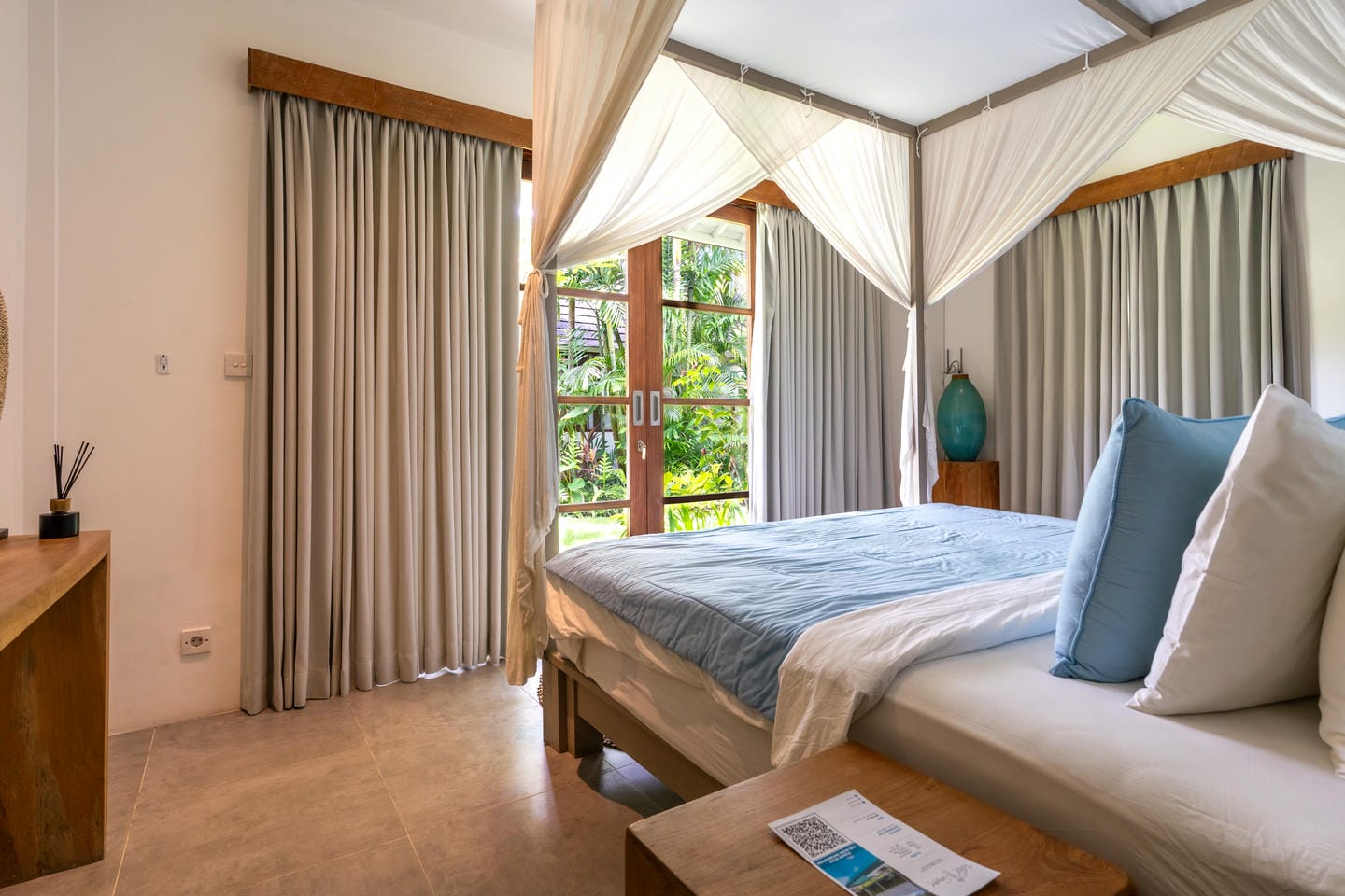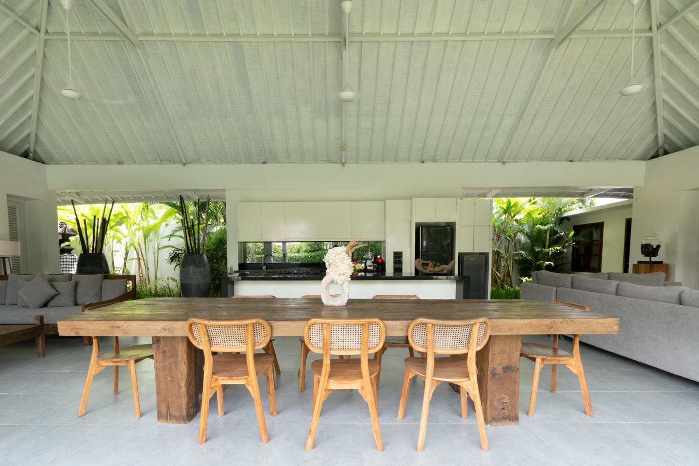 Inside, the villa offers spacious Balinese-inspired living with an open-air kitchen and dining area, fully equipped for convenience and comfort. Each bedroom includes a king-size bed, air conditioning, and mosquito nets, with views of the garden that create a serene, nature-filled ambiance. The design combines openness and warmth, resulting in a relaxed, home-like atmosphere.