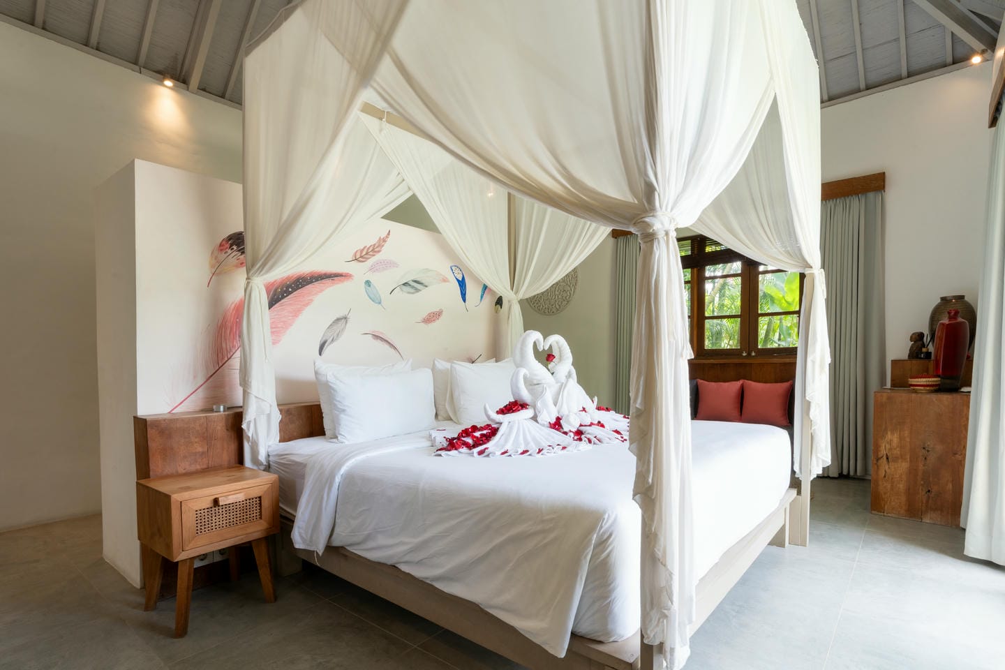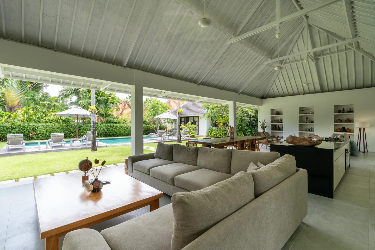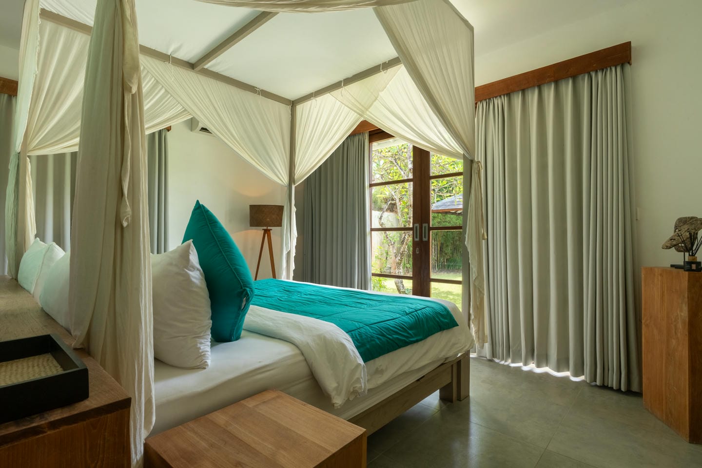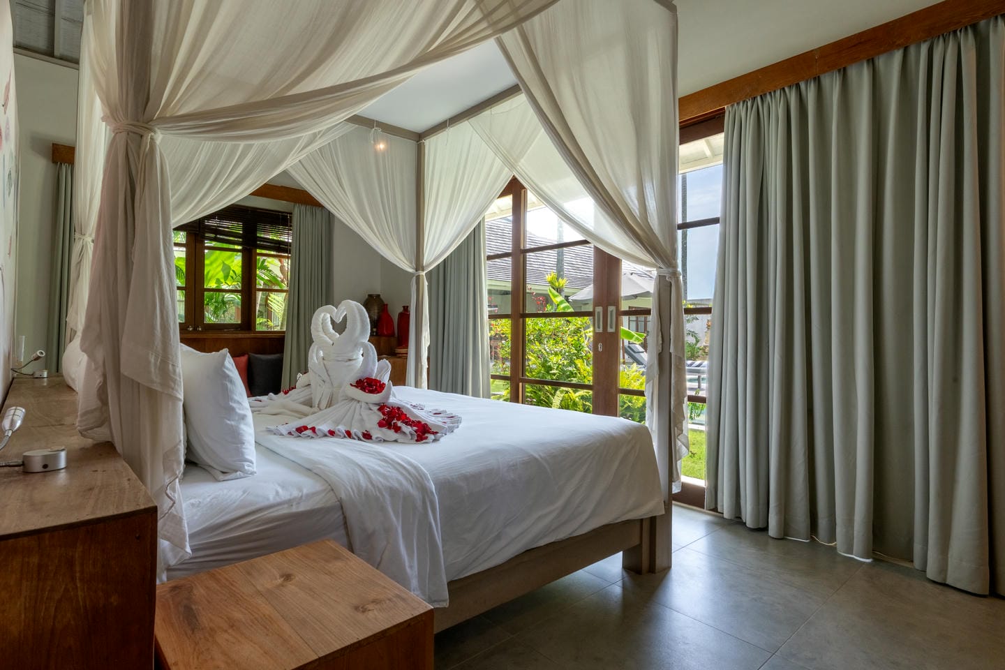 Inside, the villa offers spacious Balinese-inspired living with an open-air kitchen and dining area, fully equipped for convenience and comfort. Each bedroom includes a king-size bed, air conditioning, and mosquito nets, with views of the garden that create a serene, nature-filled ambiance. The design combines openness and warmth, resulting in a relaxed, home-like atmosphere.