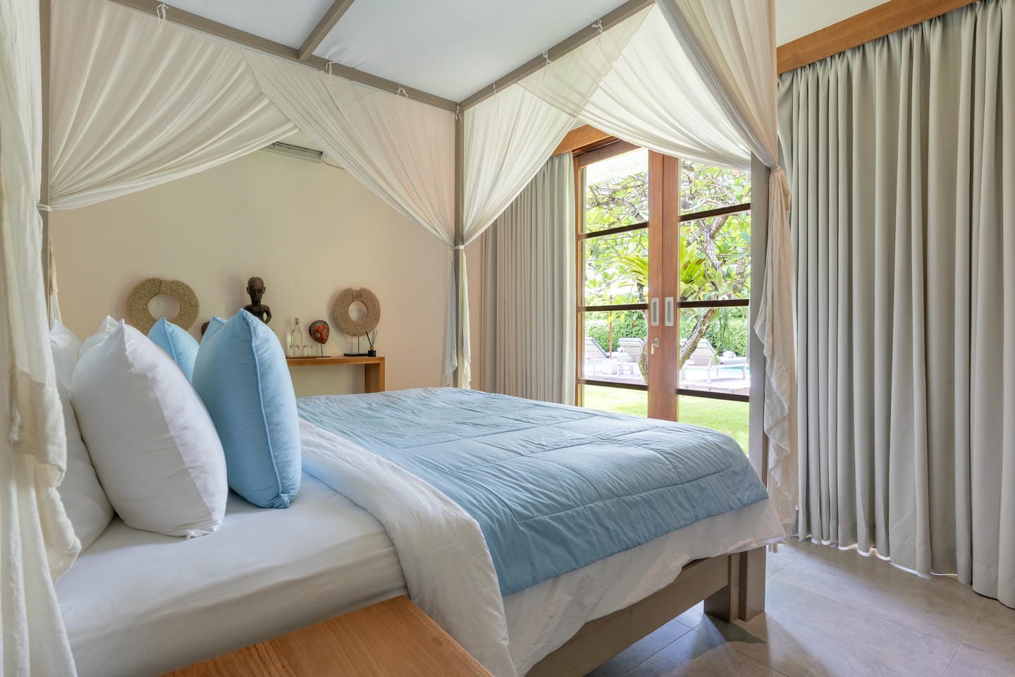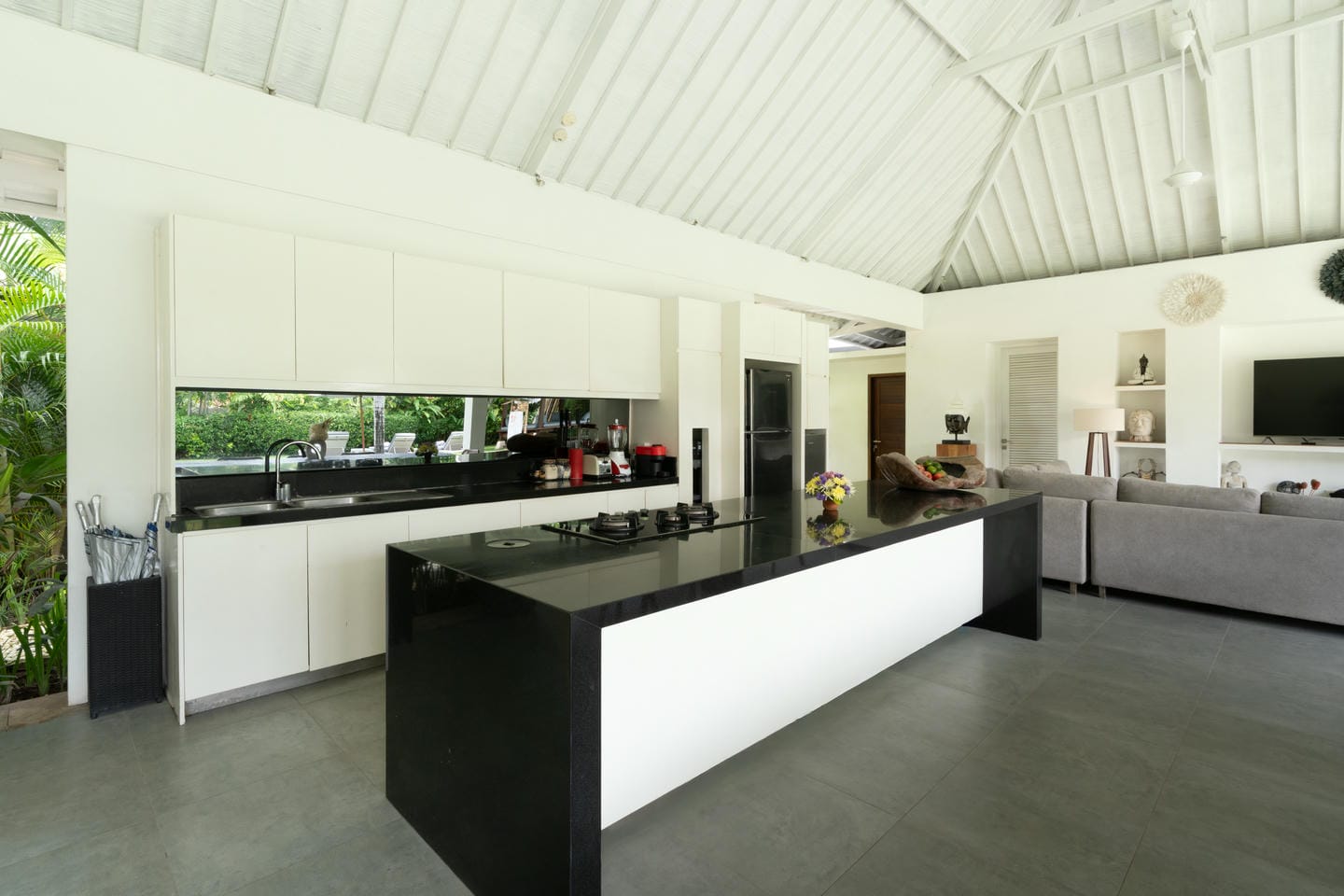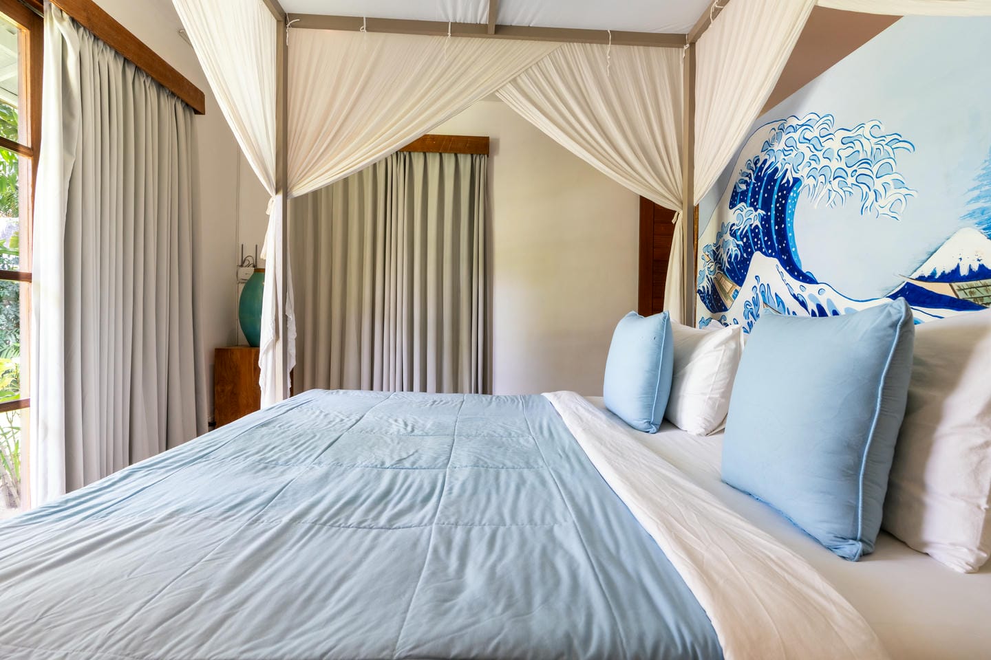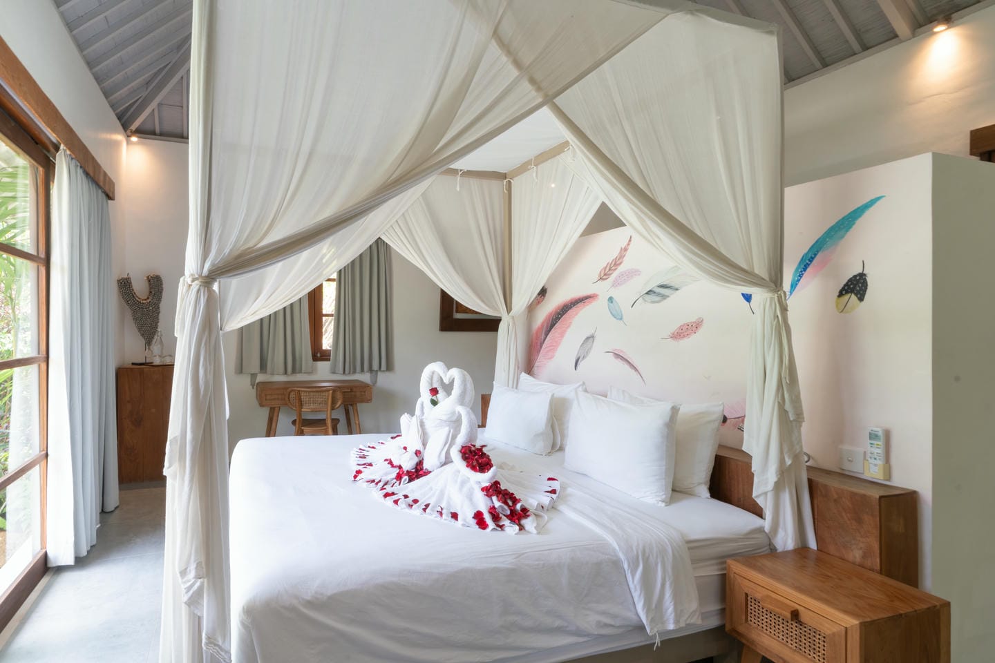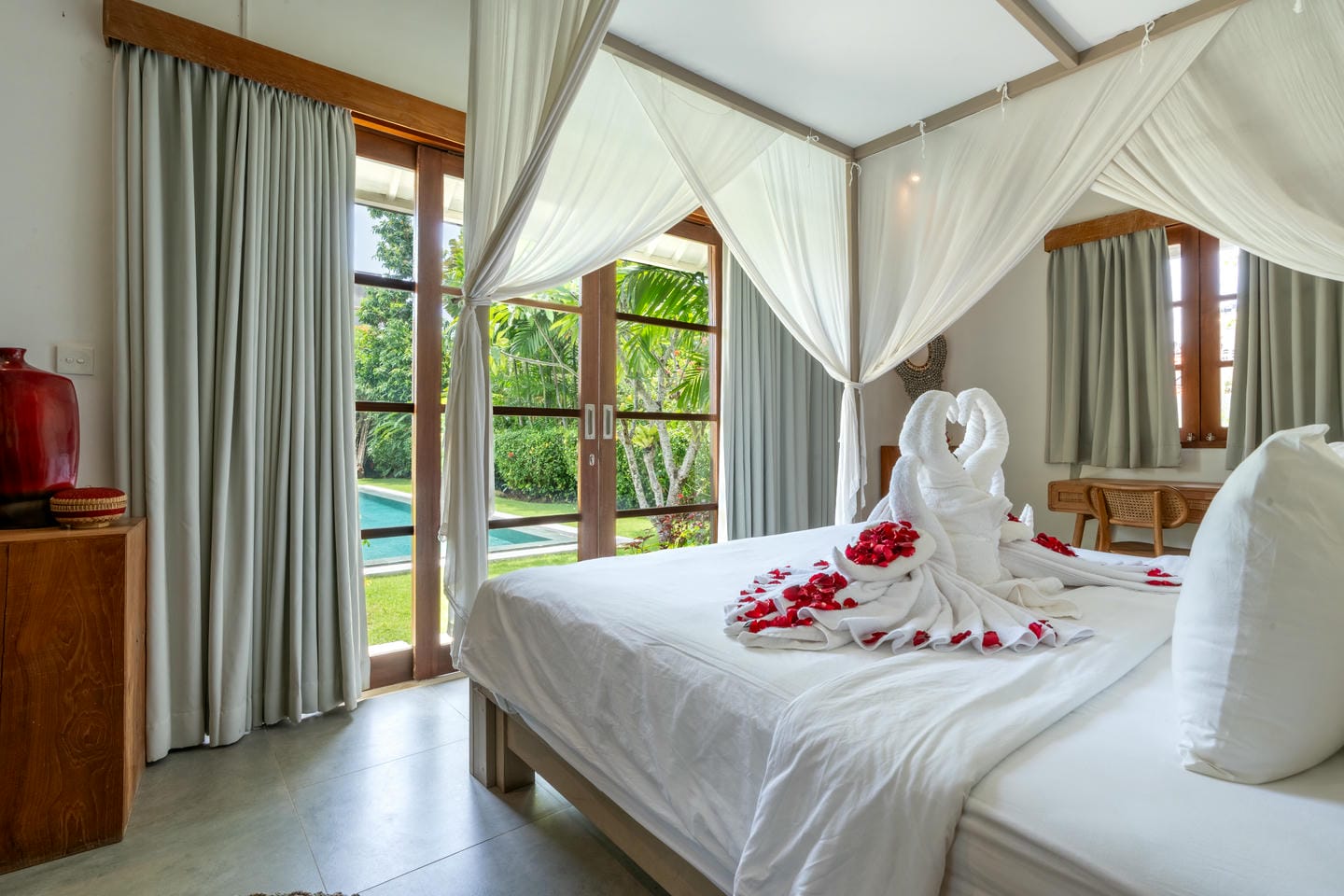 Inside, the villa offers spacious Balinese-inspired living with an open-air kitchen and dining area, fully equipped for convenience and comfort. Each bedroom includes a king-size bed, air conditioning, and mosquito nets, with views of the garden that create a serene, nature-filled ambiance. The design combines openness and warmth, resulting in a relaxed, home-like atmosphere.