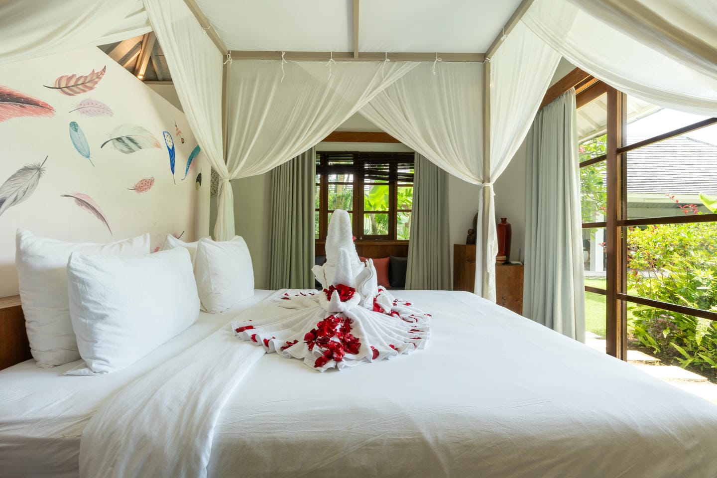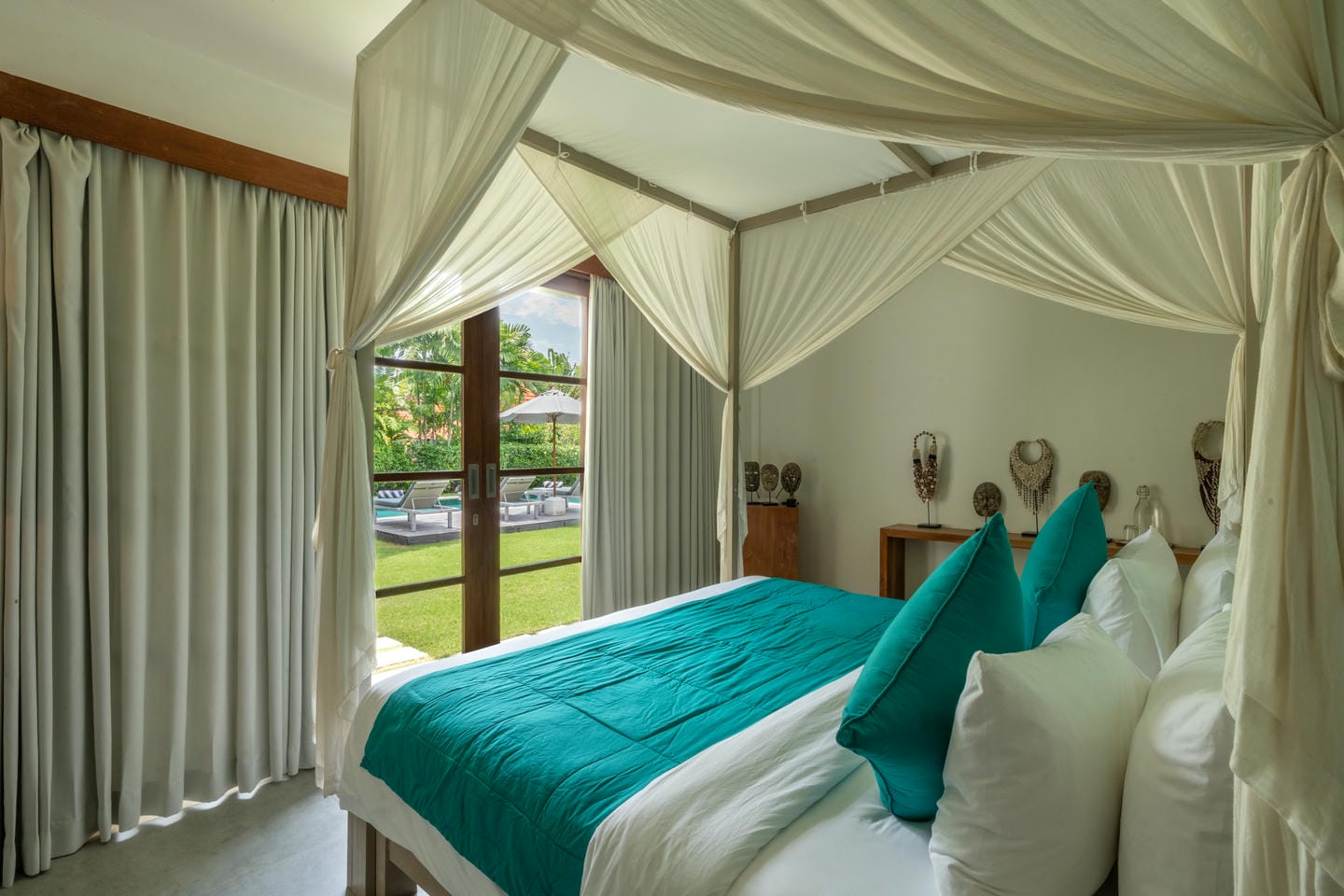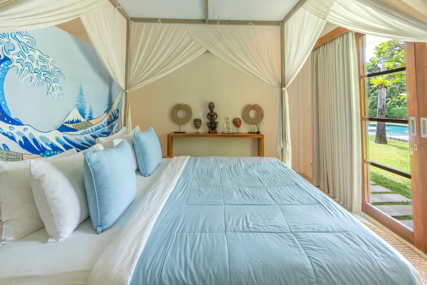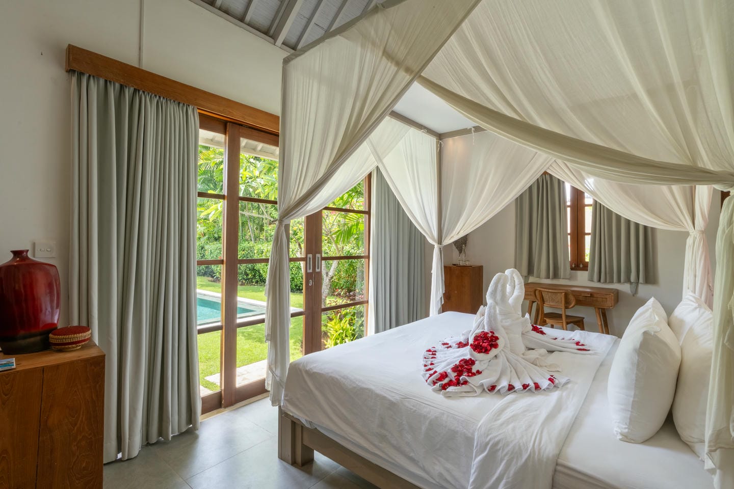 Inside, the villa offers spacious Balinese-inspired living with an open-air kitchen and dining area, fully equipped for convenience and comfort. Each bedroom includes a king-size bed, air conditioning, and mosquito nets, with views of the garden that create a serene, nature-filled ambiance. The design combines openness and warmth, resulting in a relaxed, home-like atmosphere.