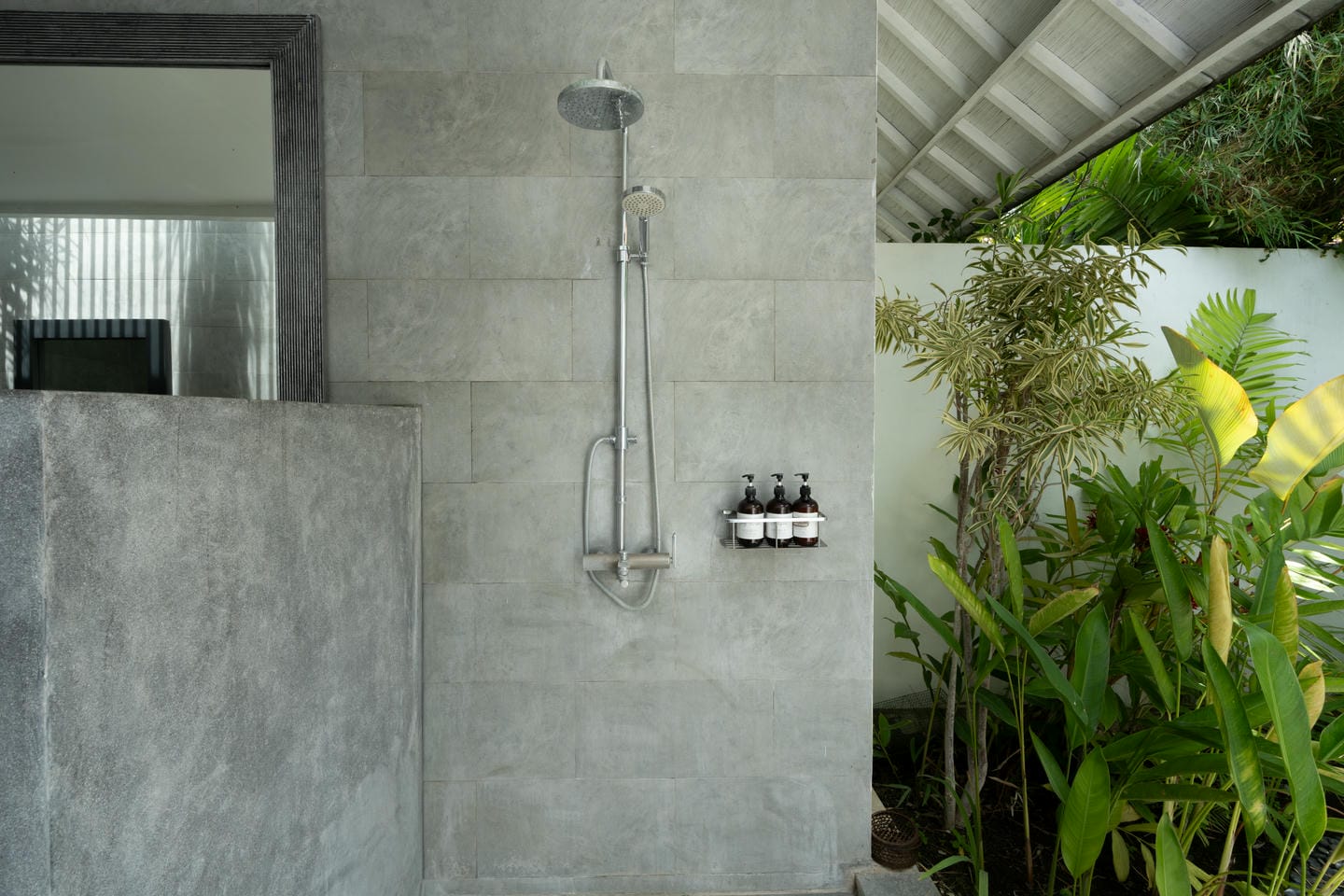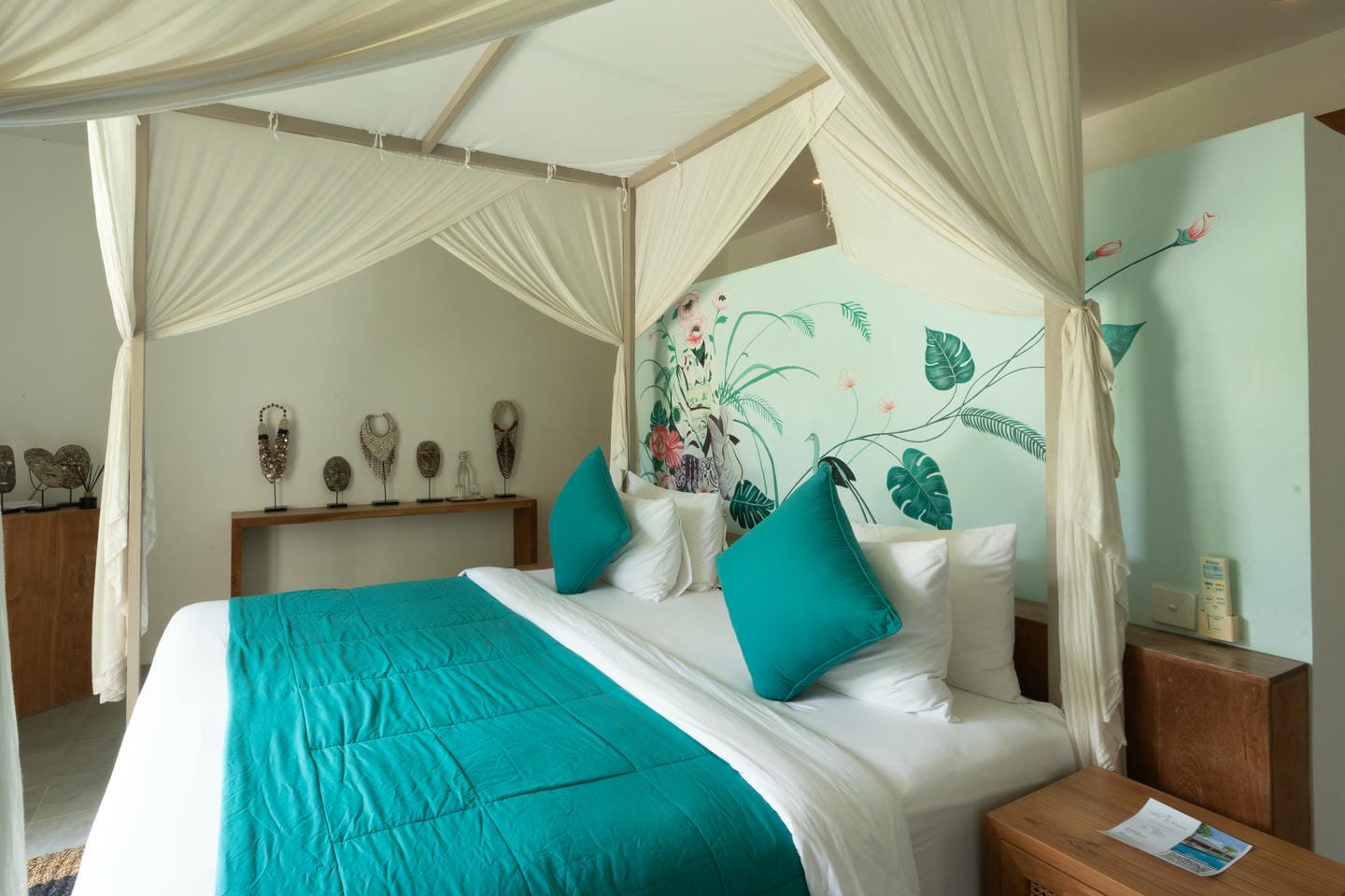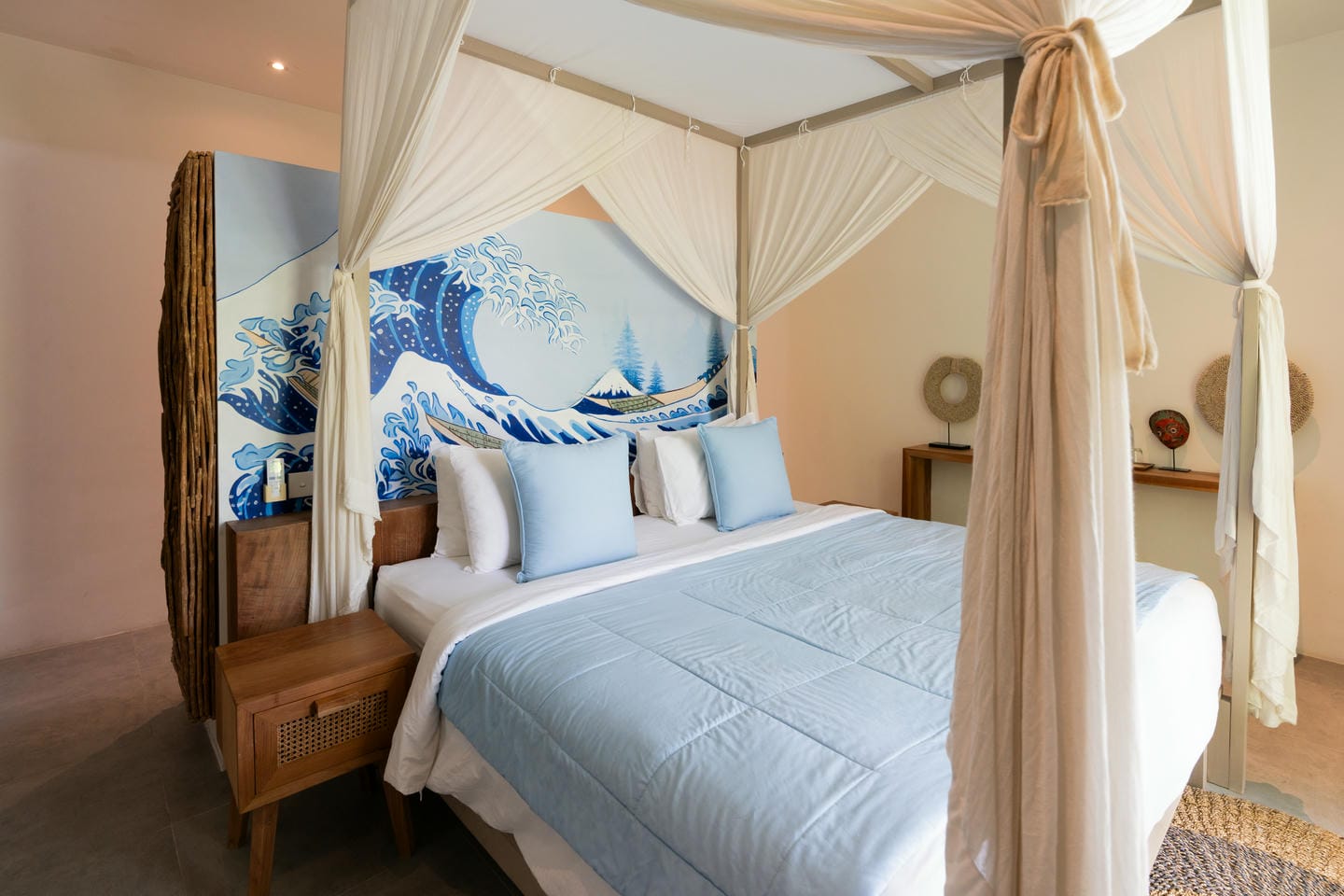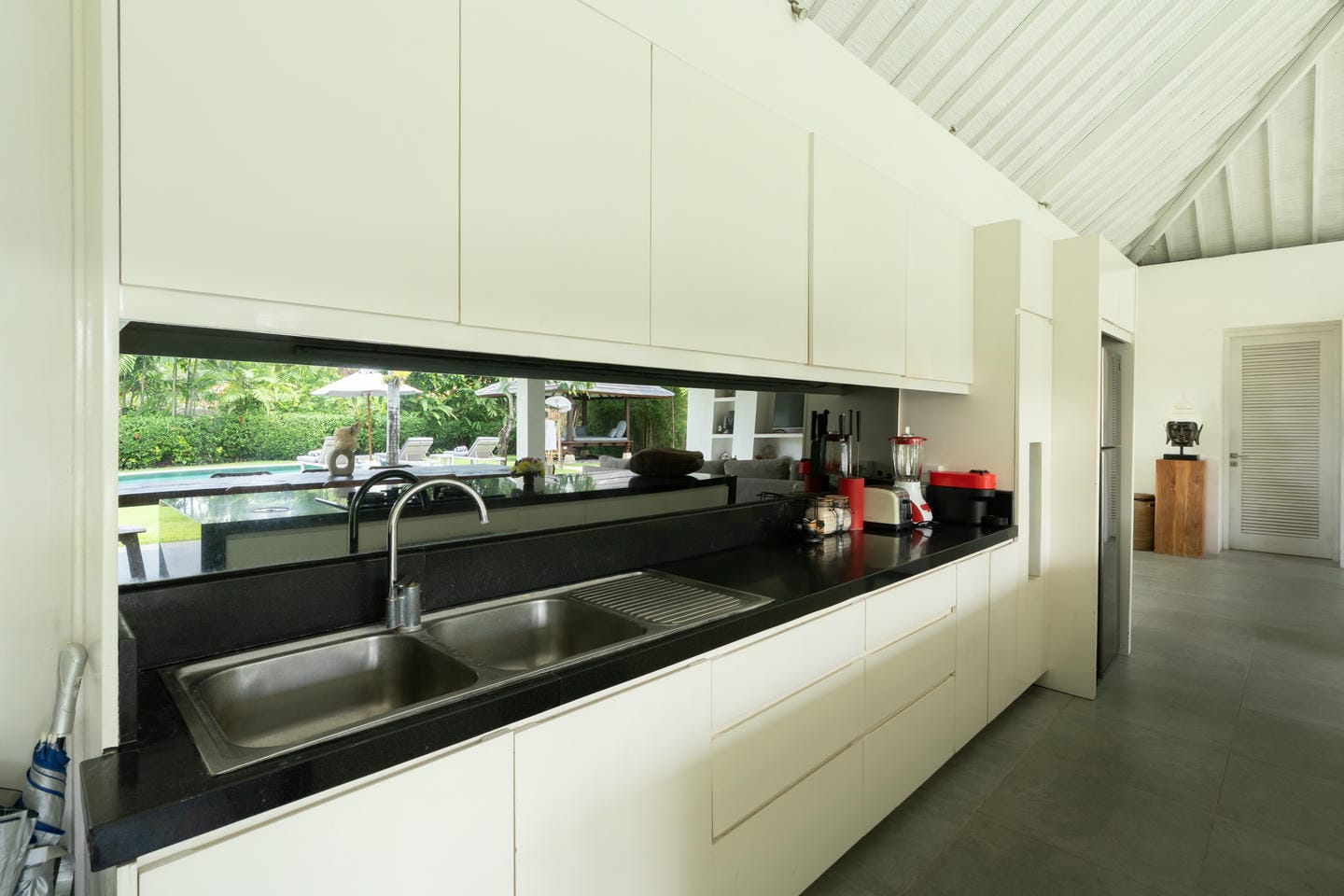 Inside, the villa offers spacious Balinese-inspired living with an open-air kitchen and dining area, fully equipped for convenience and comfort. Each bedroom includes a king-size bed, air conditioning, and mosquito nets, with views of the garden that create a serene, nature-filled ambiance. The design combines openness and warmth, resulting in a relaxed, home-like atmosphere.