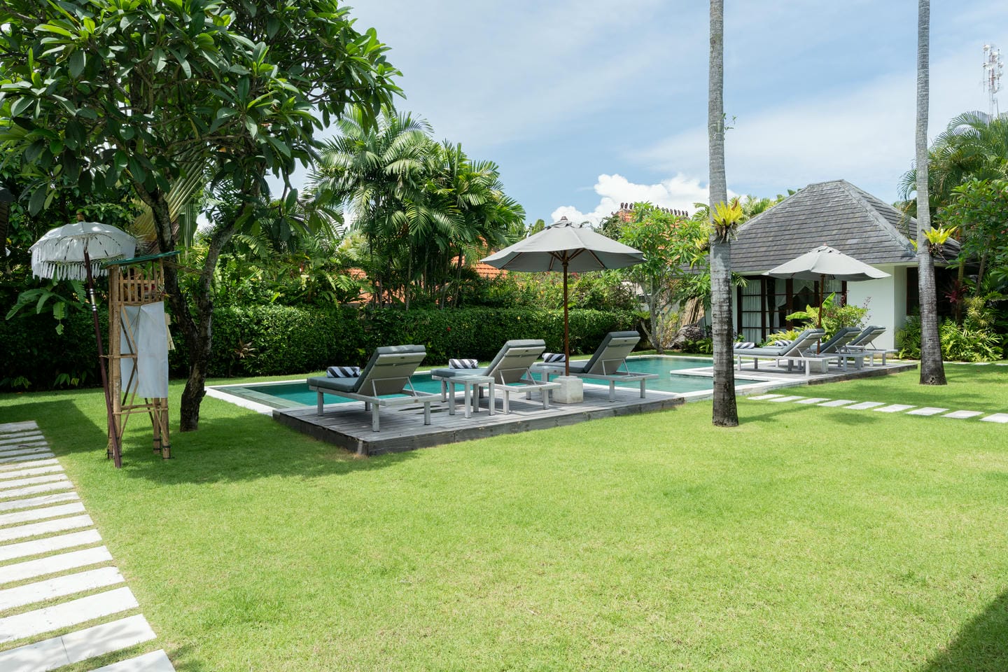 The spacious garden and pool area, along with the outdoor living and dining space, invite a laid-back lifestyle—whether sunbathing, swimming, relaxing in the shade, or enjoying meals surrounded by lush greenery.