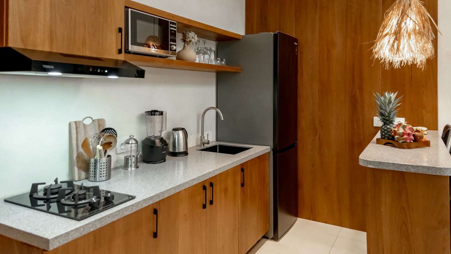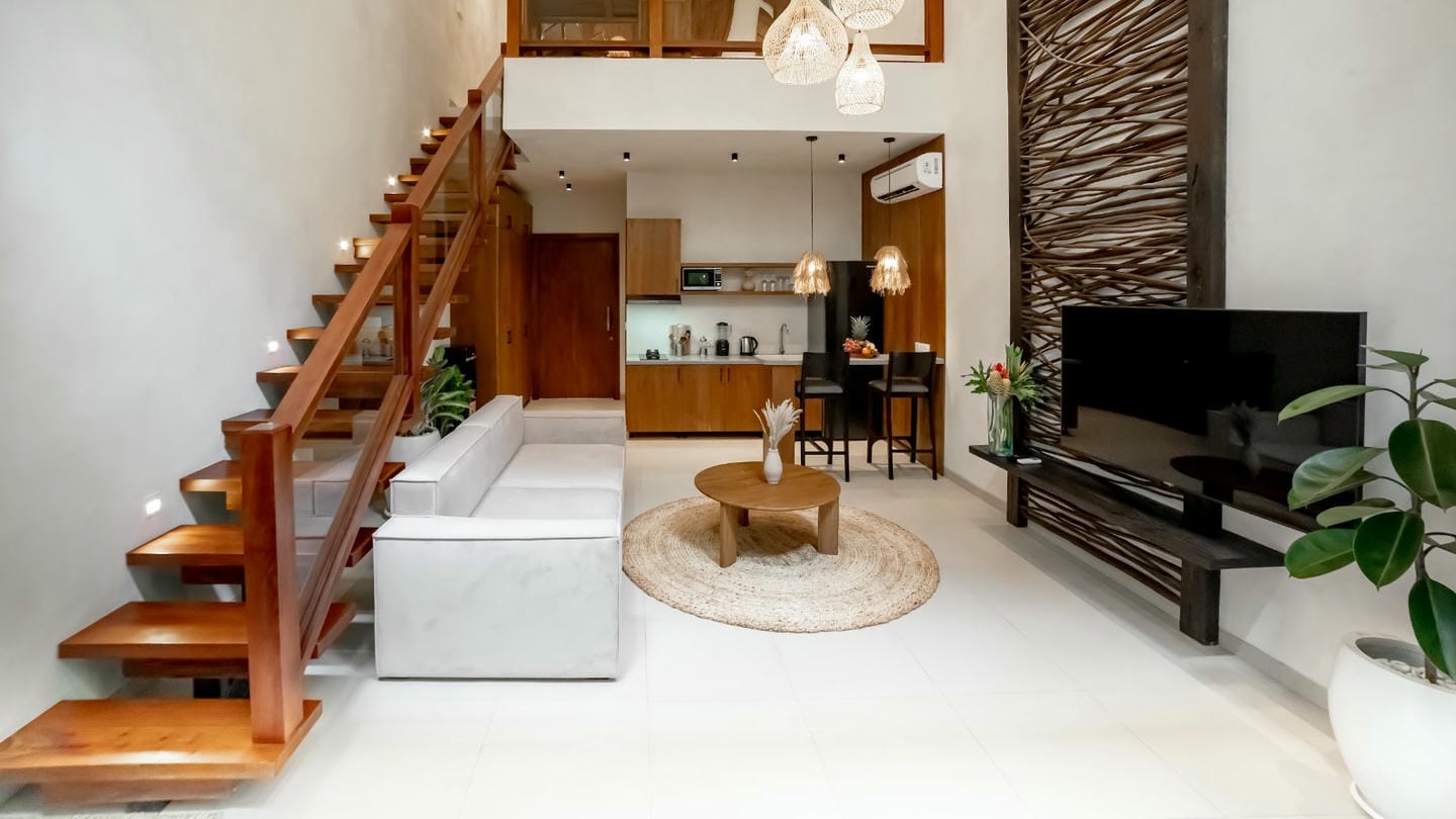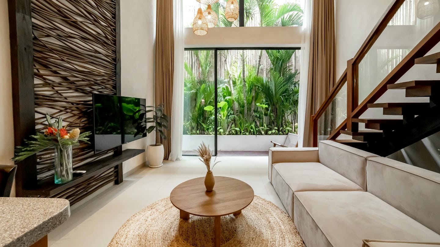 This villa features a refined modern tropical design with warm natural wood accents throughout. The double-height living area and full-height glass doors create a bright, airy ambiance while opening to a lush private garden. The open-plan living, dining, and kitchen area blends comfort and style seamlessly, complemented by a small garden at the back of the villa. The property is completed with one comfortable bedroom and one well-appointed bathroom, making it ideal for both private living and rental investment.