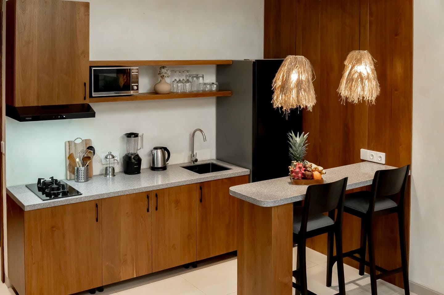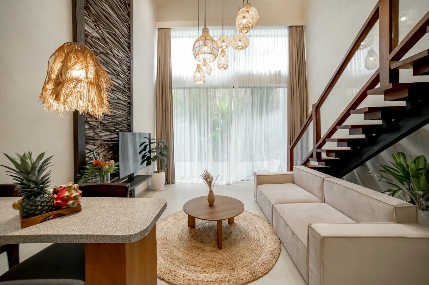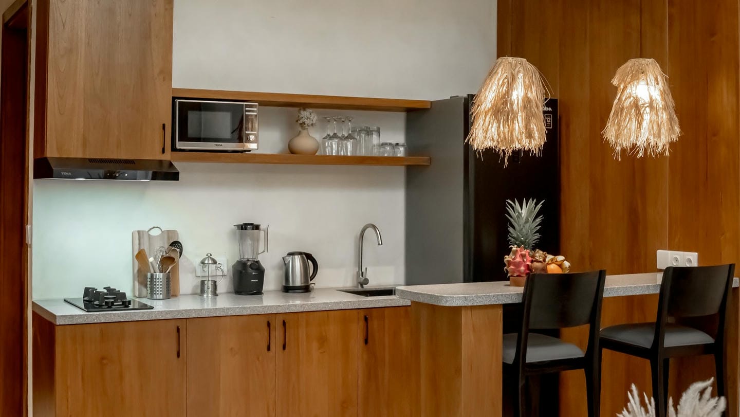 This villa features a refined modern tropical design with warm natural wood accents throughout. The double-height living area and full-height glass doors create a bright, airy ambiance while opening to a lush private garden. The open-plan living, dining, and kitchen area blends comfort and style seamlessly, complemented by a small garden at the back of the villa. The property is completed with one comfortable bedroom and one well-appointed bathroom, making it ideal for both private living and rental investment.