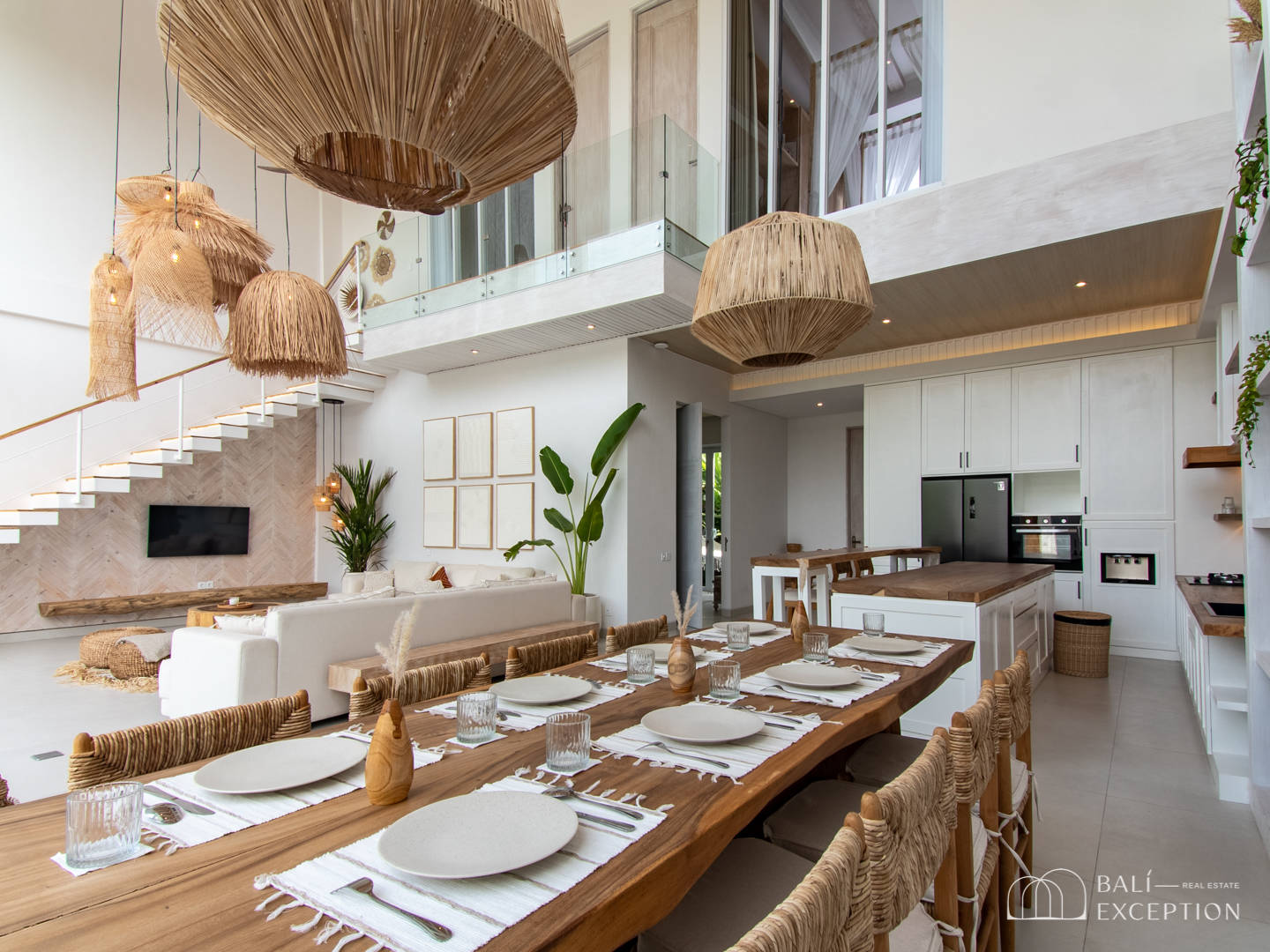 - Living Area: The expansive open living space, with its high ceiling, is thoughtfully divided into three distinct areas: a dining space, a kitchen area, and a cozy living room. Flooded with natural light from large windows, this villa harmoniously blends contemporary living with the stunning beauty of its surroundings.