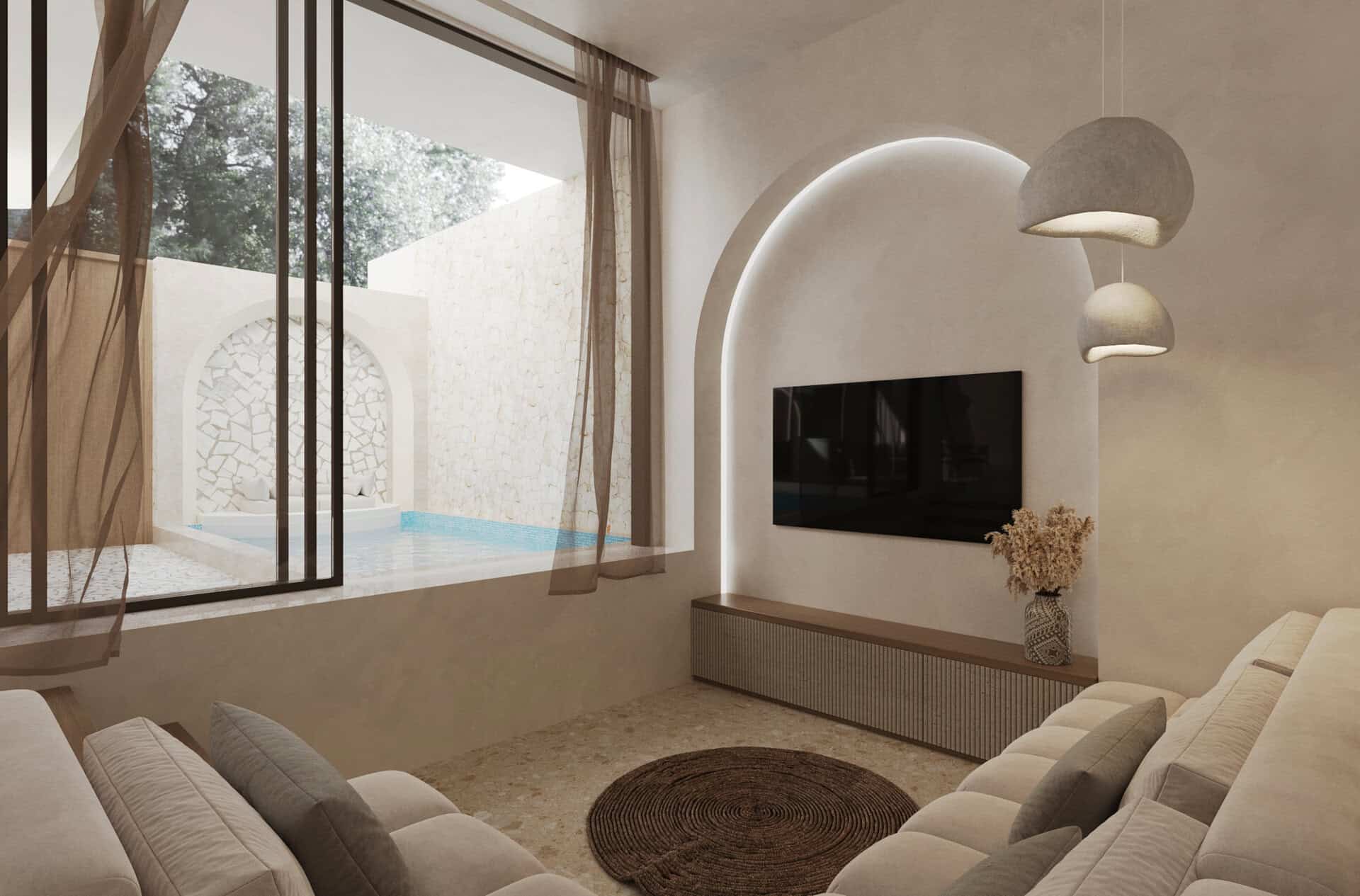 The villa boasts two bedrooms and ensuite bathroom, with two additional guest toilets. Fully furnished and featuring a well-equipped kitchen, the villa’s high ceiling windows enhance the sense of space and light, creating a welcoming atmosphere, includes a unique sunken living room.