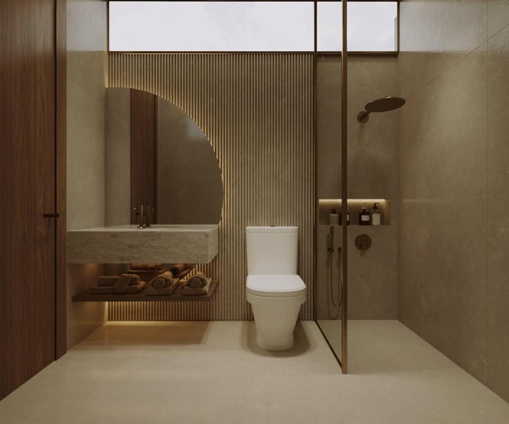 This villa features two swimming pools—one on the ground floor and another on the rooftop, providing stunning views and a refreshing retreat.