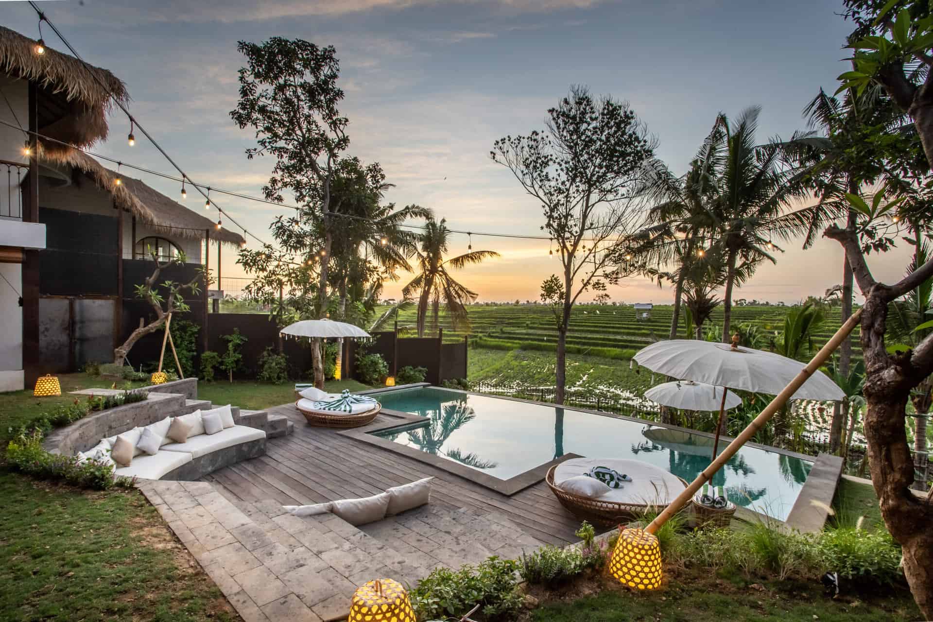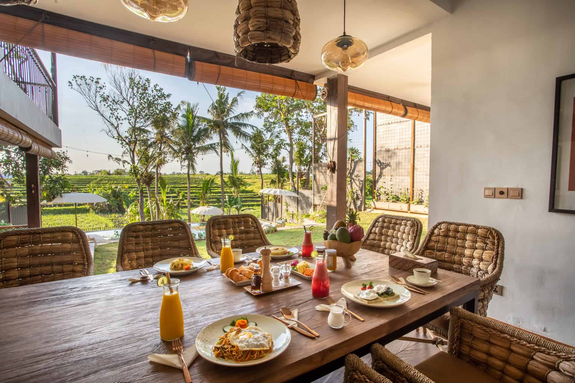This stunning 6-bedroom villa in Canggu offers captivating rice paddy views and is just a 3-minute drive from the vibrant Batu Bolong center.