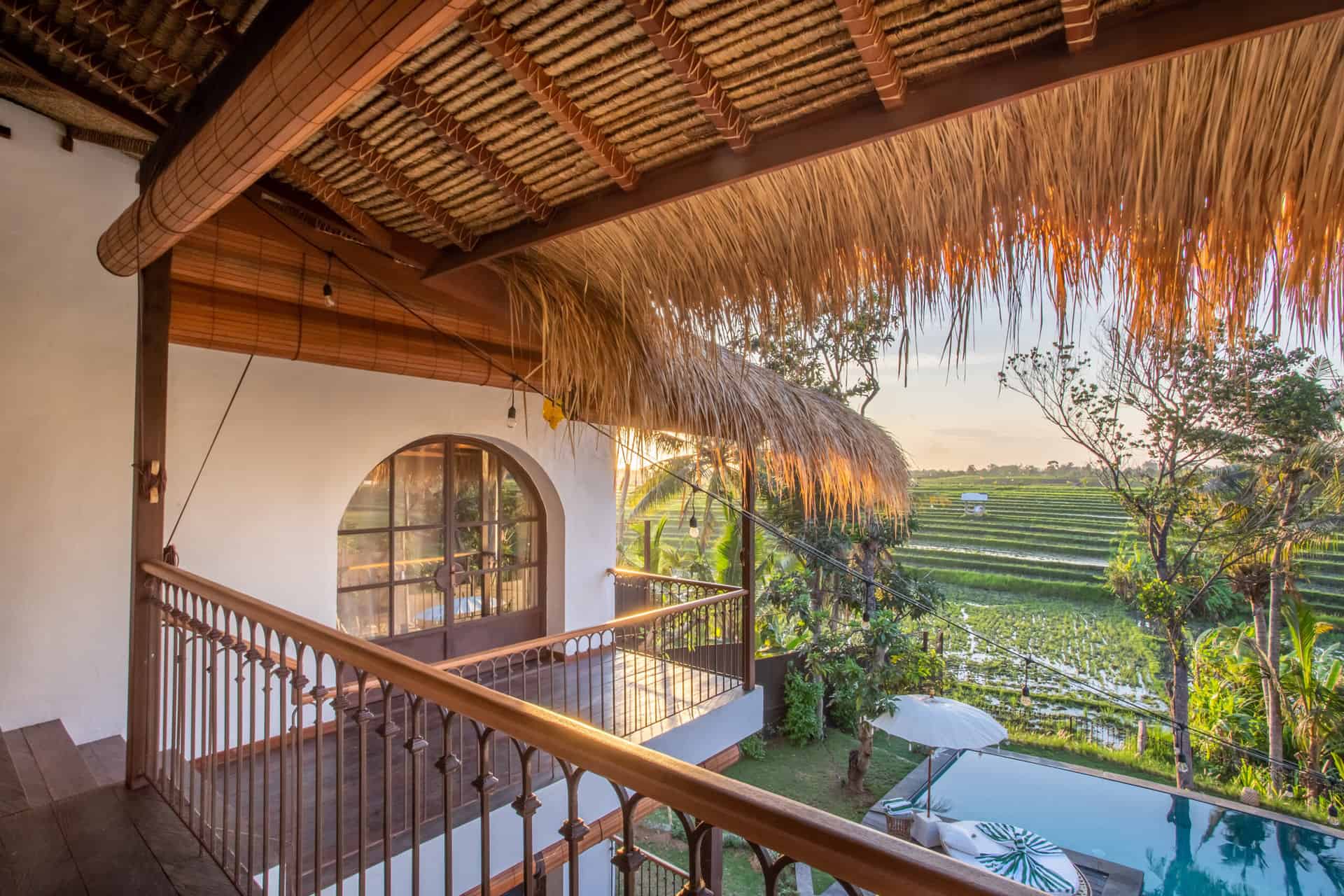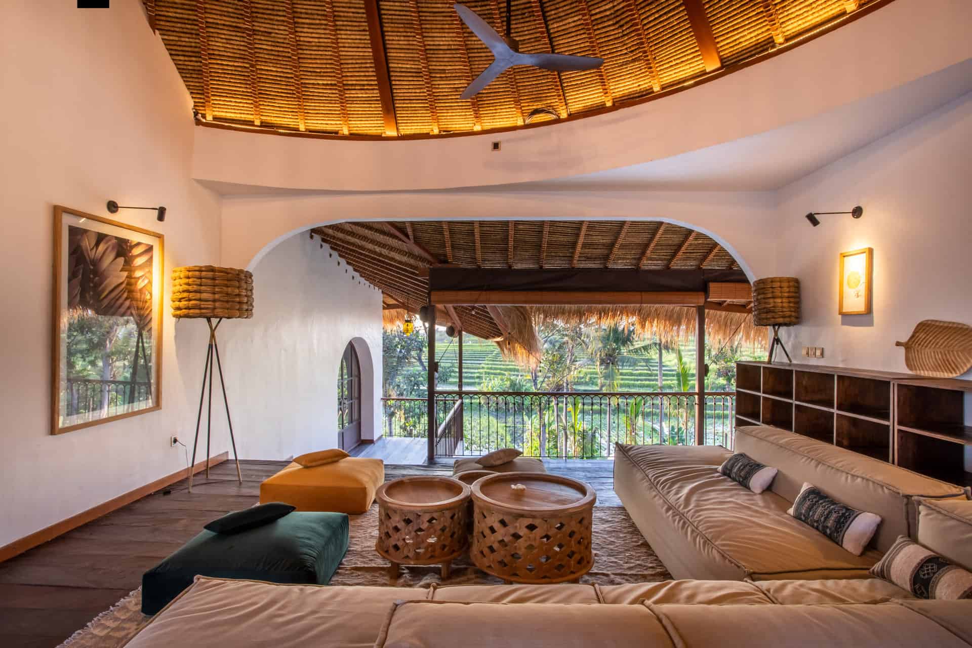 Inside, European elegance meets Balinese charm. Curved glass doors open to a modern kitchen with a teak island, leading into a bohemian-inspired dining area. The spacious living room upstairs features soaring ceilings and a panoramic balcony.