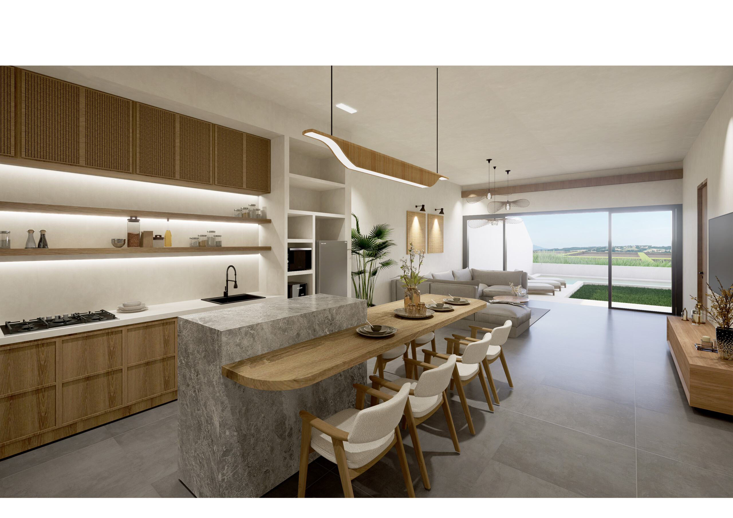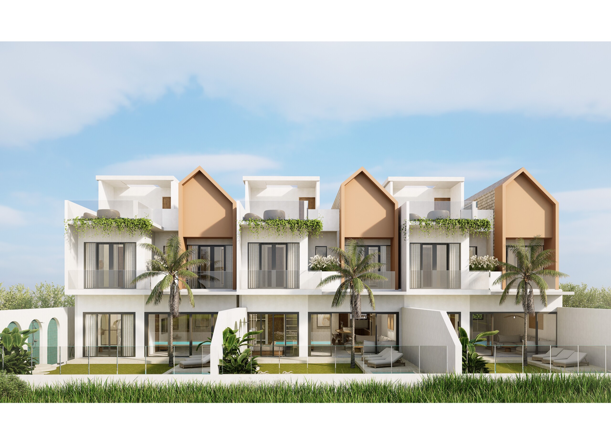 With a contemporary tropical style, on a 250 sqm land each, the 3 units villas offer a cozy living room and dining area and four spacious bedrooms and ensuite bathrooms. From upstairs, each room boasts large windows, allowing for breathtaking ocean and ricefields views.